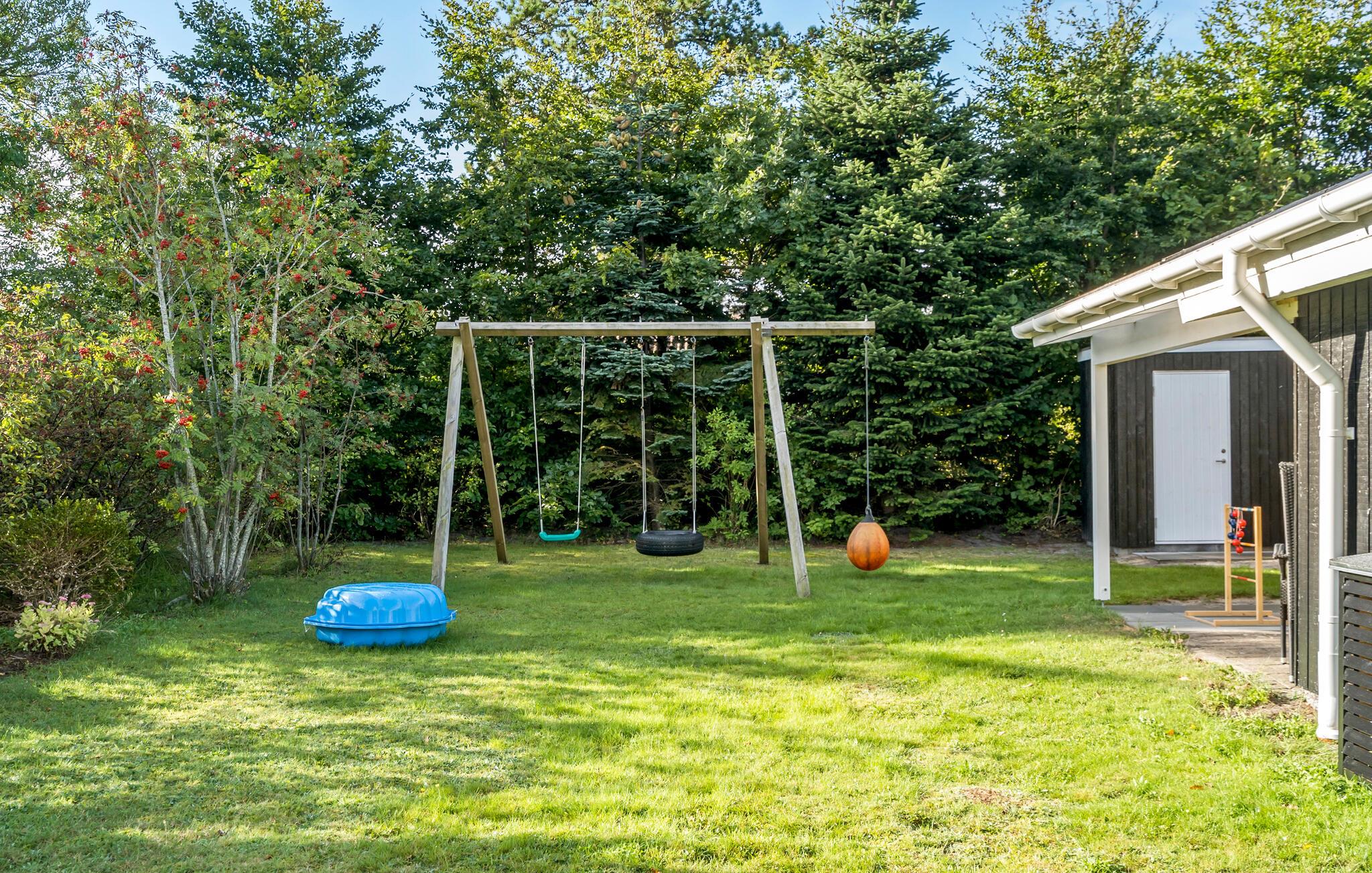 For børnene er der masser af plads og gode legeredskaber at boltre sig med i haven.