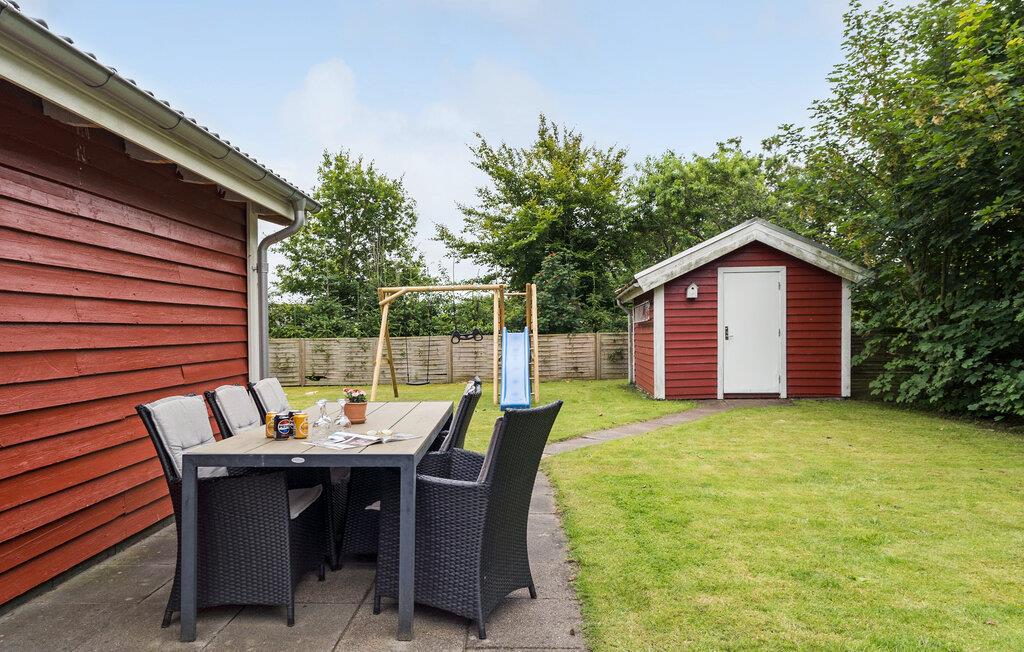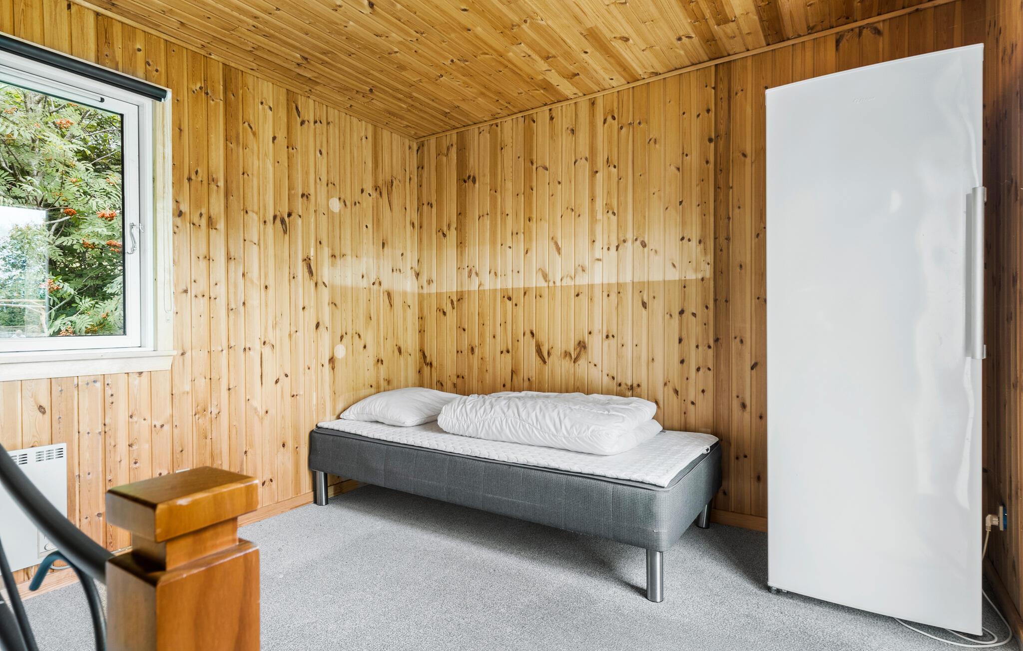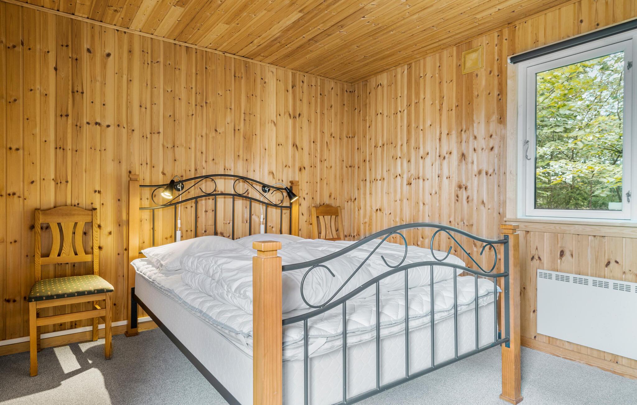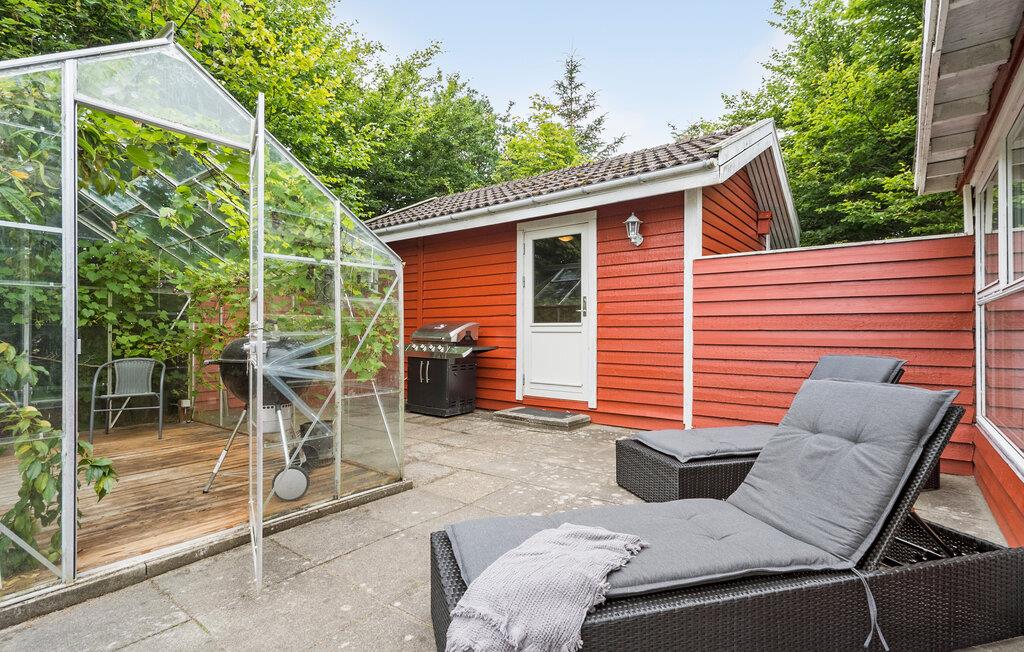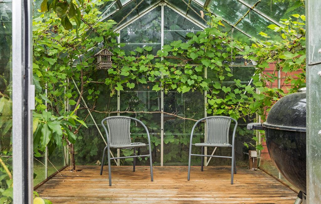 Glæd jer til at holde ferie i dette skønne sommerhus med en hyggelig indretning. Træd ned i stuen, som emmer af charme med træbeklædte lofter og vægge og brændeovn i hjørnet. De store vinduespartier lukker en masse lys ind, og giver en skøn udsigt til haven og det flotte drivhus på terrassen. Her kan I sætte jer ind og nyde drivhusplanterne og roen. I haven er der plads til leg for børnene og et spiseområde til at nyde aftensmaden i det fri.
