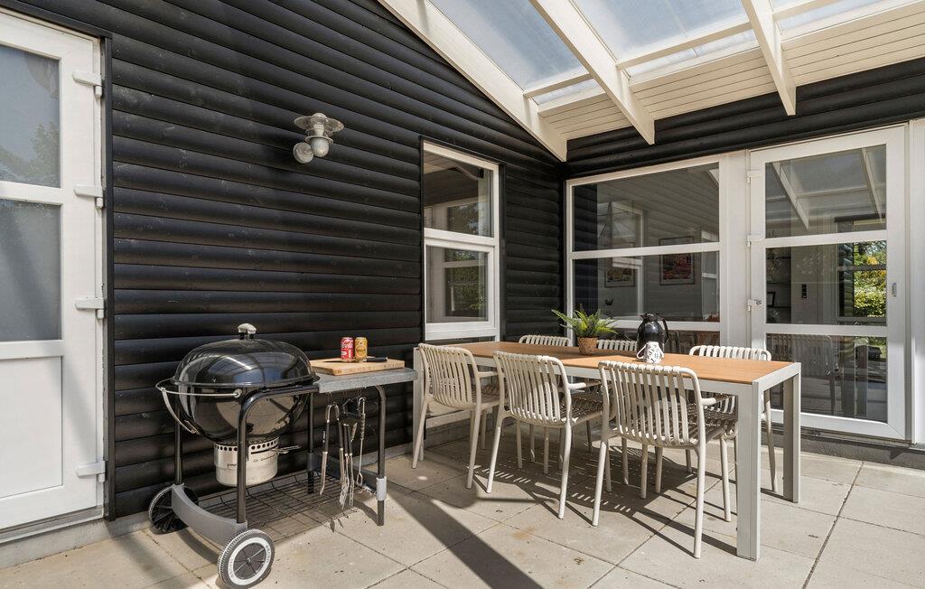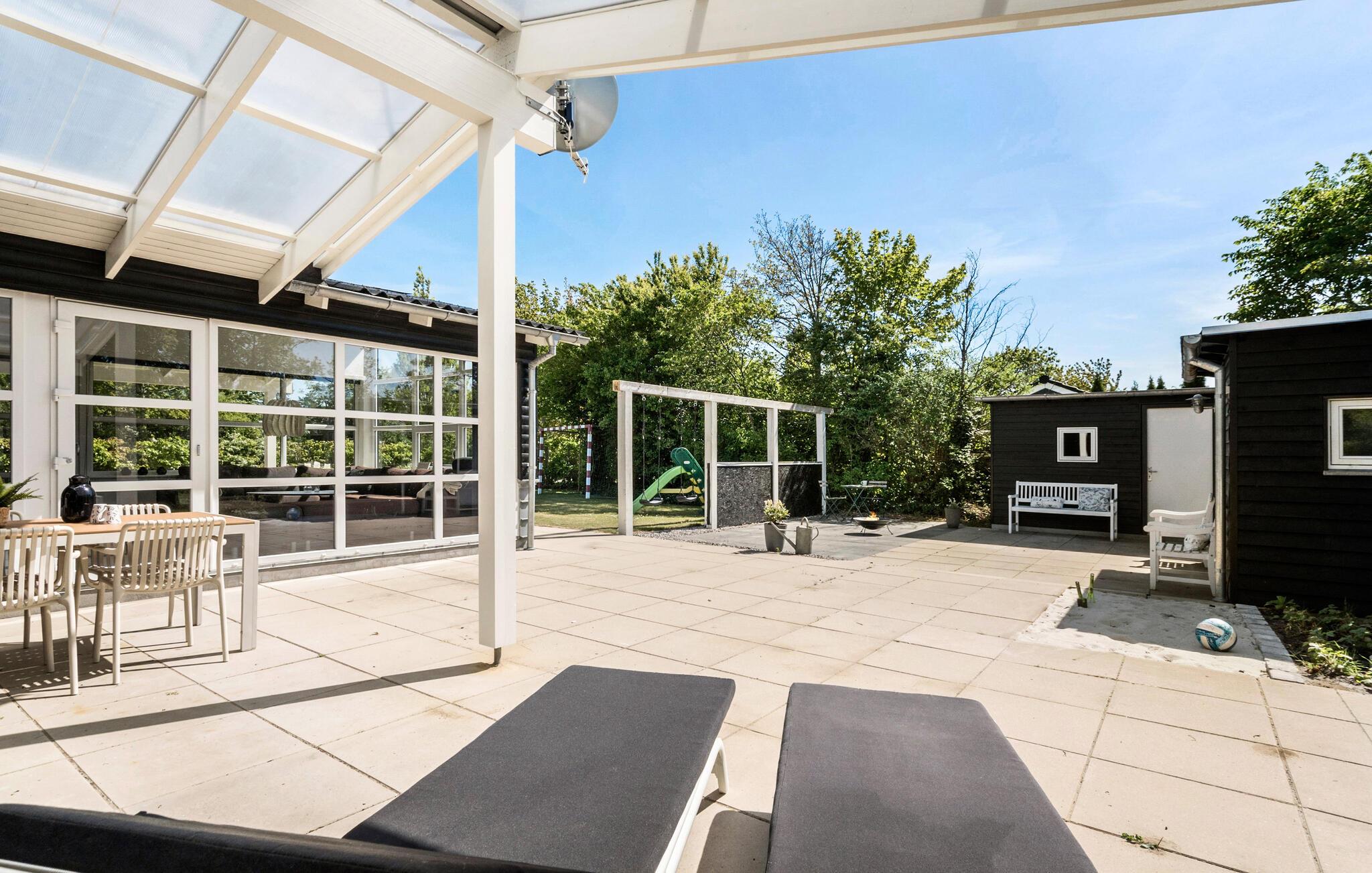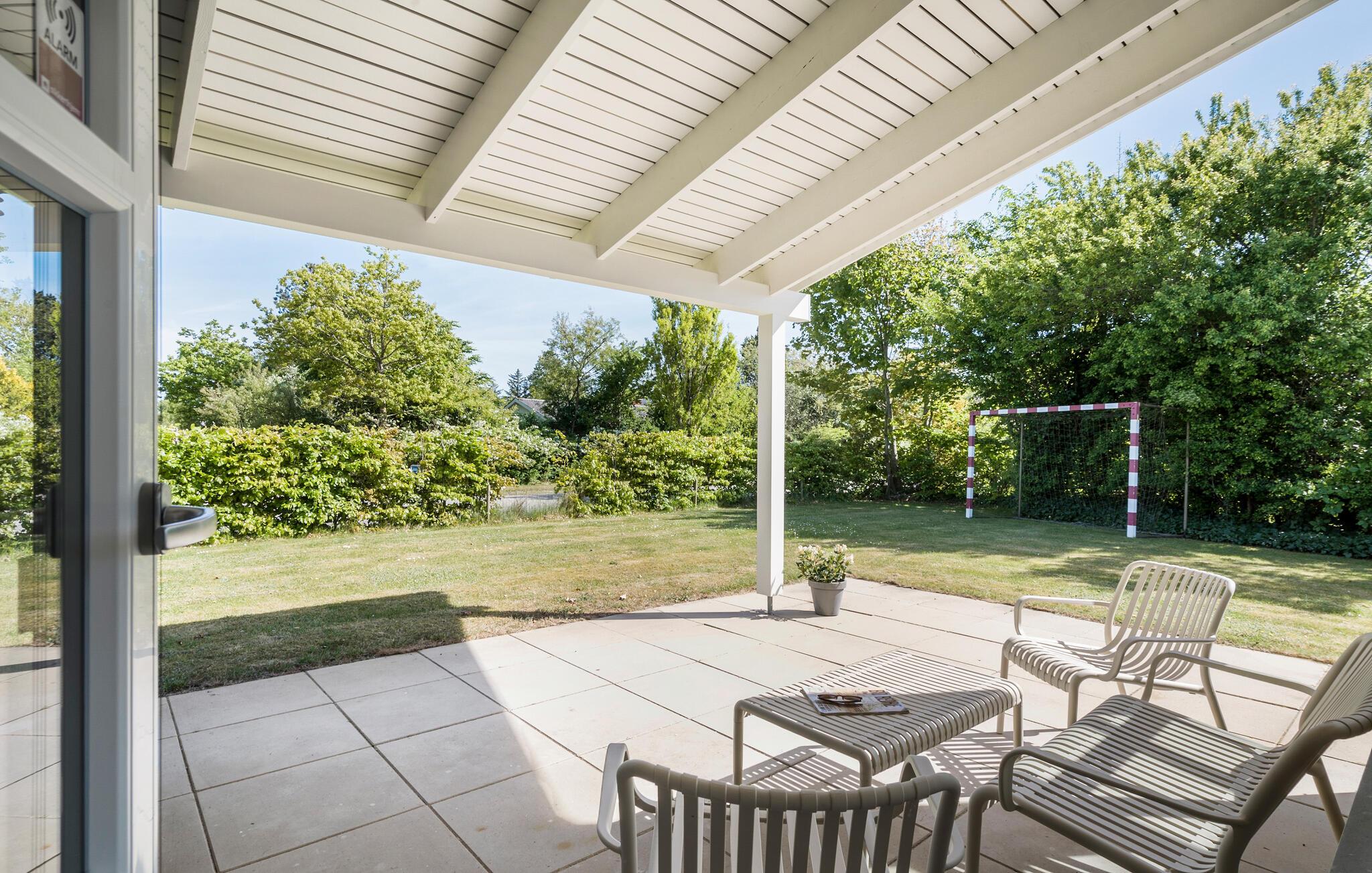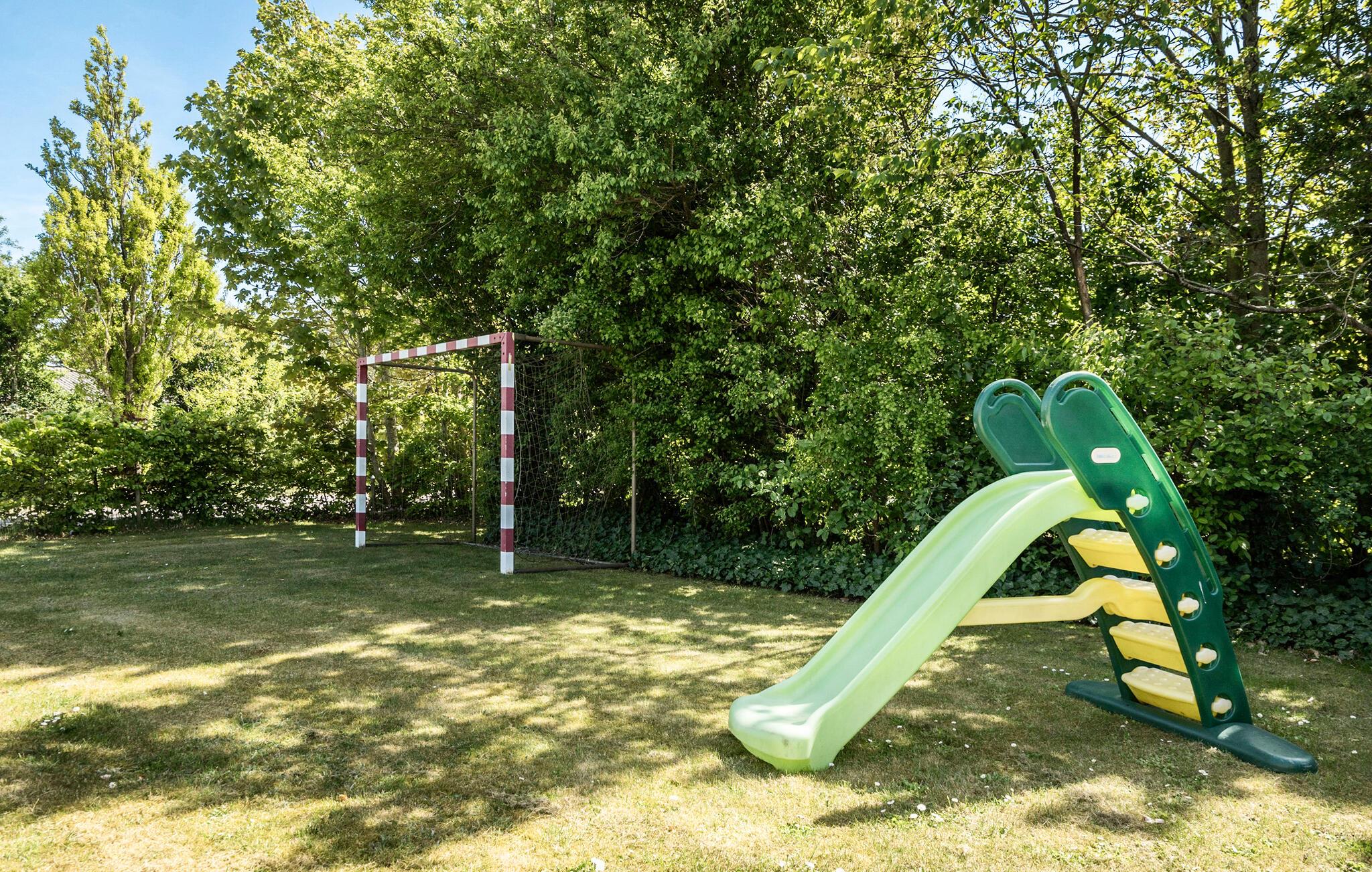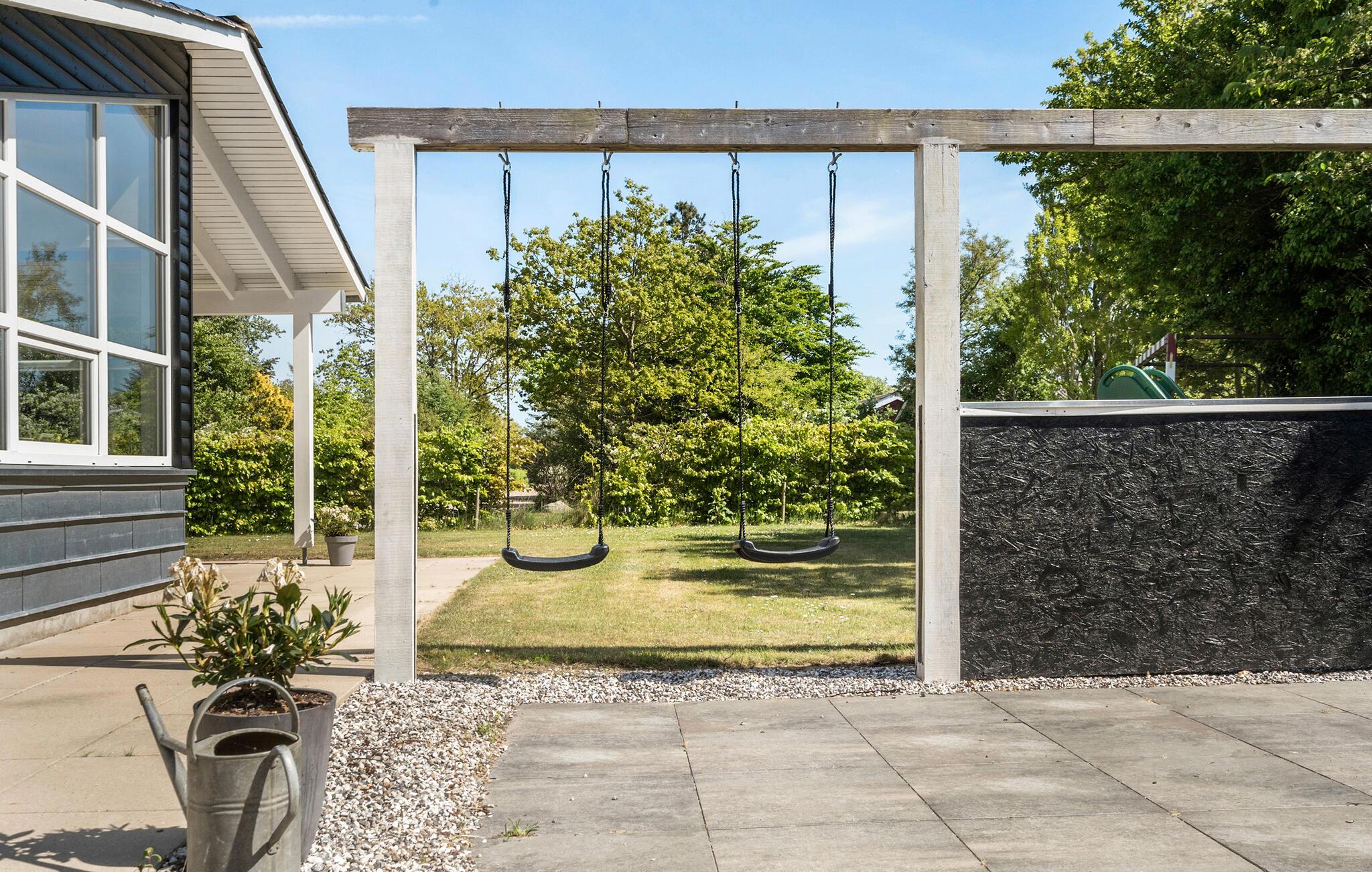 Tilbring solrige timer på den store terrasse, som er udstyret med komfortable siddepladser. Nyd måltiderne udendørs eller læn jer tilbage og nyd freden og roen. Der er god plads til leg og udendørsspil - måske en omgang håndbold for hele familien? Der er både håndboldmål samt gynger og rutsjebane, så der er gode muligheder for at have det sjovt udendørs uanset alder.