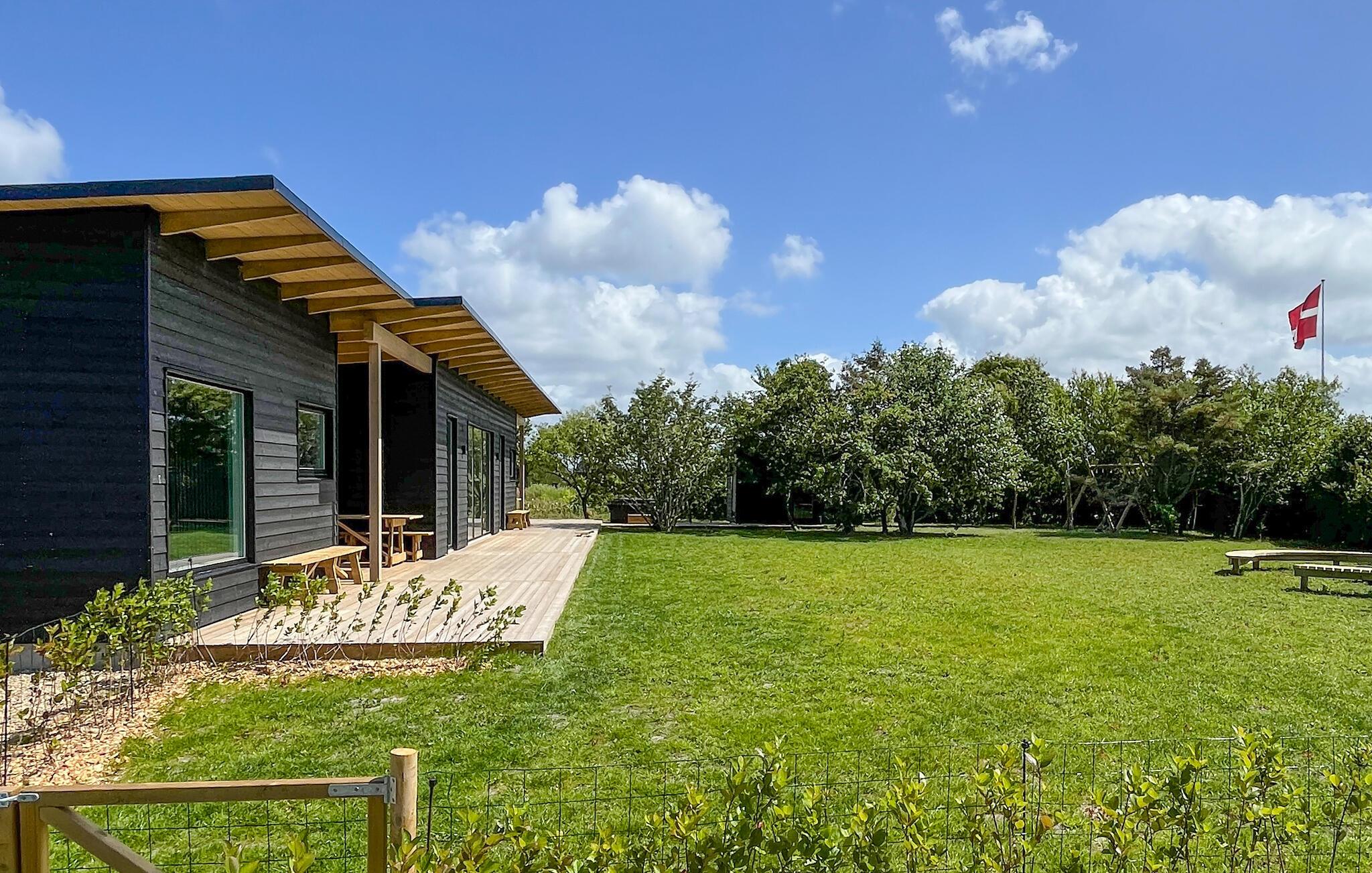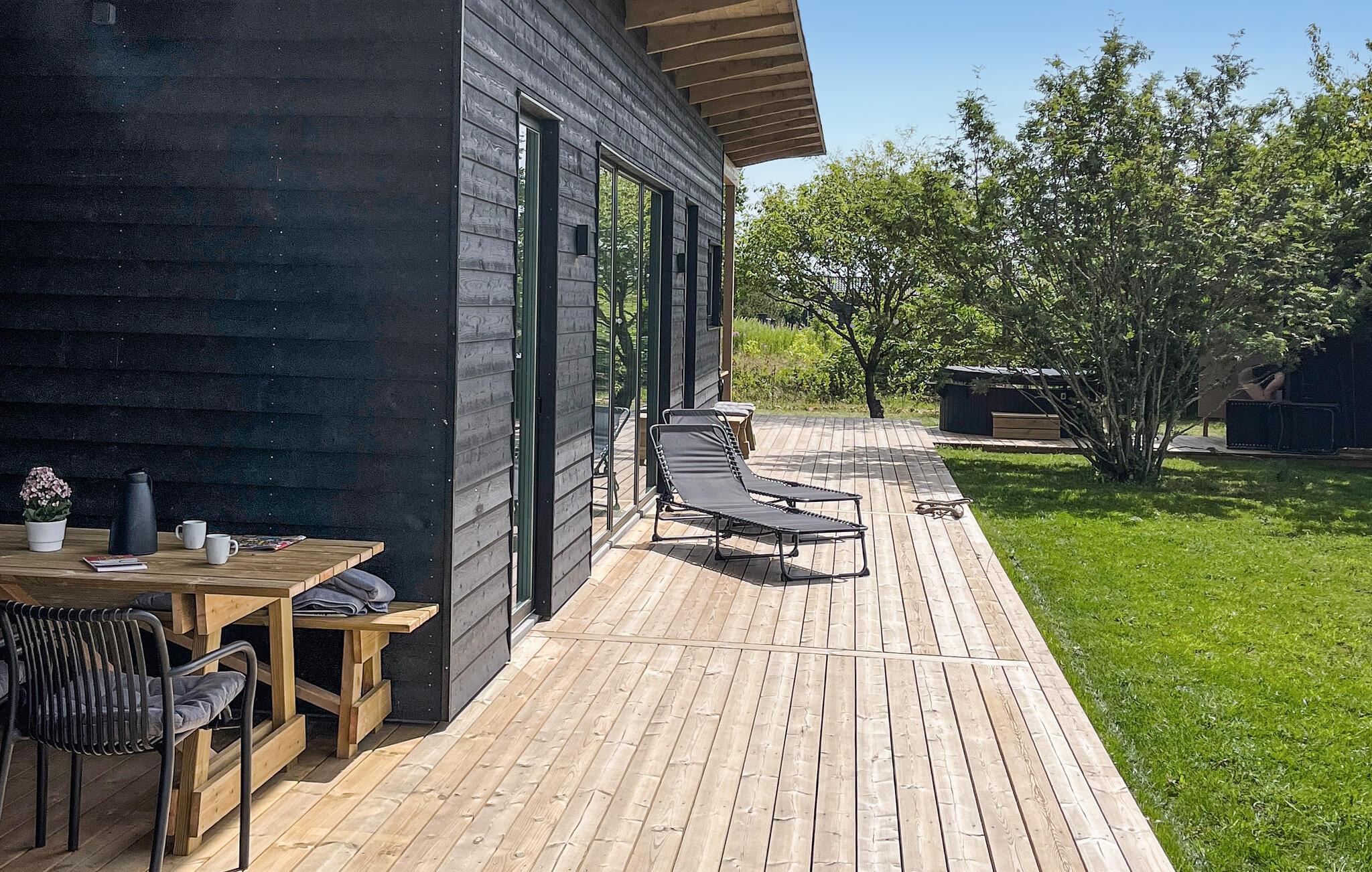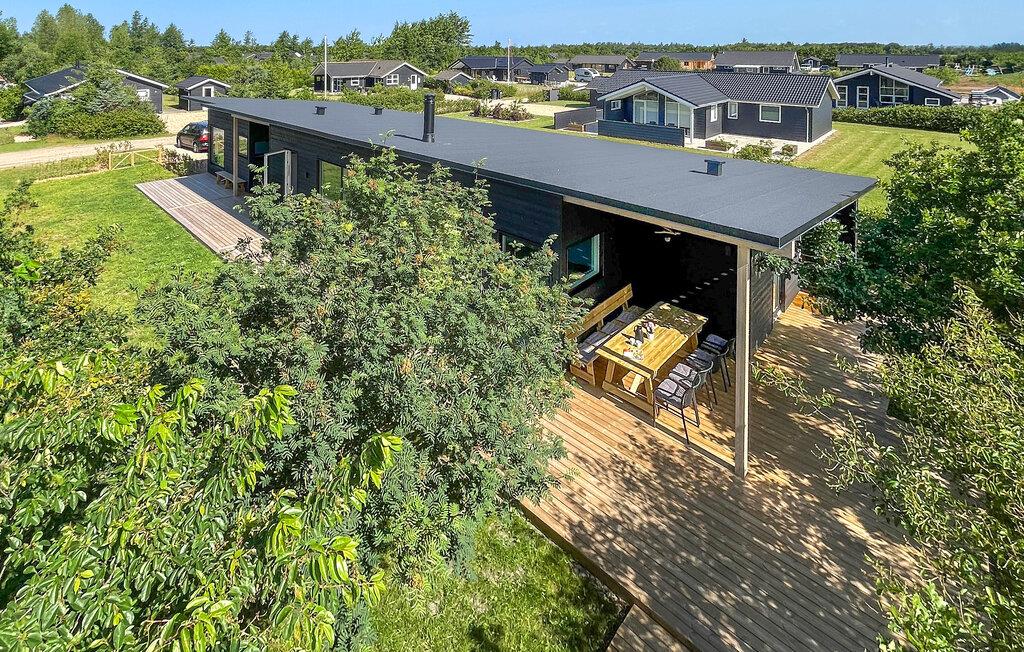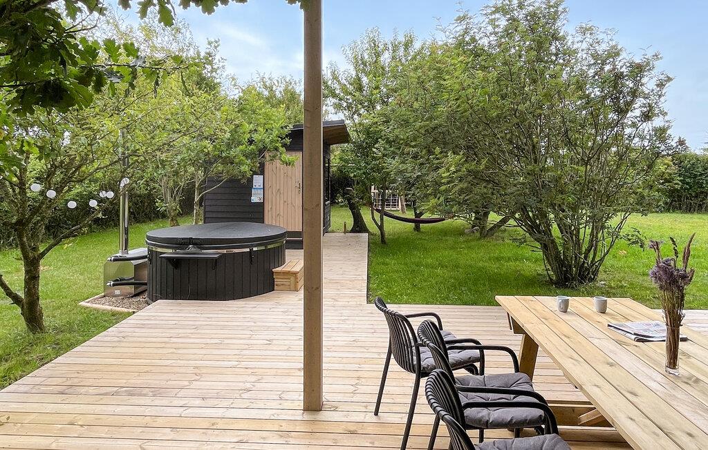 Oplev luksus og afslapning i dette moderne fritidshus med spabad, sauna og vildmarksbad ved Skaven Strand.