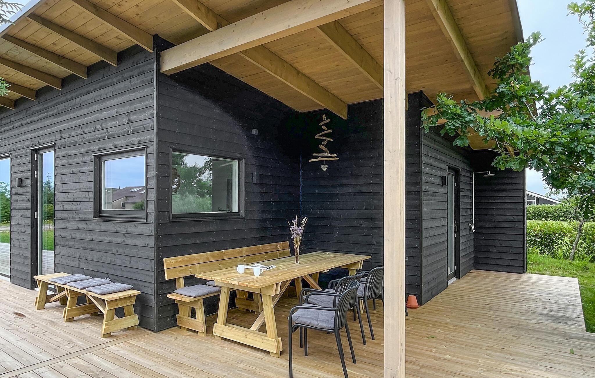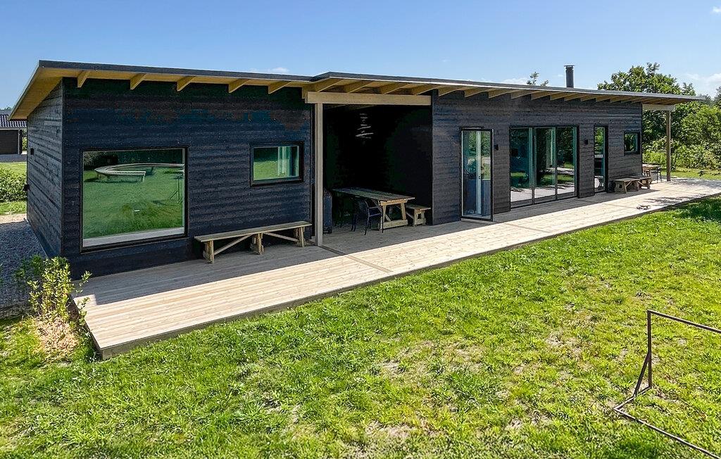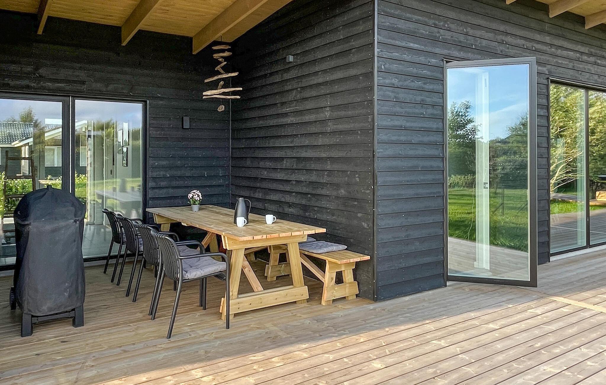 Oplev luksus og afslapning i dette moderne fritidshus med spabad, sauna og vildmarksbad ved Skaven Strand.