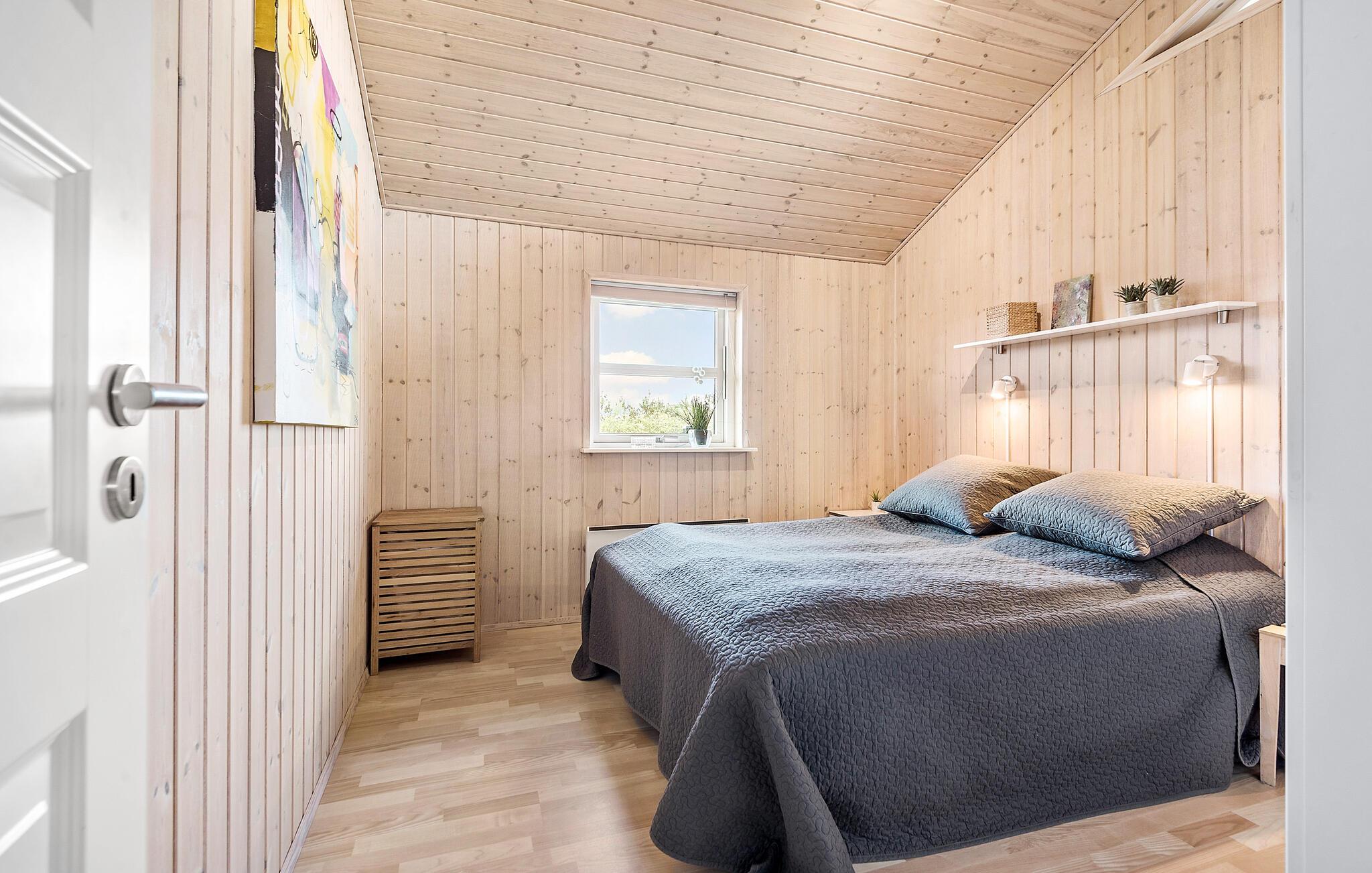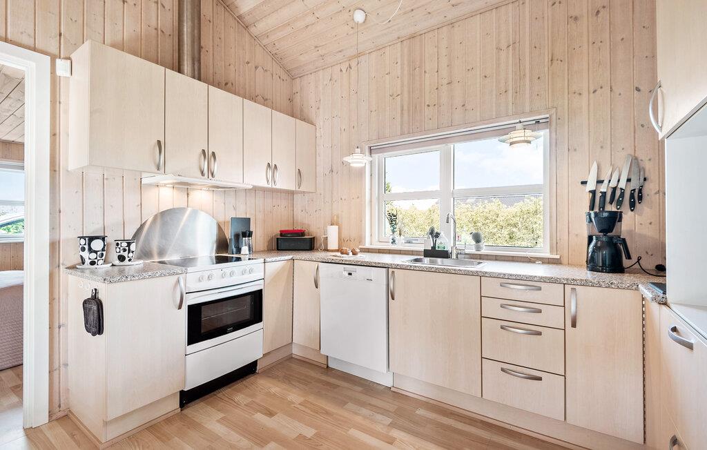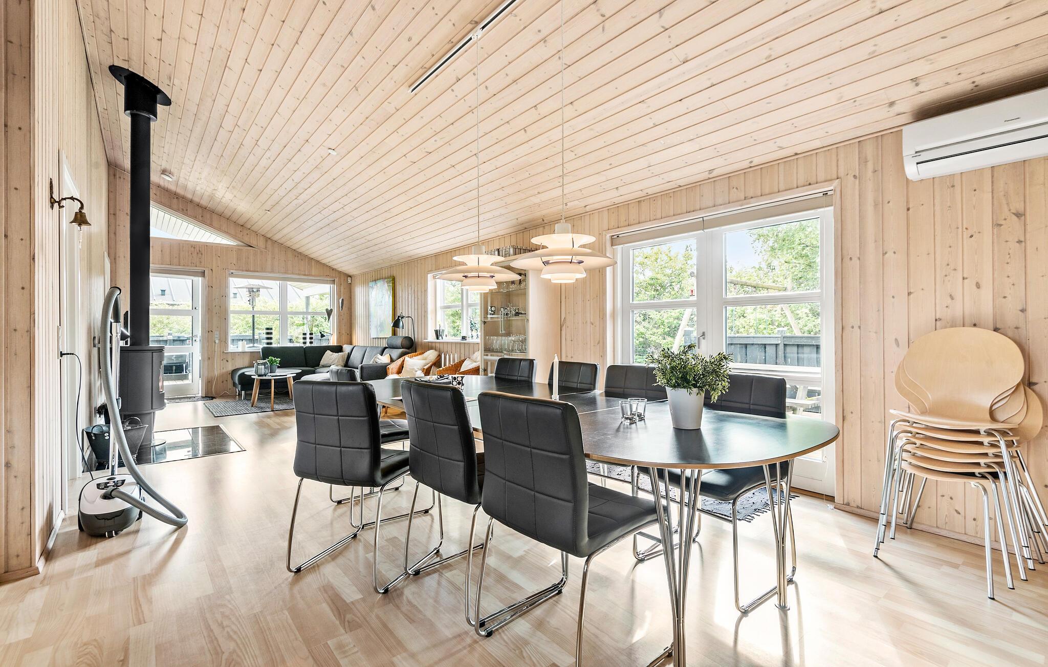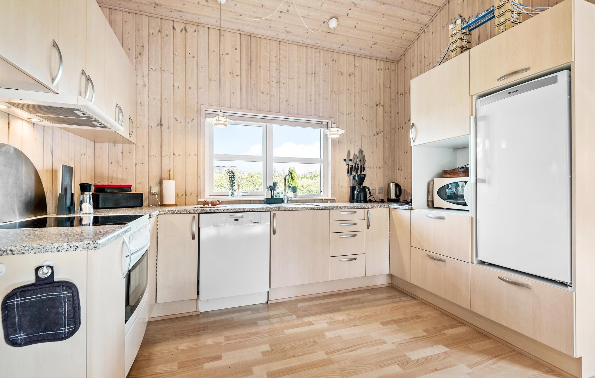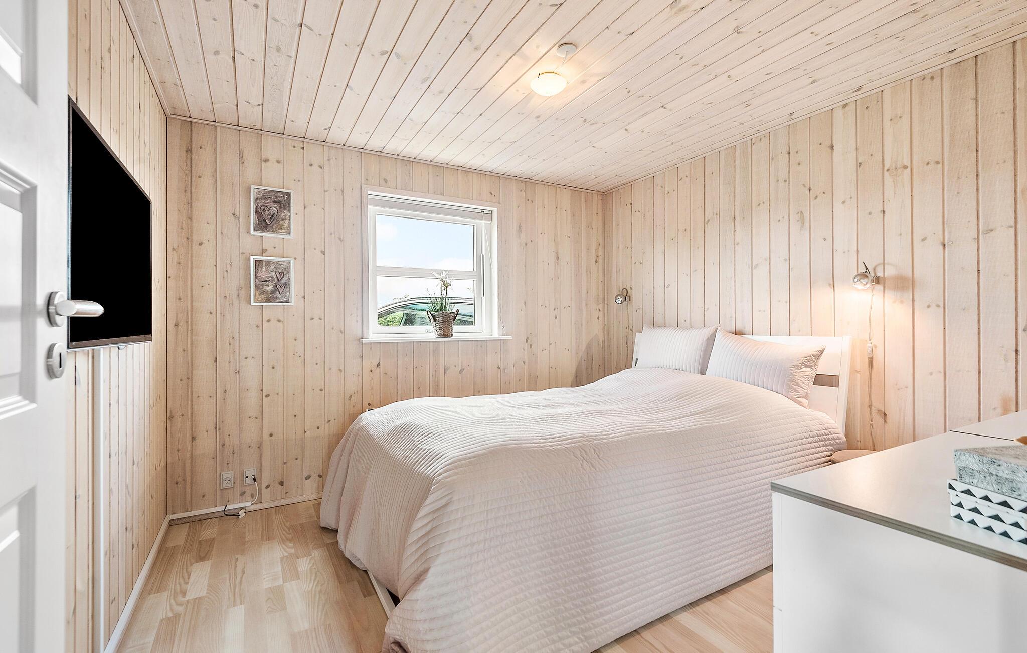 Kom væk fra hverdagens trummerum og hold en skøn ferie i dette hyggelige sommerhus. Indenfor er huset beklædt i lyst træ på både vægge og lofter, som giver en hyggelig og rustik stemning. I sofahjørnet kan I slappe af med en god fim på tv’et og til lyden af brændeovnens knitren. Det åbne køkken gør det nemt for jer, at lave mad sammen i fællesskab, som I kan nyde om spisebordet eller ude på den hyggelige træterrasse.