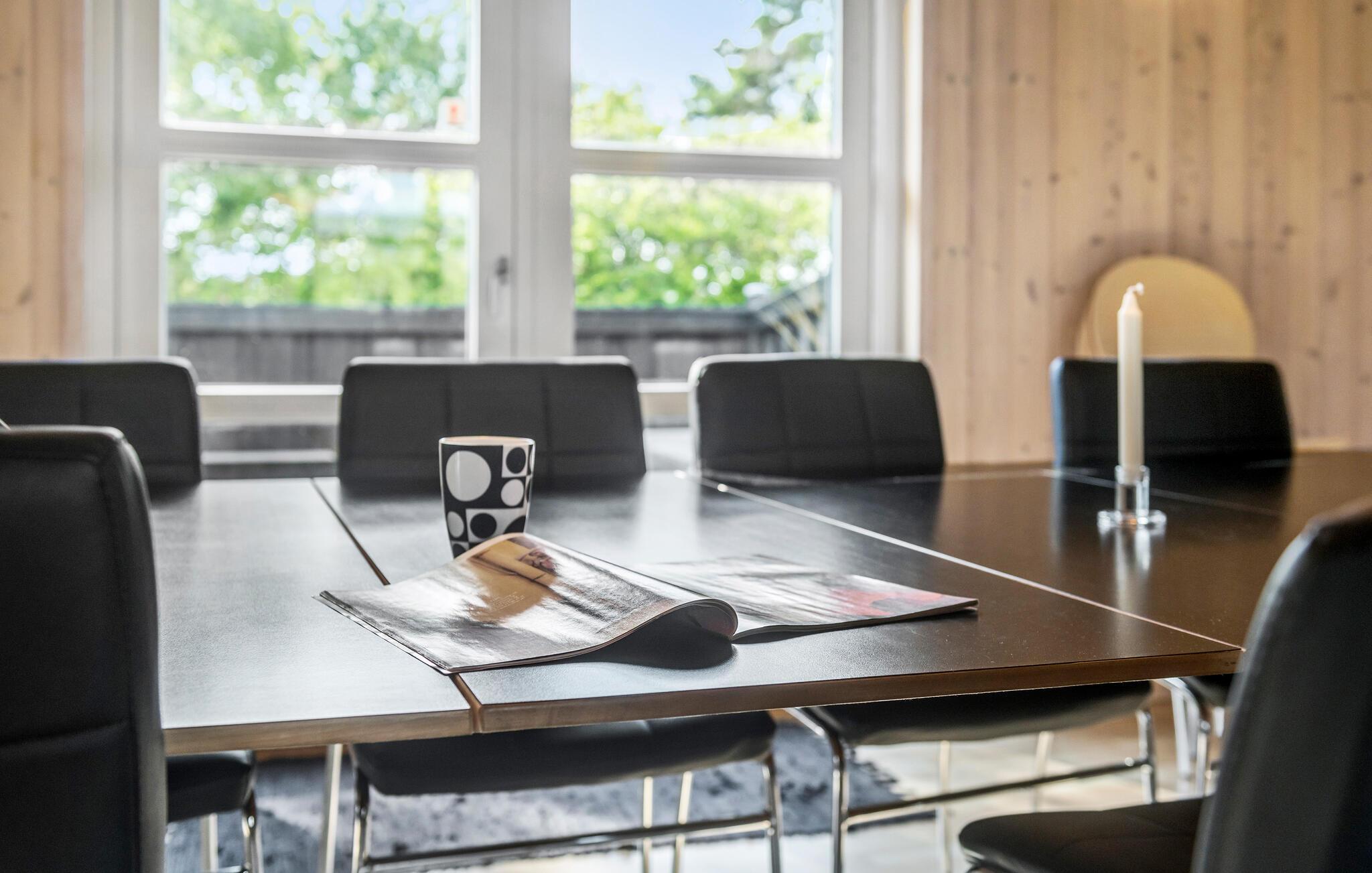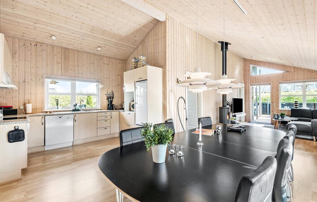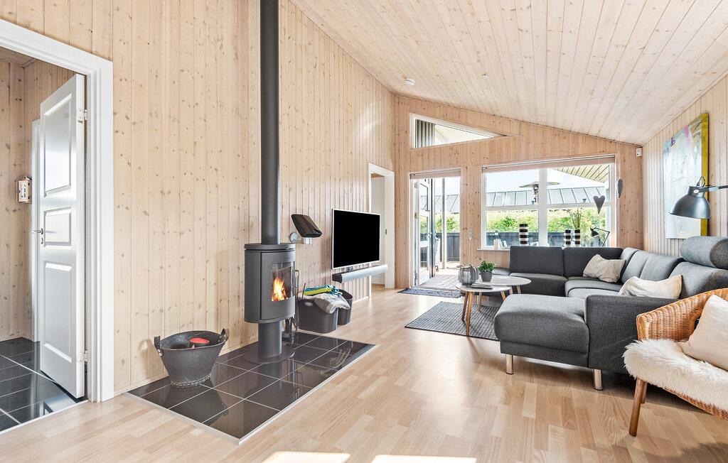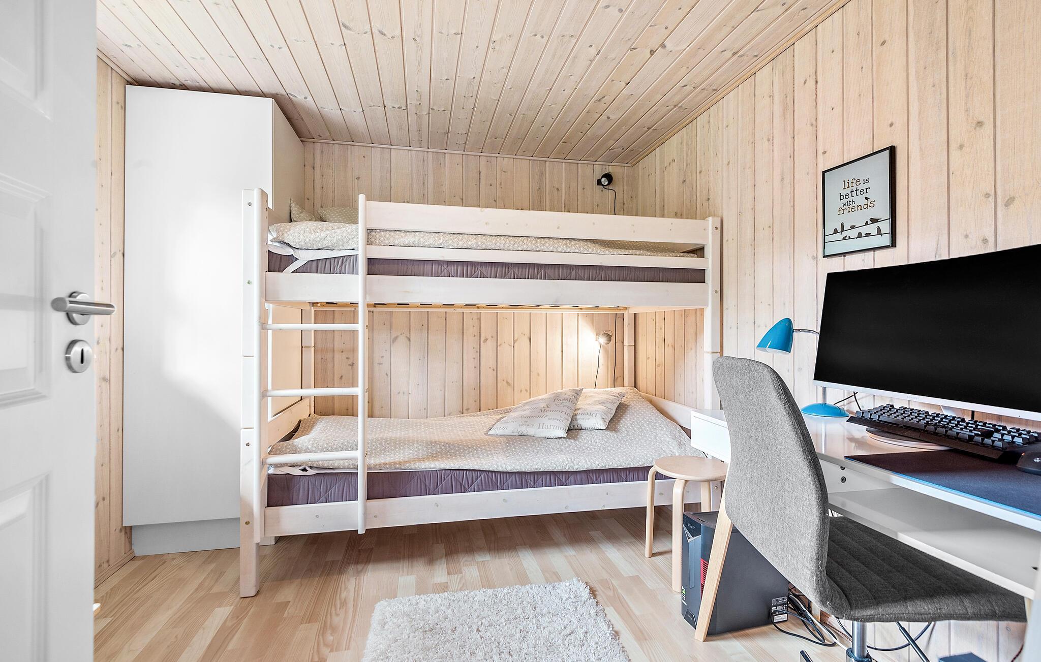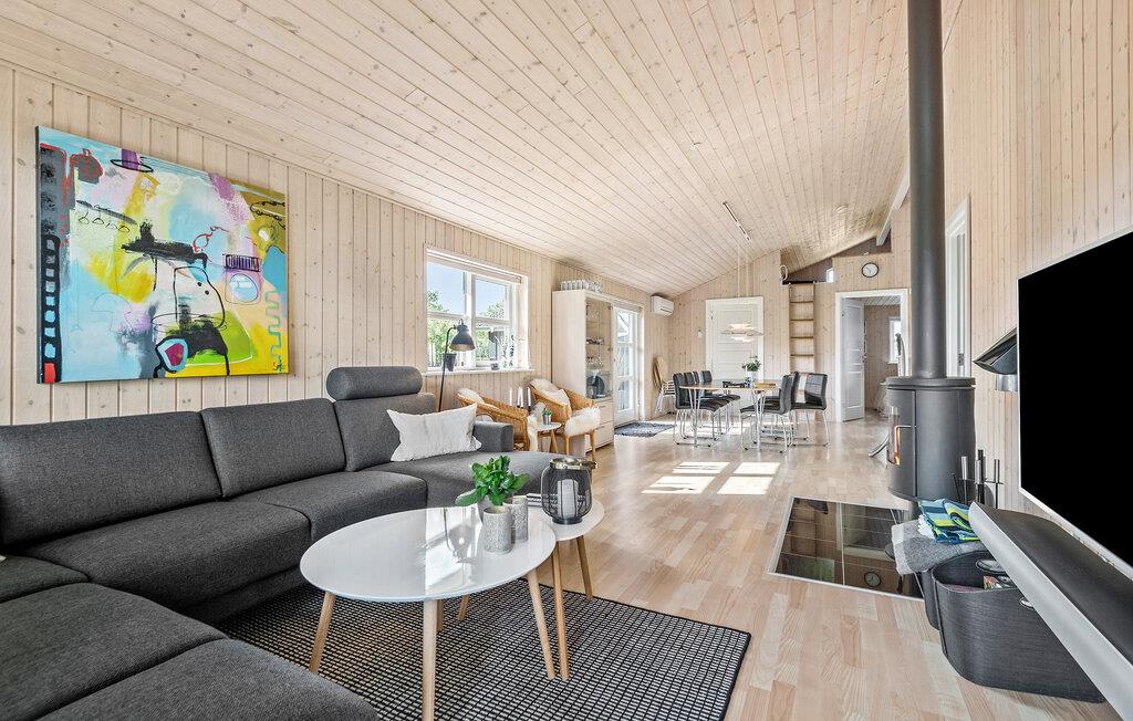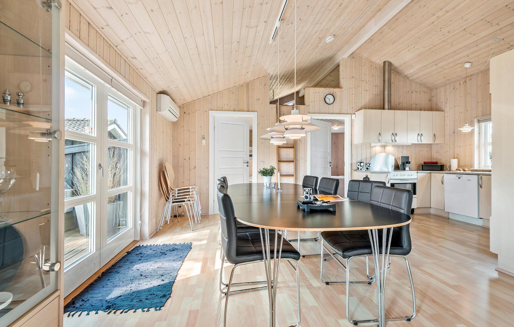 Kom væk fra hverdagens trummerum og hold en skøn ferie i dette hyggelige sommerhus. Indenfor er huset beklædt i lyst træ på både vægge og lofter, som giver en hyggelig og rustik stemning. I sofahjørnet kan I slappe af med en god fim på tv’et og til lyden af brændeovnens knitren. Det åbne køkken gør det nemt for jer, at lave mad sammen i fællesskab, som I kan nyde om spisebordet eller ude på den hyggelige træterrasse.