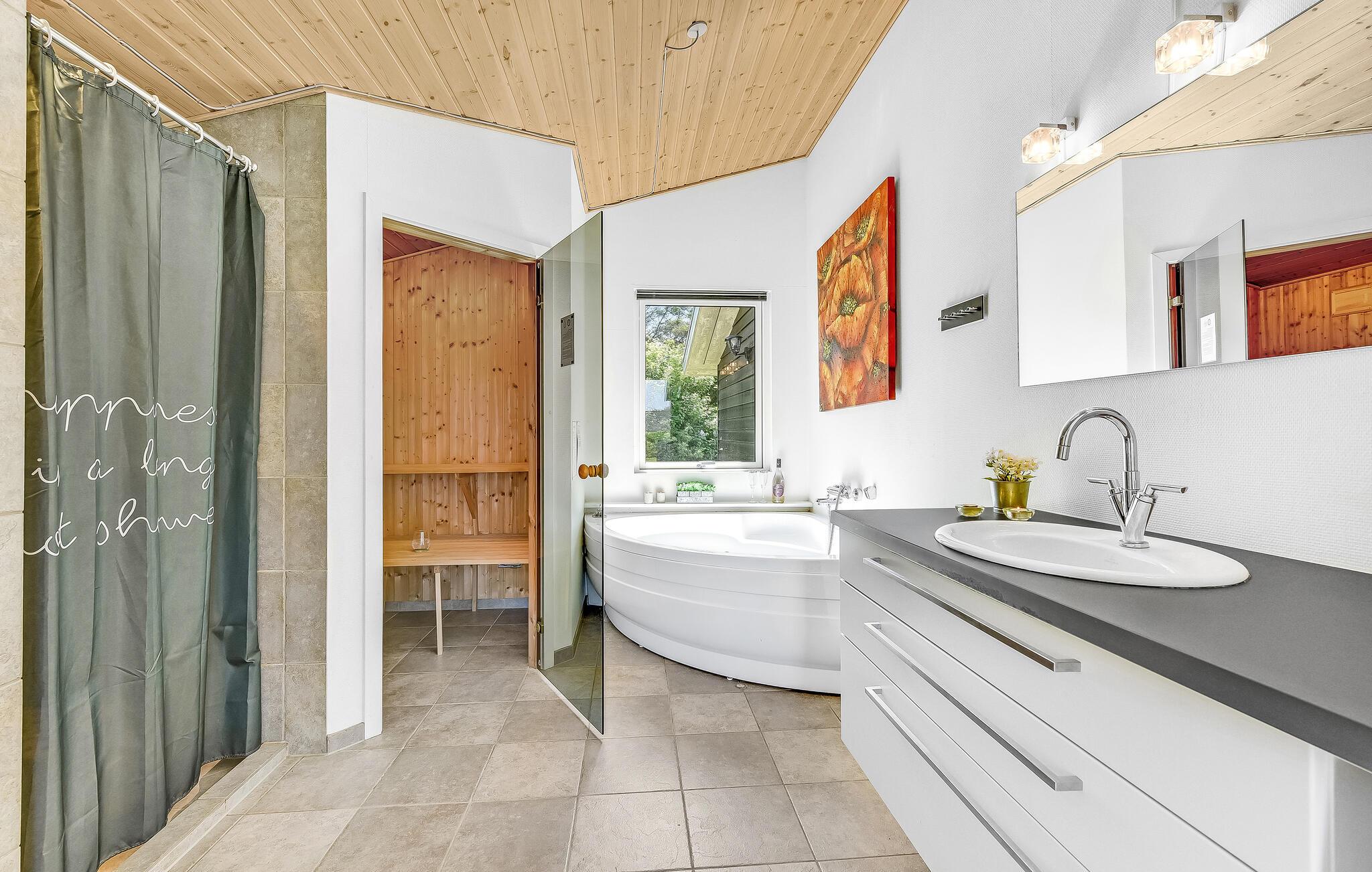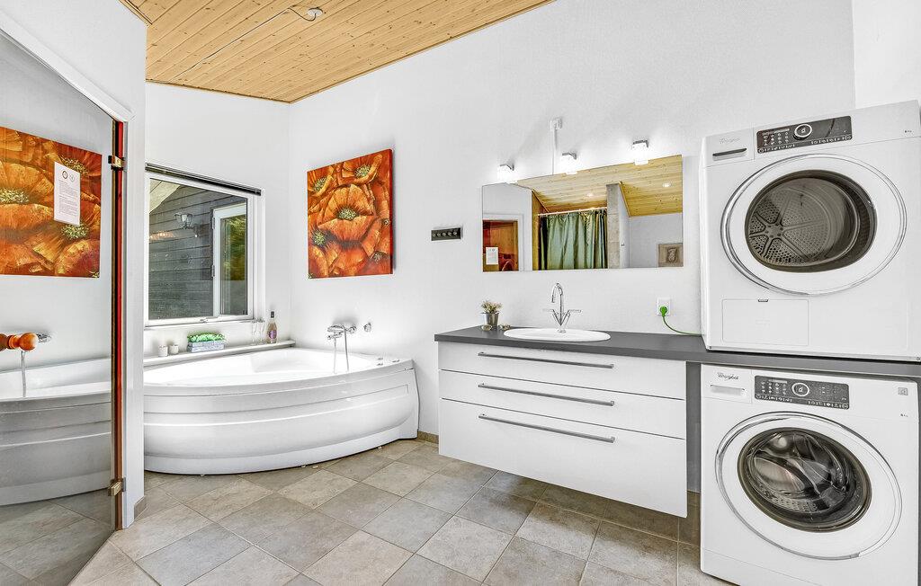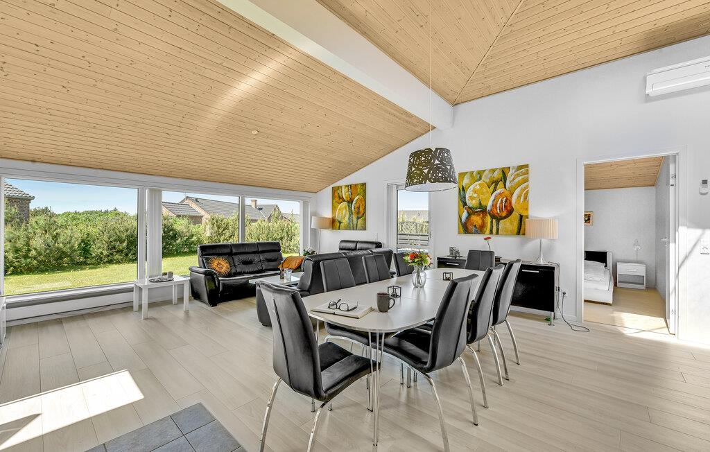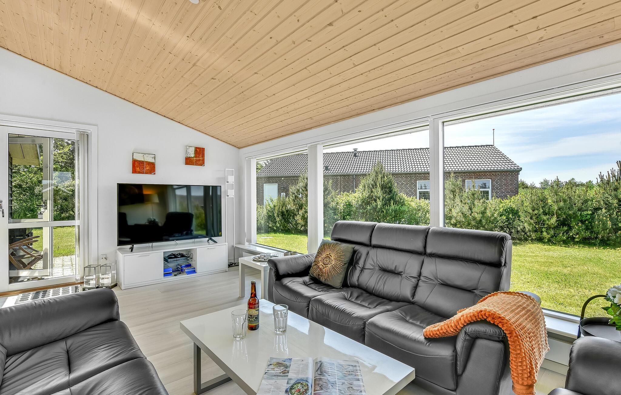 Dette komfortable og rummelige feriehus venter på jer i kort afstand fra stranden. De hyggelige værelser med moderne møbler tilbyder rigelig plads til en familieferie og tilbyder takket være de store vinduer en smuk udsigt ud over naturen. Sæt jer til rette i saunaen og spabadet, og efter en begivenhedsrig dag kan I gøre det behageligt i opholdsstuen, hvor I kan streame en god serie, lave mad sammen eller blot slappe af ved brændeovnen.
