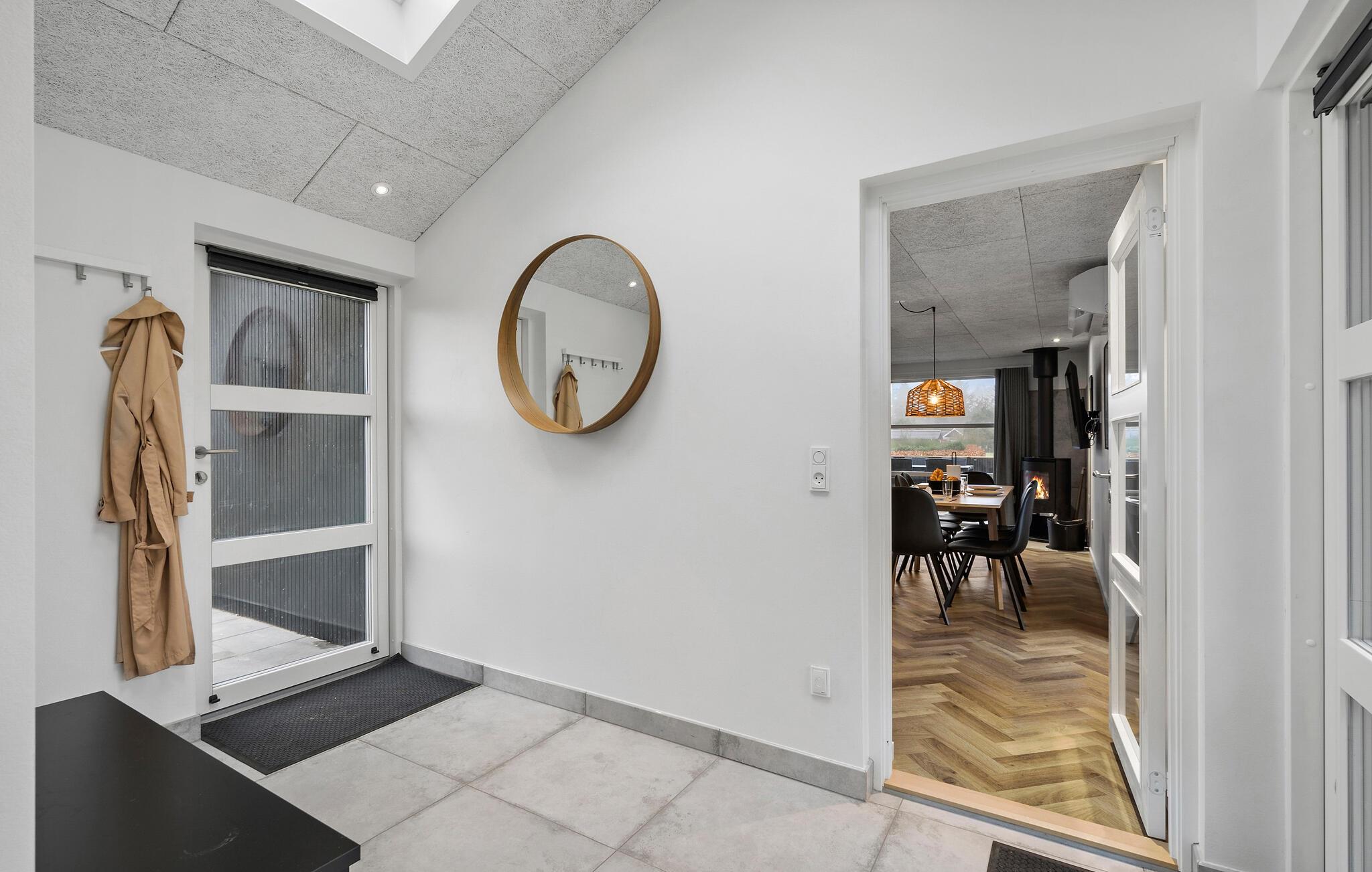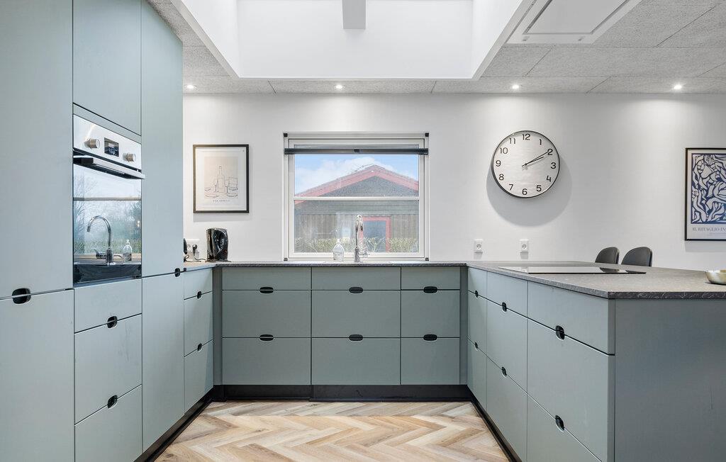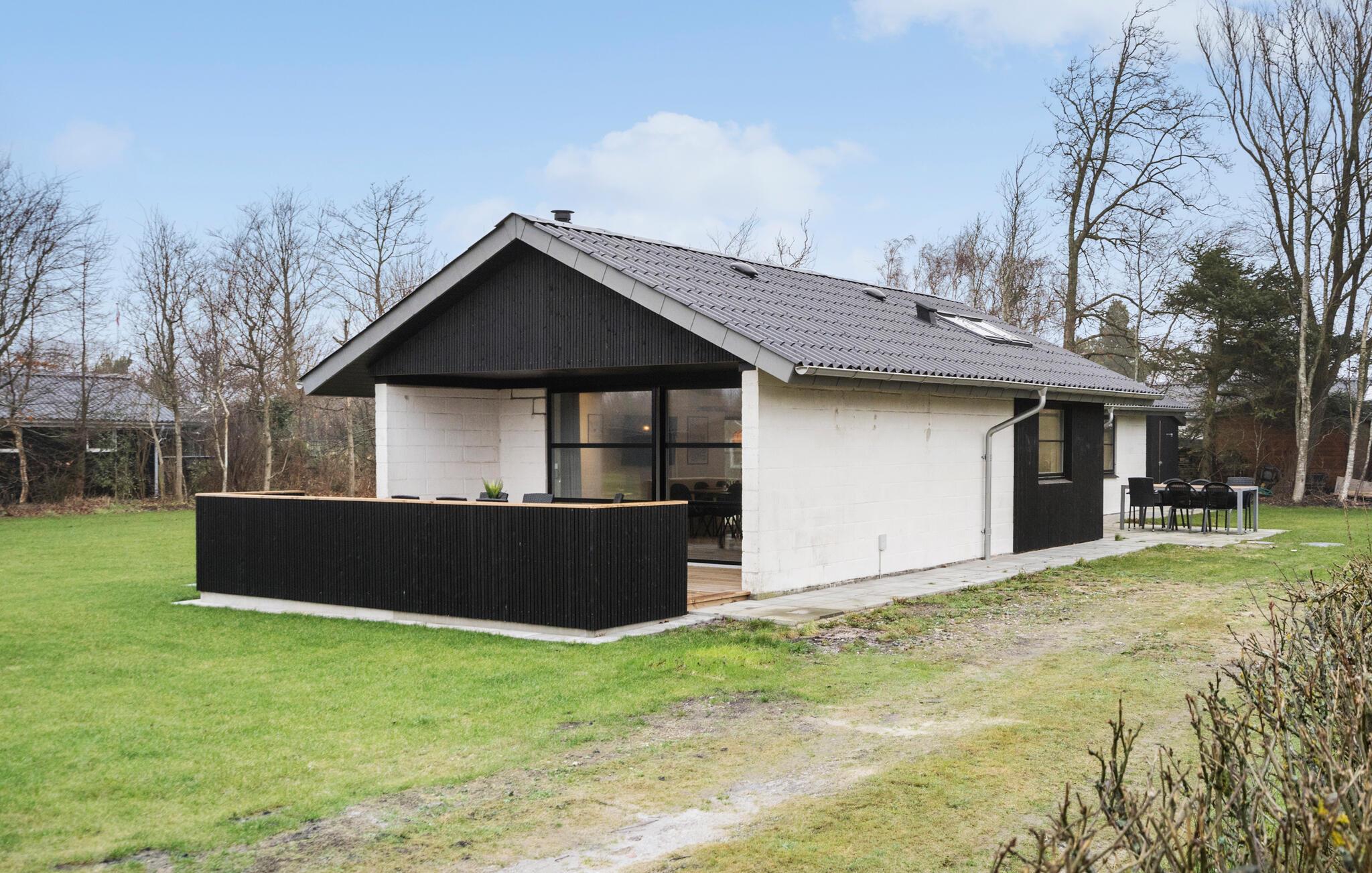 Hyggeligt feriehus ved Skaven Strand med moderne køkken, brændeovn og åbne terrasser til afslapning.