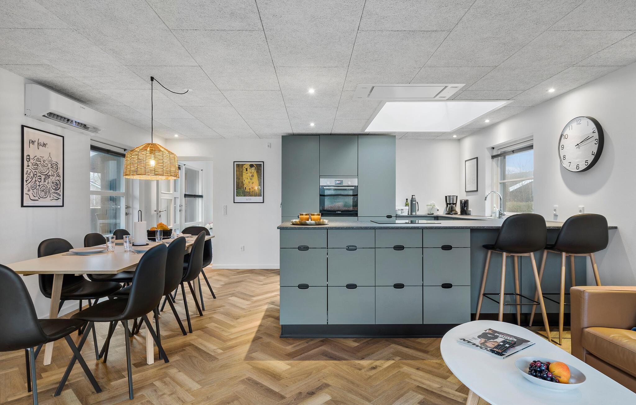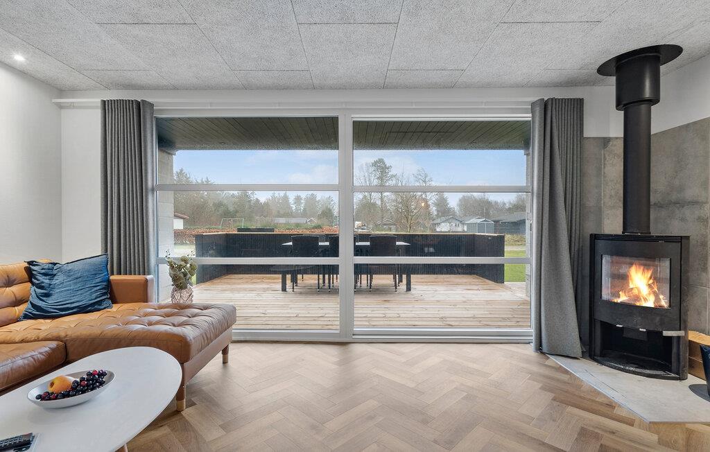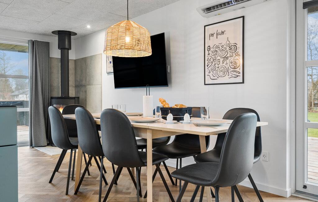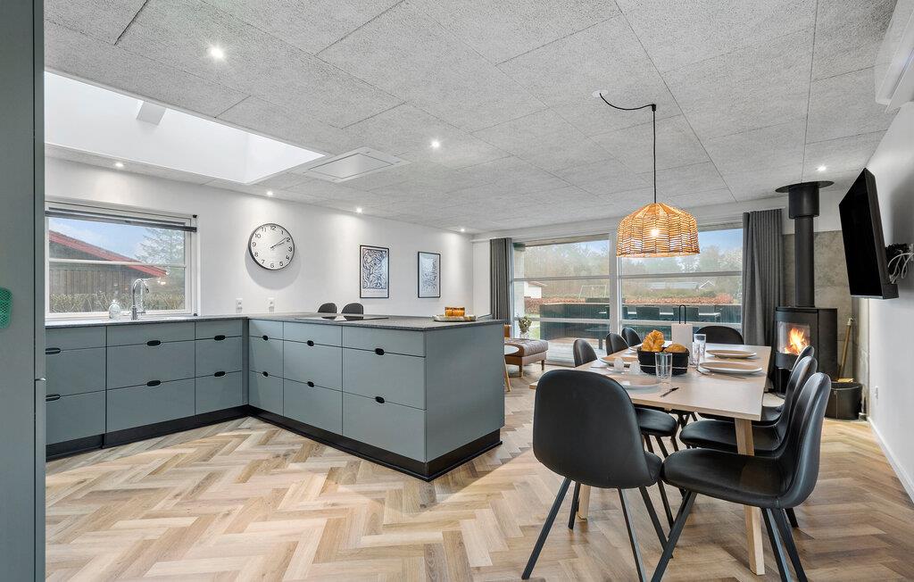 Den åbne stue kombinerer harmonisk det moderne, fuldt udstyrede køkken med den hyggelige spise- og opholdsstue. Her kan I slappe af ved den knitrende brændeovn eller tilbringe hyggelige aftener med gode måltider og en runde brætspil. Den stilfulde indretning skaber en varm atmosfære, som gør det nemt at slappe af og nyde de rolige stunder mellem udflugterne.