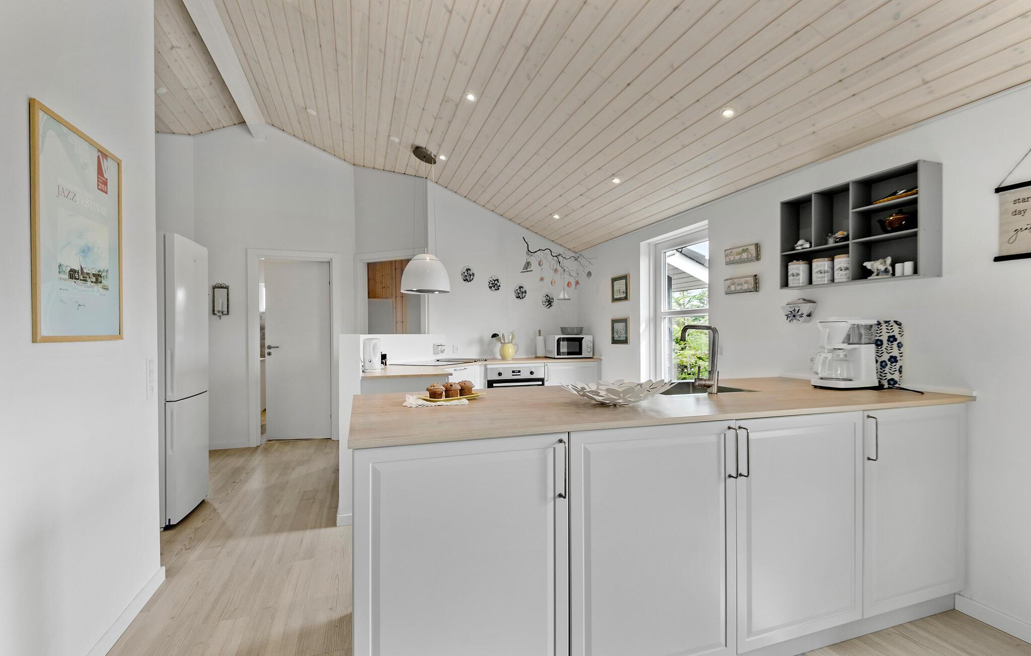 Velkommen til dette veludstyrede hus, der ligger i fredelige omgivelser i den nyere del af Skaven Strand, og hvor der venter jer en fantastisk base for årets familieferie. Huset er virkelig flot indrettet med højt til loftet, skønne lysindfald fra flere sider og åbent boligkoncept, der forener stue og køkken, så I kan hygge jer med jeres gøremål og stadig nyde hinandens gode selskab. Er vejret til den kølige side, er det bare at fyre op i brændeovnen og nyde dens knitrende varme, og skal I gøre det ekstra godt for jer selv, kan I sætte jer godt til rette og svede igennem i saunaen, mens I lægger planer for de kommende dage.