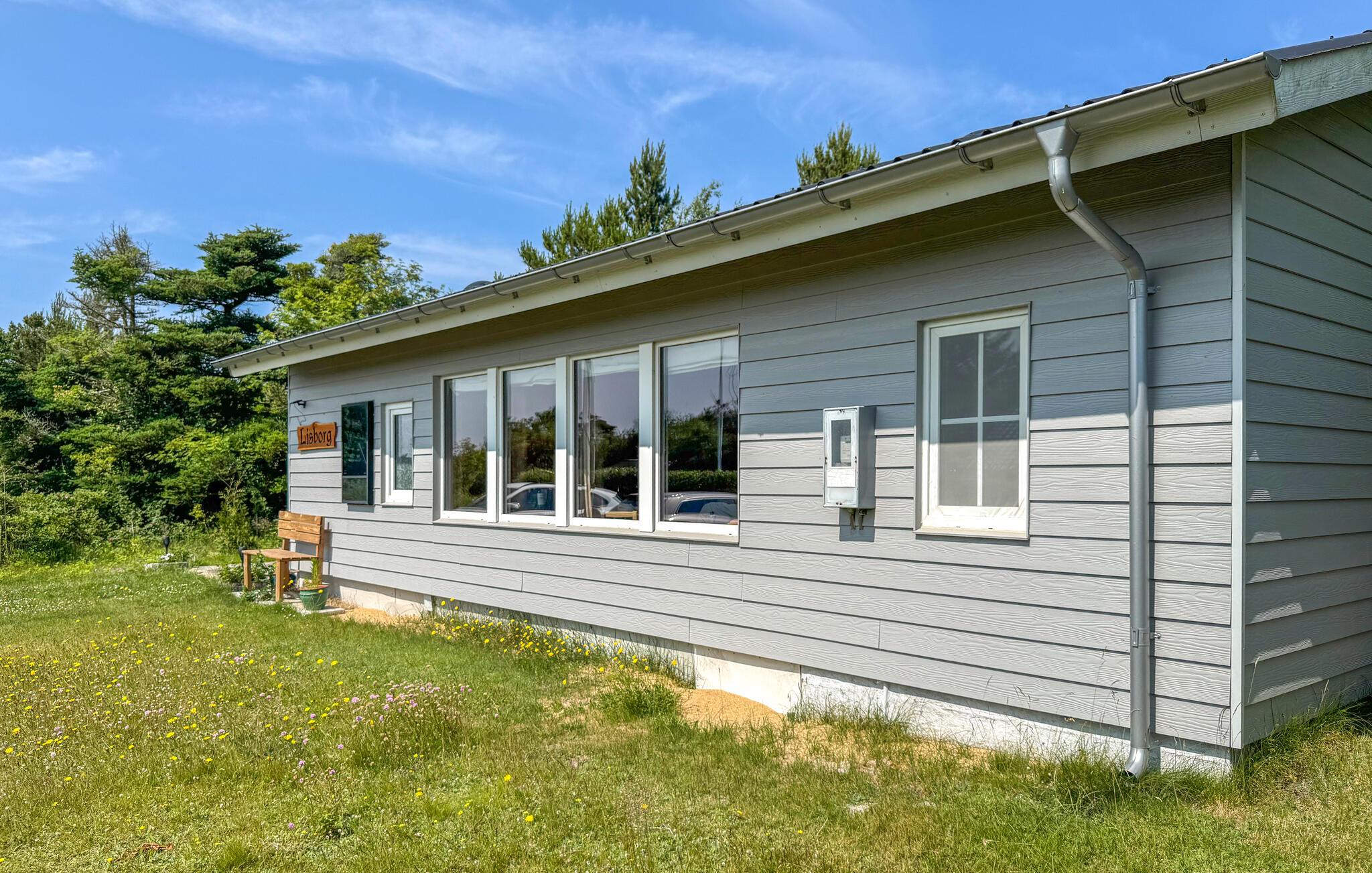 Hyggeligt feriehus nær Skaven Strand med terrasse, bålplads og smuk udsigt i naturskønne omgivelser.