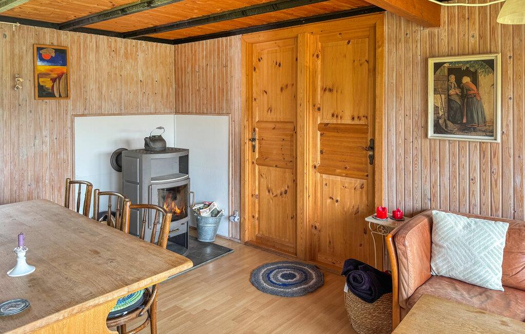 Oplev ro, natur og hygge i dette feriehus. Start dagen med morgenmad på den hyggelige terrasse, og nyd den friske luft. Indenfor venter en hyggelig atmosfære med sofa, spisebord og en smuk udsigt gennem de store vinduer.