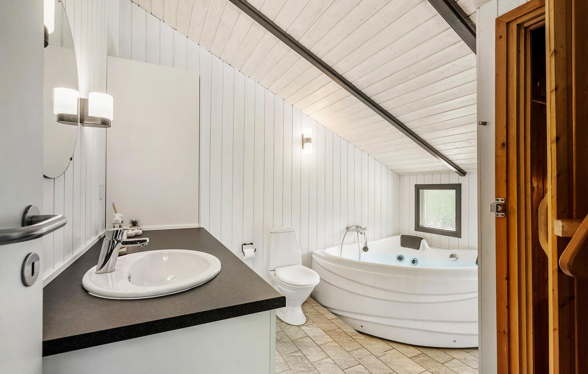Nyd et lyst og moderne feriehus med sauna nær Skaven Strands børnevenlige sandstrand.