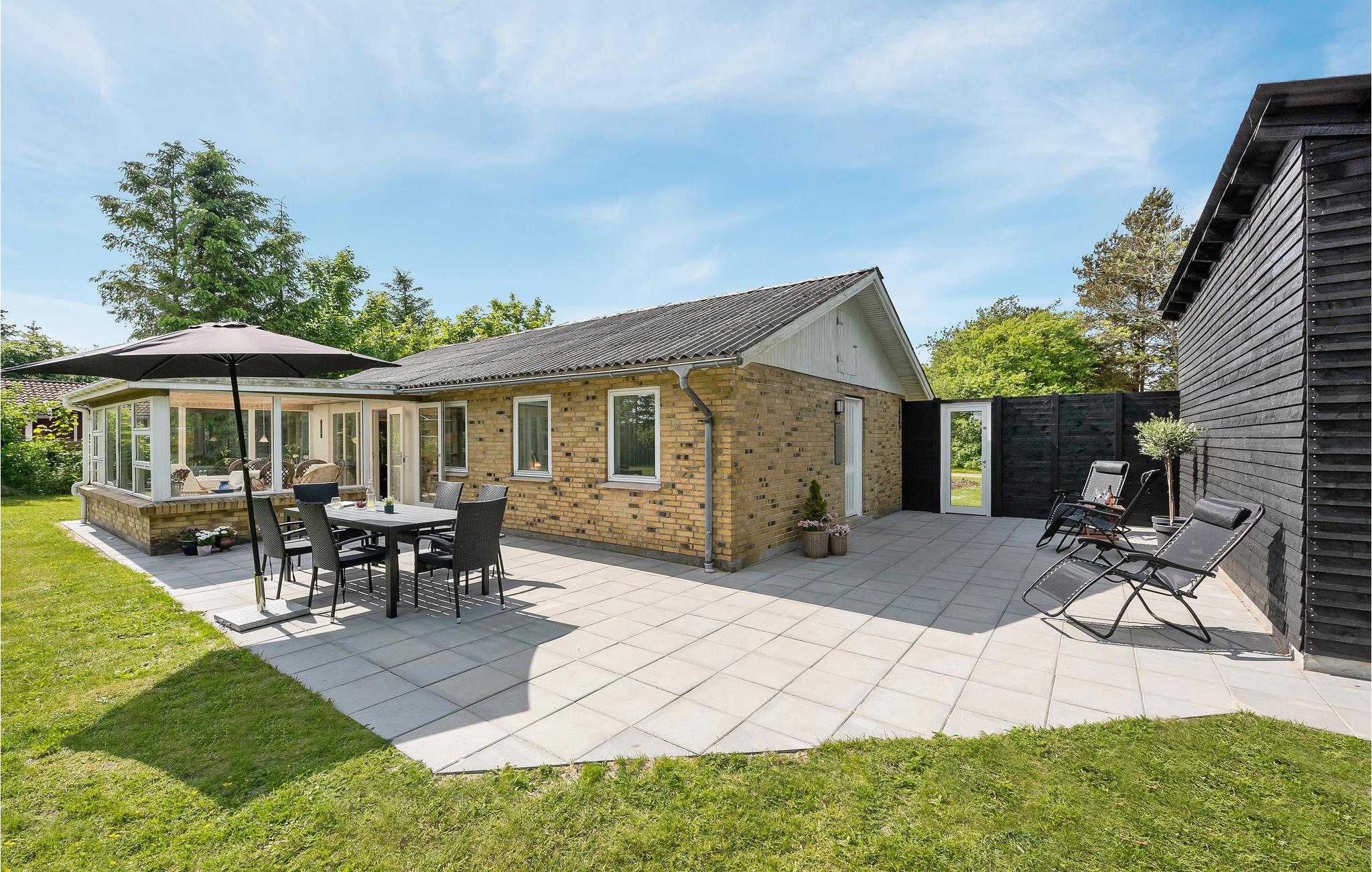 Hyggeligt feriehus tæt på Skaven Strand med stor have, terrasse og brændeovn til afslapning.