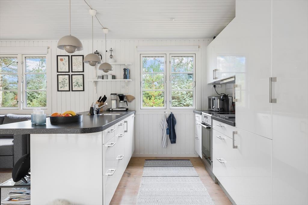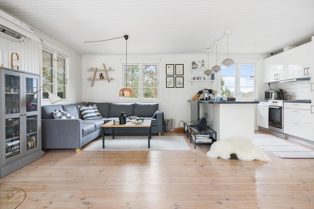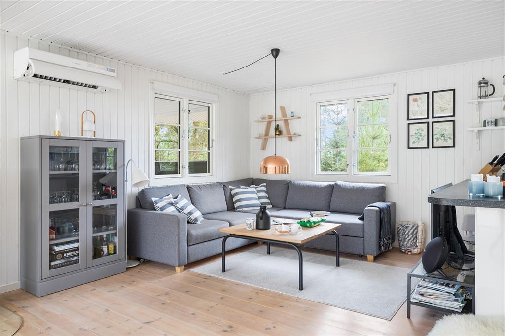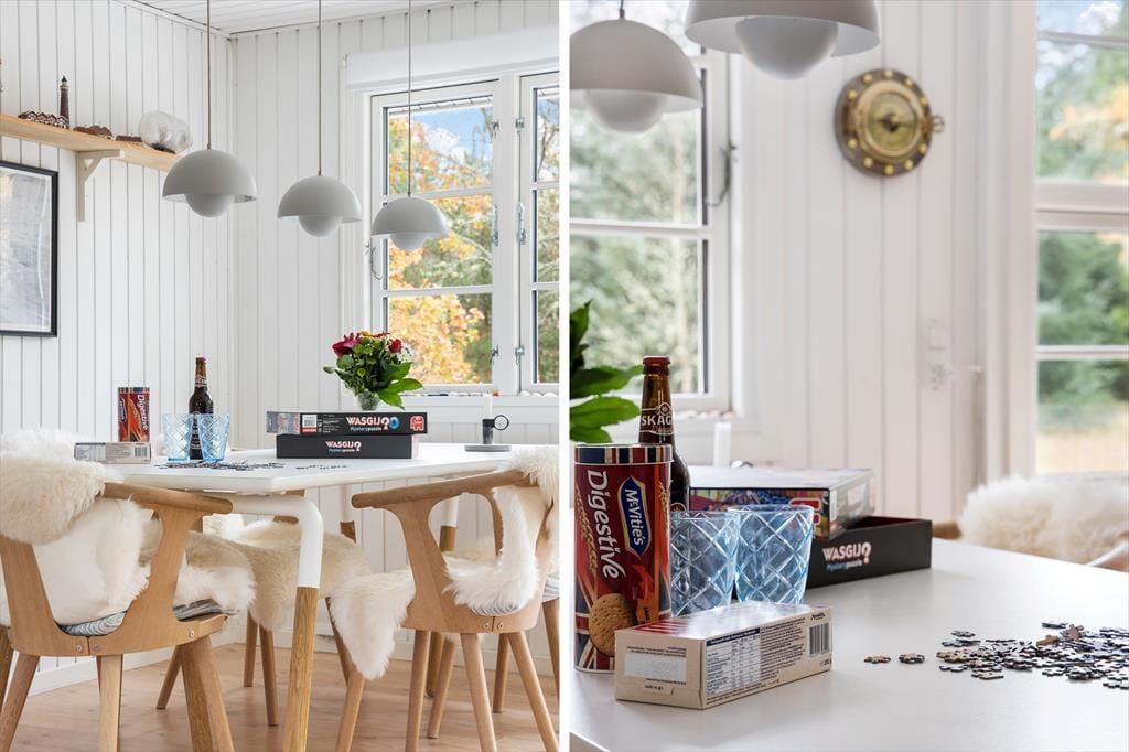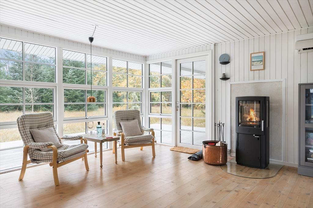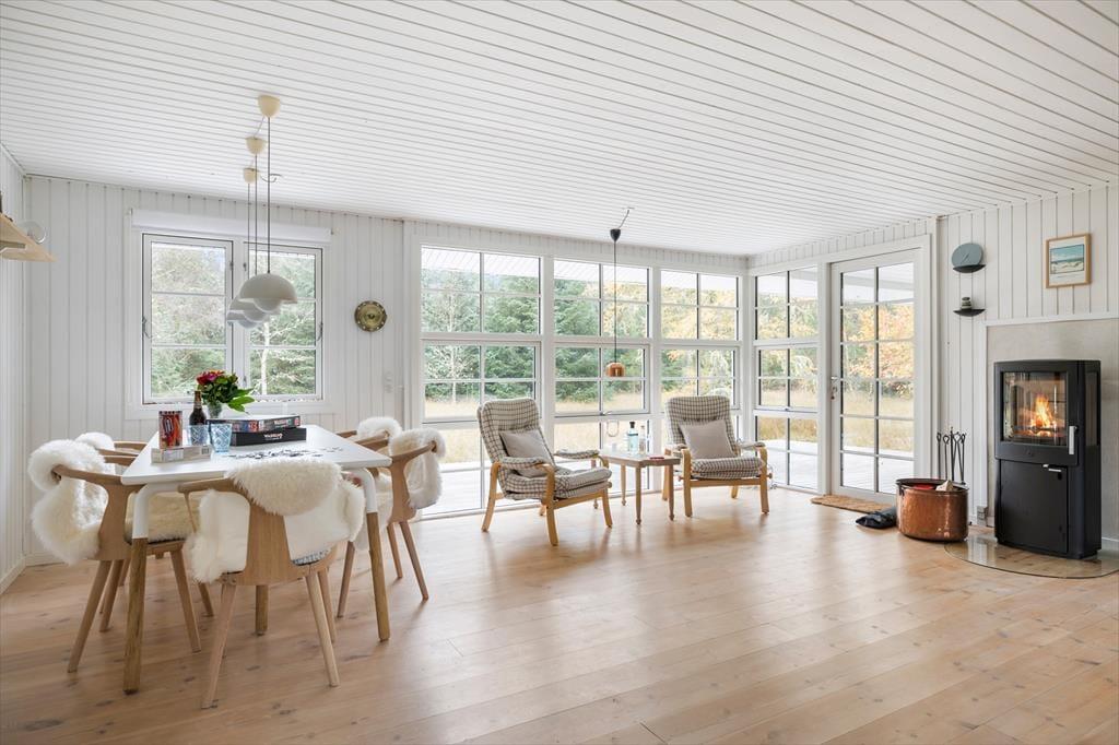 Når du træder indenfor i dette sommerhus, bliver du mødt af en lys og indbydende atmosfære, hvor de store panoramavinduer i stuen lader lyset strømme ind og inviterer naturen helt tæt på. Fra stuen har du udsigt til den grønne have, og det store vinduesparti skaber en smuk forbindelse mellem inde og ude – perfekt til afslappende feriestunder med udsigt til de rolige omgivelser. Her er plads til, at familien kan samles ved spisebordet, og du kan krybe sammen i sofaen med en god bog eller lade brændeovnen sprede varme og hygge, når vejret kalder på indendørshygge.