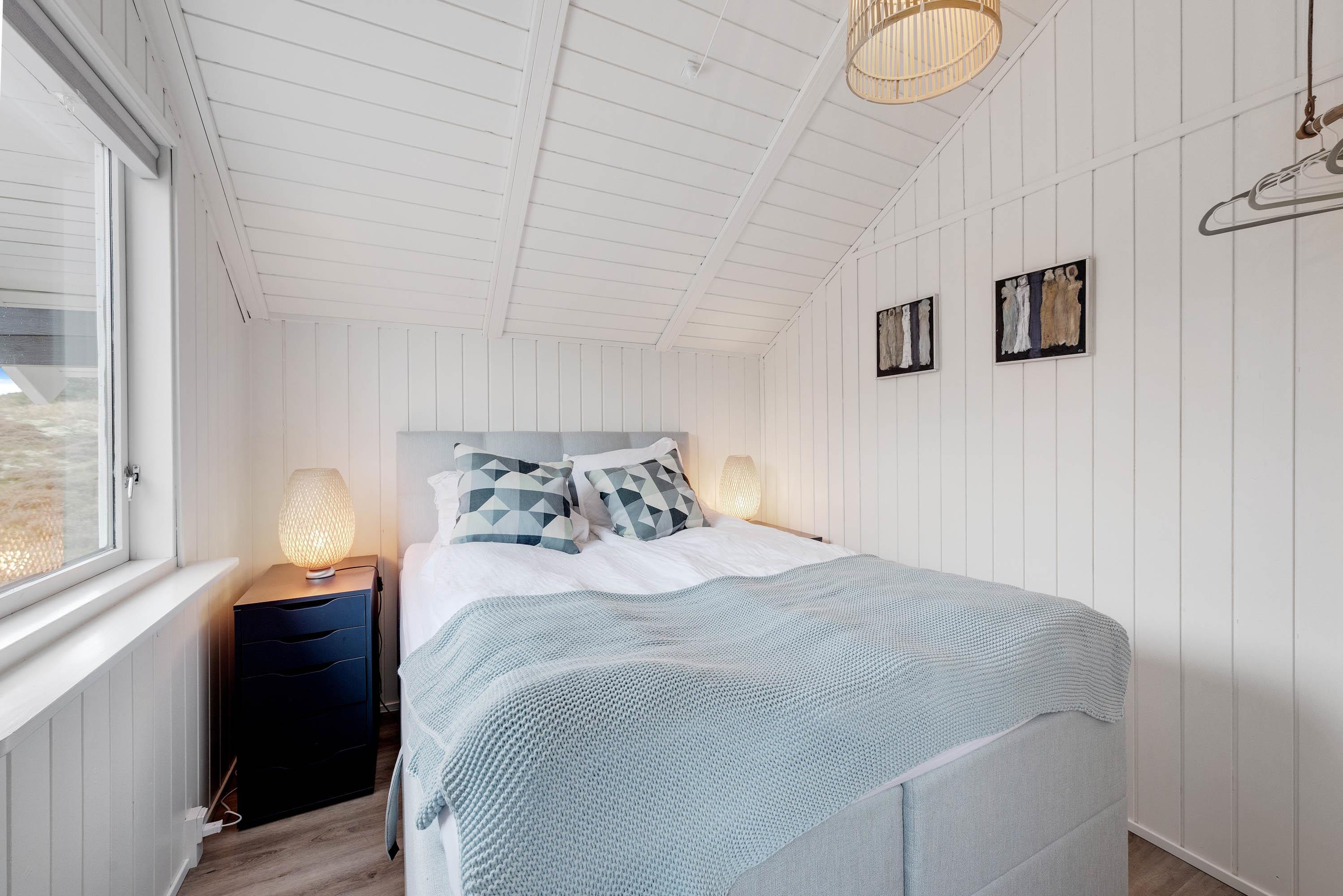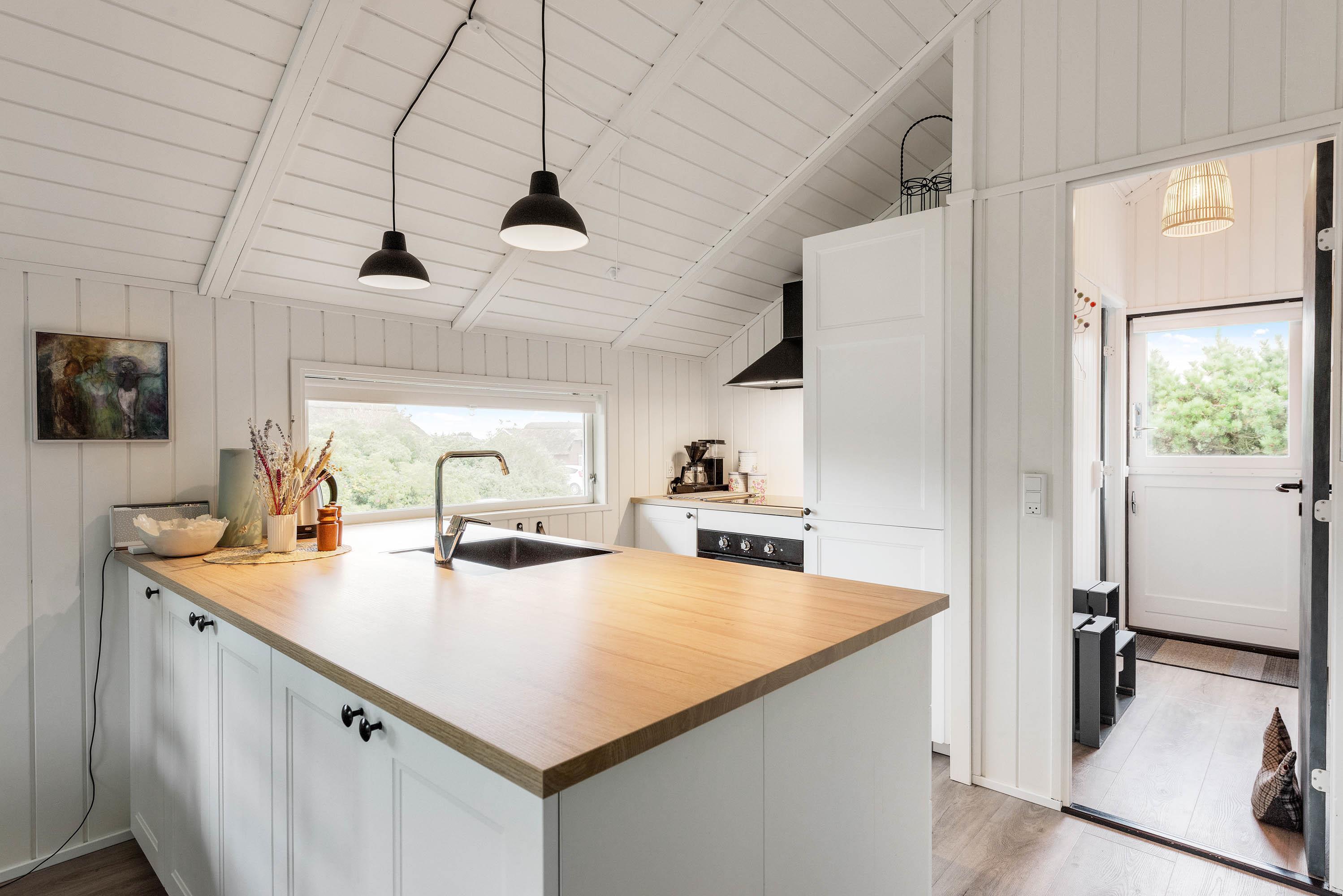 Det lille sommerhus, der kan rumme 4 personer, er renoveret i 2020. Straks du træder ind i entréen, mærker du den hyggelige stemning, og det mørkere gulv står i fin kontrast til de hvide trælofter og -vægge, der går igen i hele huset.