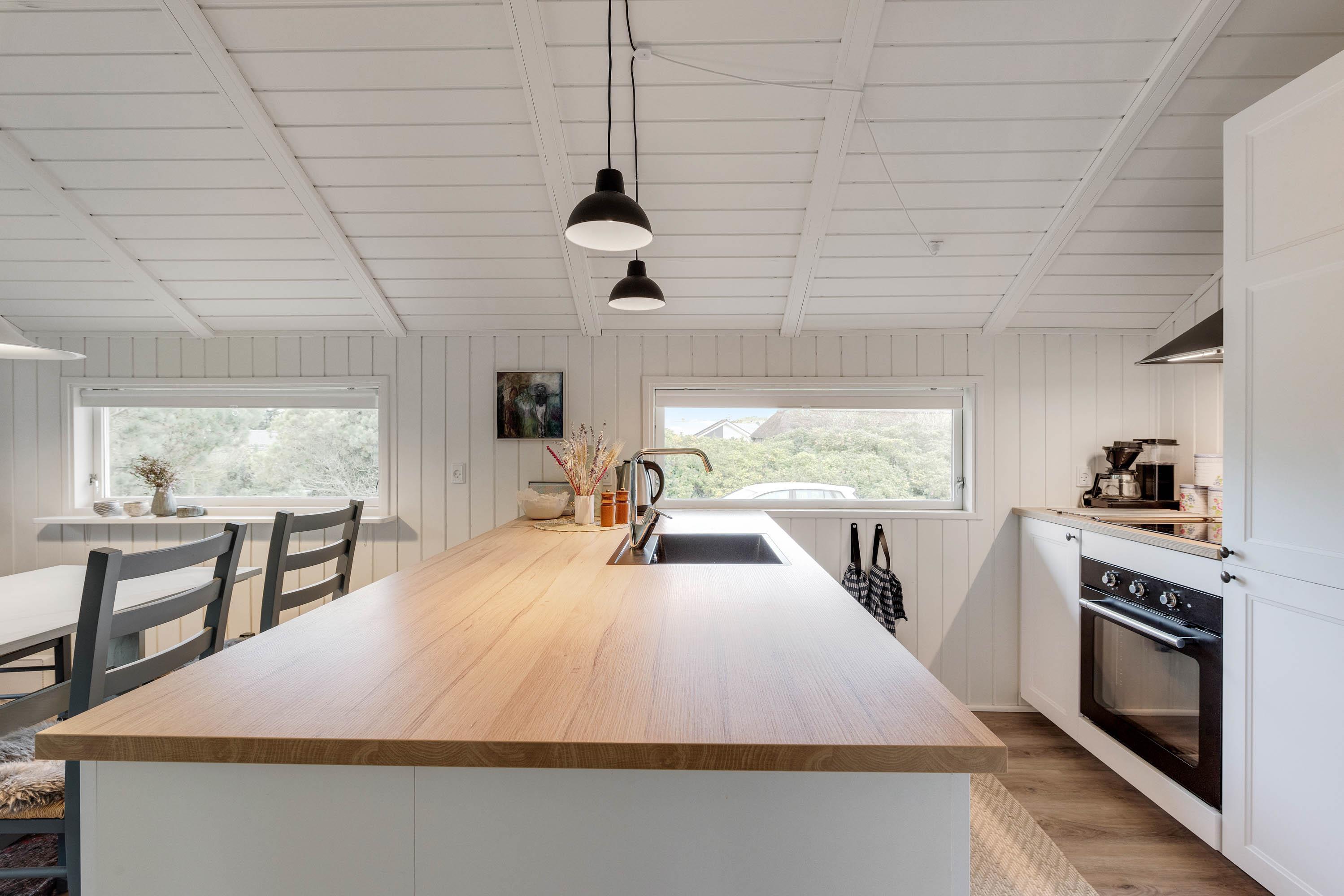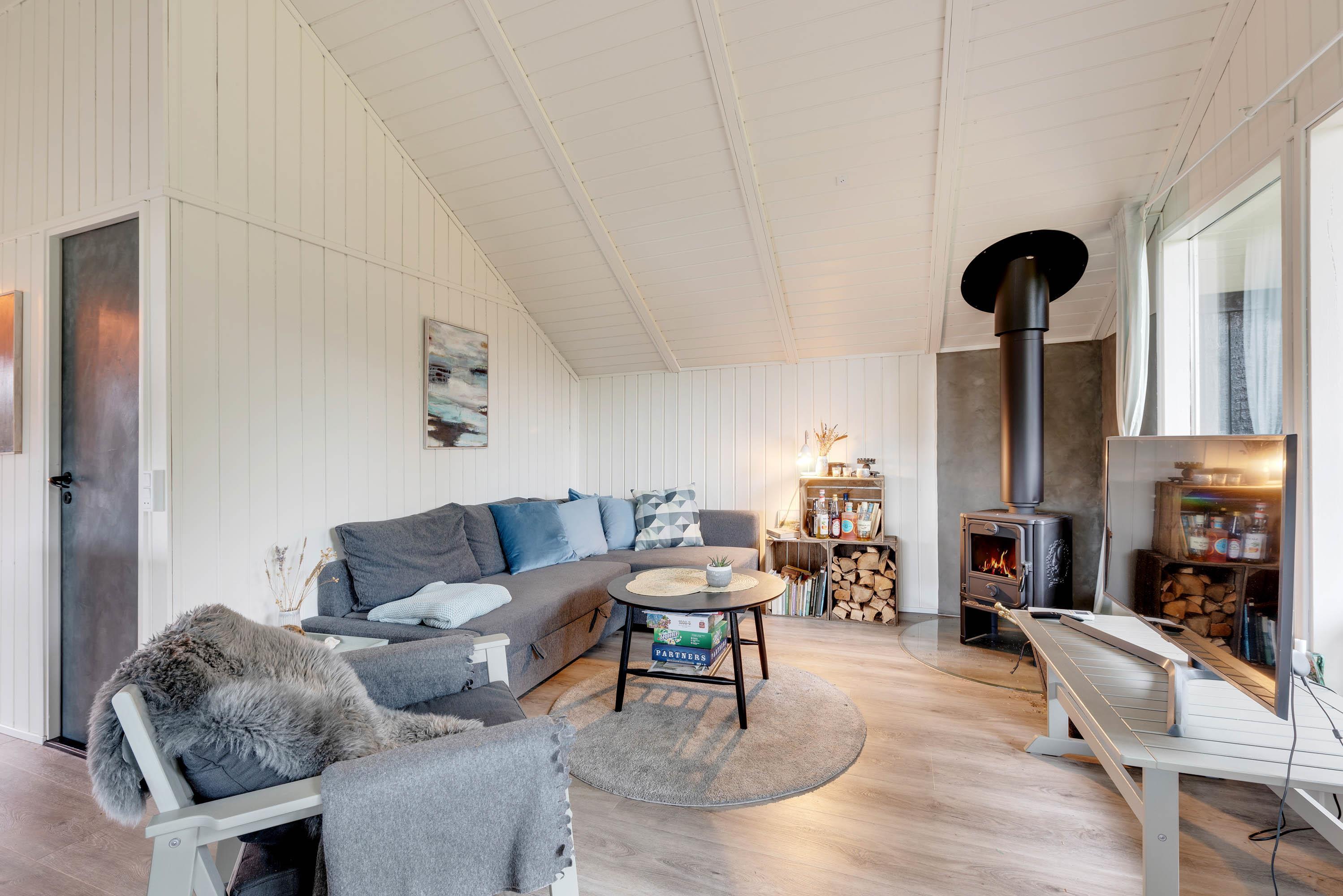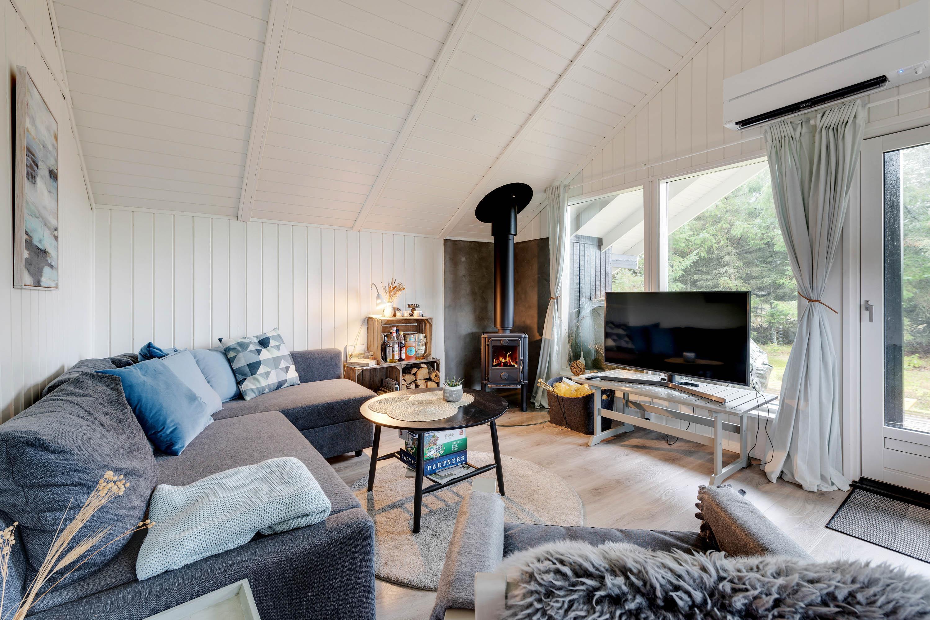 Det hyggelige køkken med opvaskemaskine er i åben forbindelse til den dejlige stue, der er smagfuldt indrettet med møbler, der passer fint til sommerhusets stil. Hjørnesofaen danner den perfekte ramme for et utal af hyggestunder med et glas vin i det varme skær fra den knitrende brændeovn. Den energibesparende varmepumpe hjælper med at holde en behagelig temperatur året rundt.