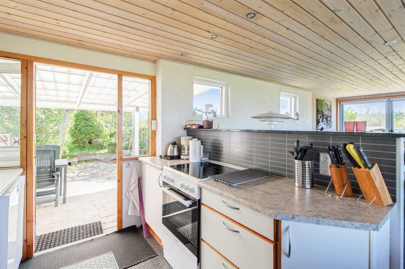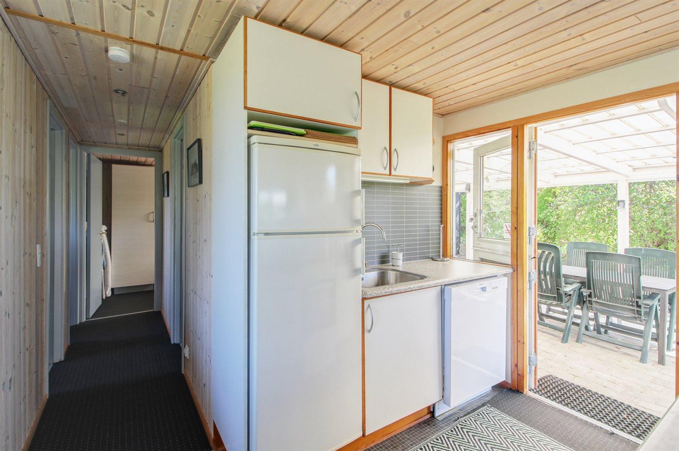 Køkkenet er udstyret med 1 køleskab. Der er 4 keramiske kogeplader, varmluftovn, mikrobølgeovn samt opvaskemaskine.
