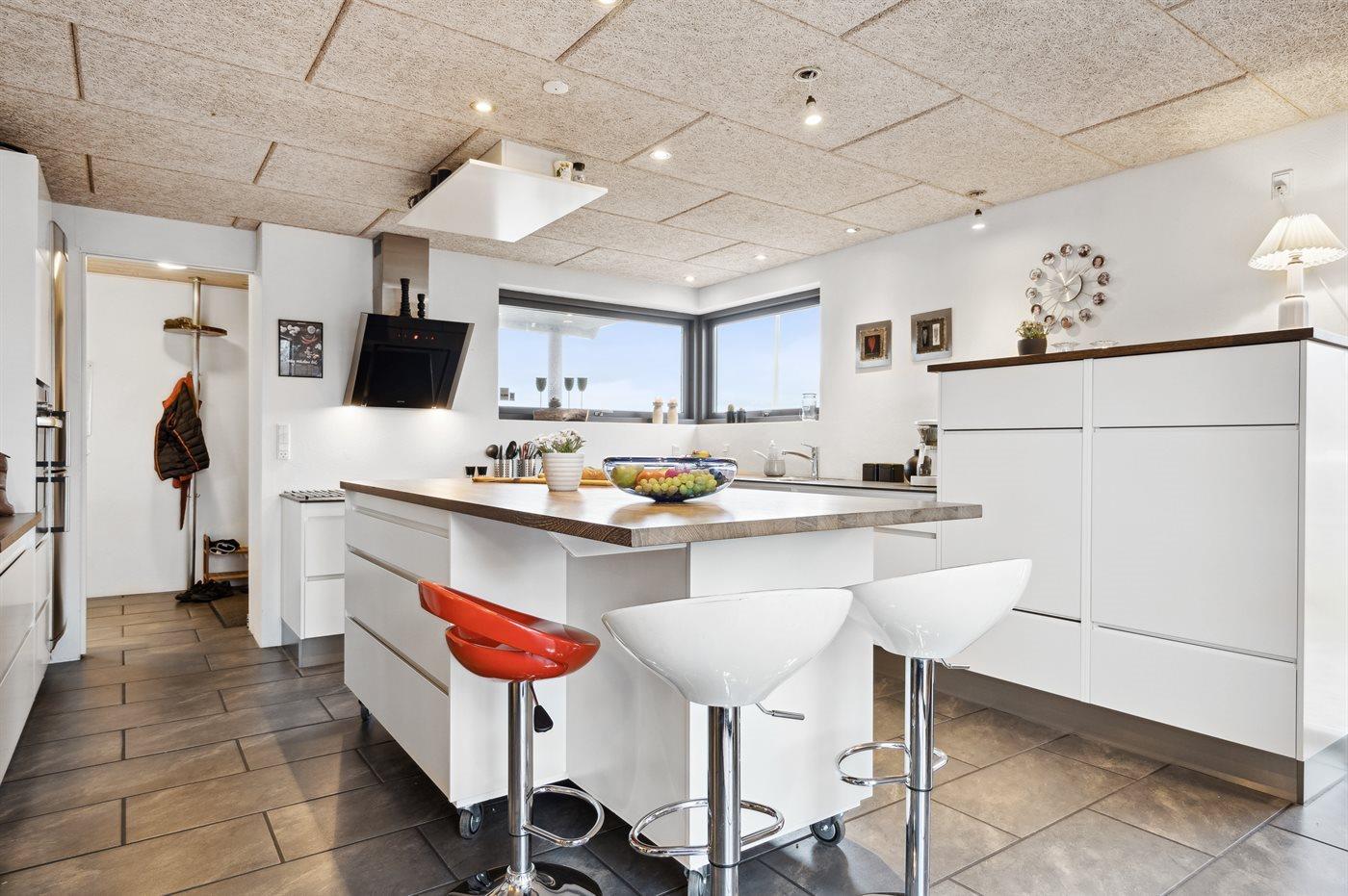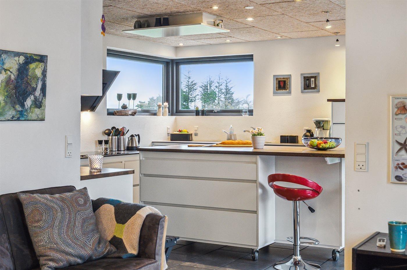 Køkkenet er udstyret med 1 køleskab. Der er 4 keramiske kogeplader, varmluftovn, mikrobølgeovn samt opvaskemaskine.