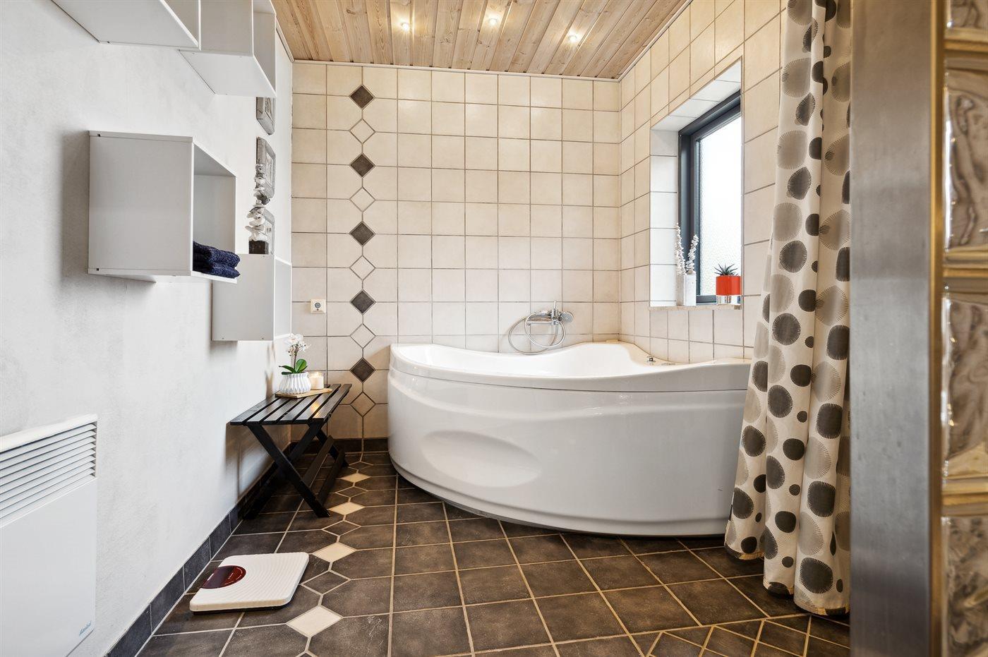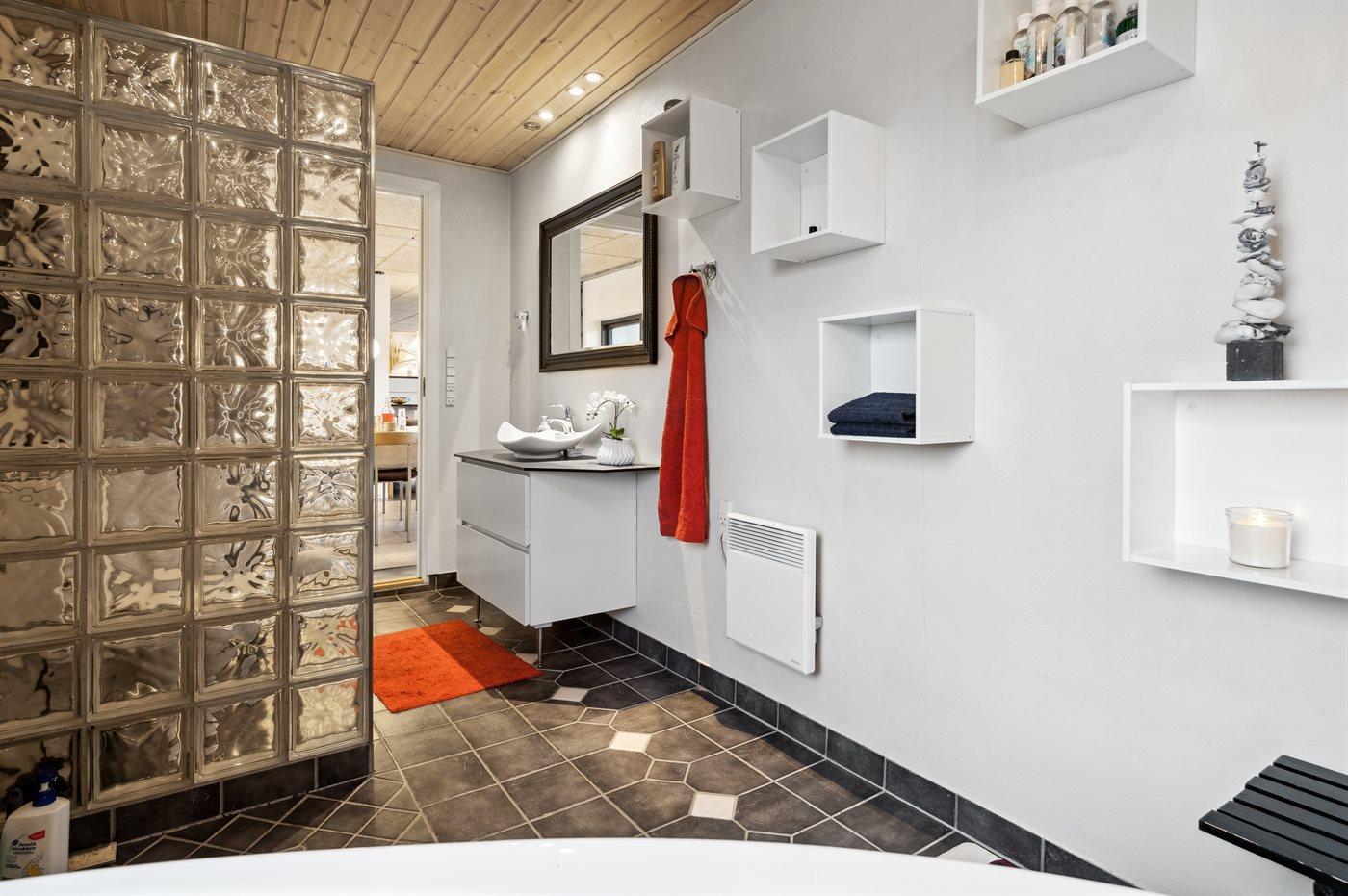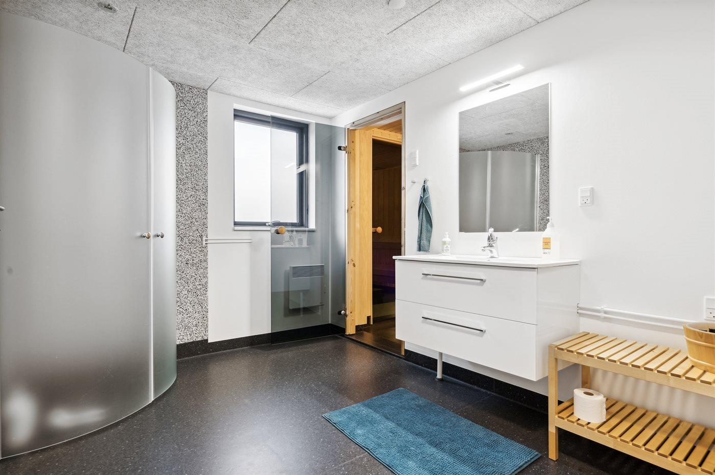 Der er 2 badeværelser med bruseniche og 2 toiletter. Der er gulvvarme på 1 badeværelse. I saunaen er der mulighed for afslapning.