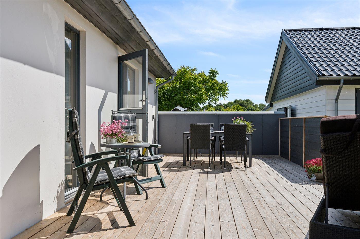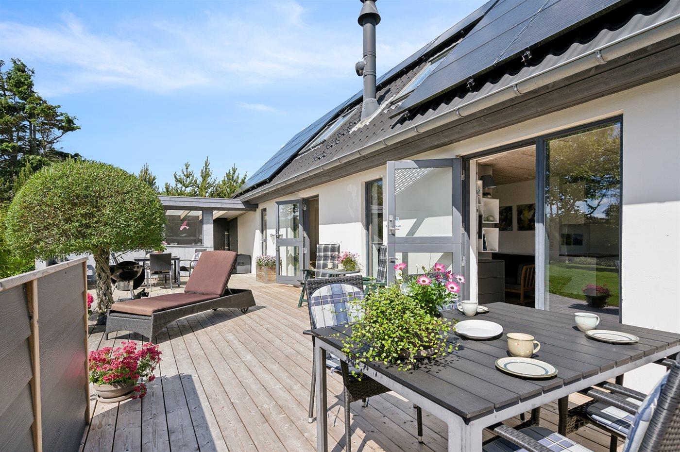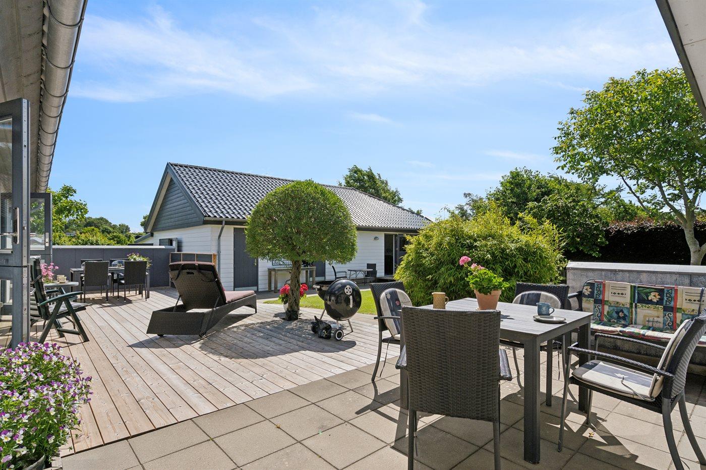 Den store og ugenerte terrasse er virkelig skøn og inviterer til mange timer i det fri - her er der altid mulighed for at finde en lækrog og nyde de skønne omgivelser. I forlængelse af den åbne terrasse findes en stor lukket terrasse, som i høj grad kan være med til at forlænge de skønne sommeraftener.