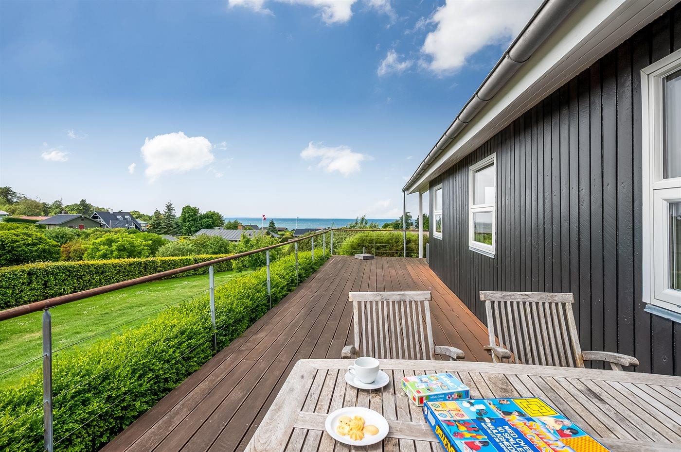Der findes skønne terrassearealer på flere sider af huset, som inviterer til mange timer i det fri - her er der altid mulighed for at finde en lækrog og nyde de dejlige omgivelser. En del af terrassen er tilmed overdækket, så der i høj grad er mulighed for at forlænge de fine sommeraftener. Også herfra er udsigten utrolig flot og idet huset ligger højt gør det udsigten endnu bedre.