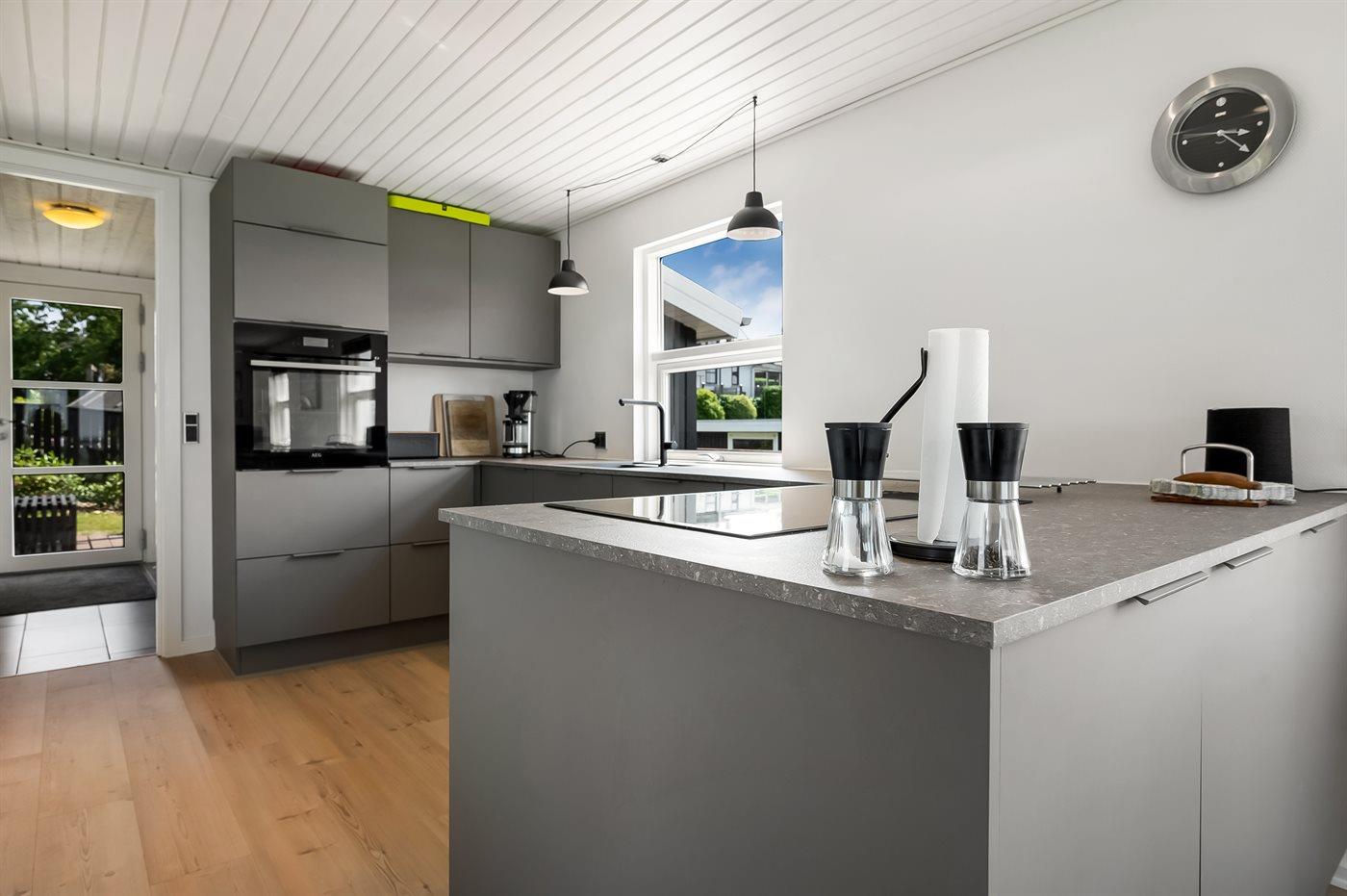Køkkenet er udstyret med 1 køleskab. Der er 4 induktionskogeplader, varmluftovn, mikrobølgeovn samt opvaskemaskine.