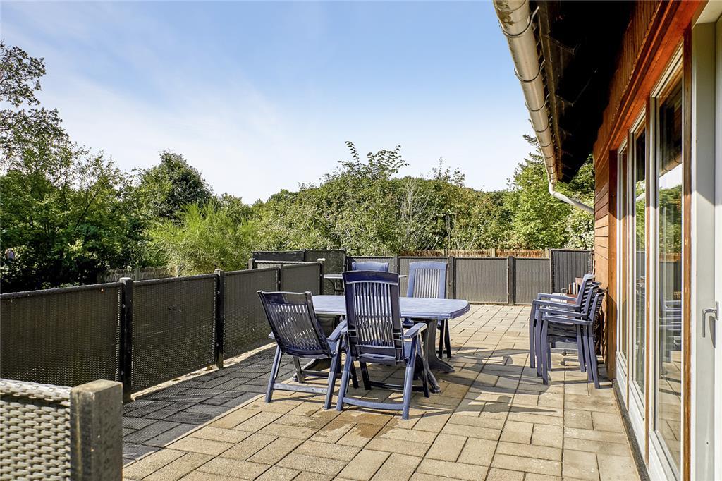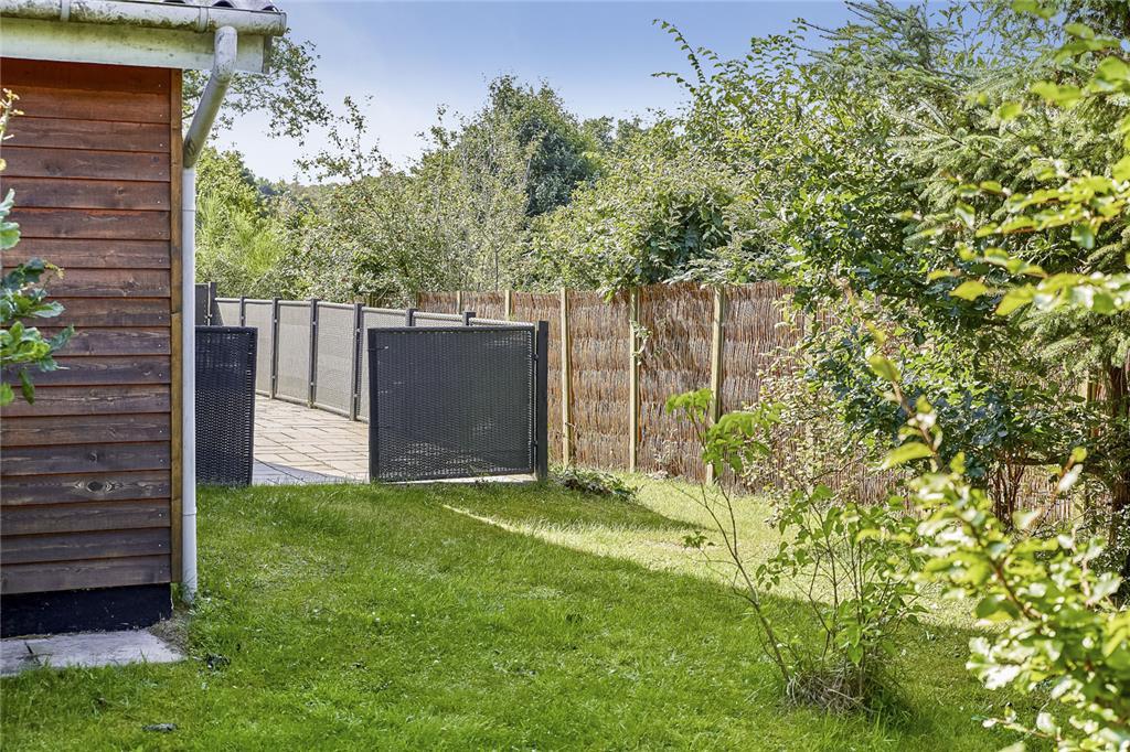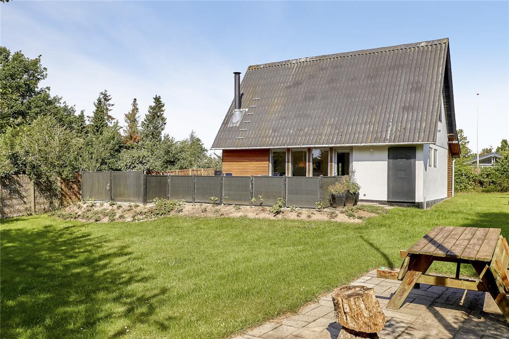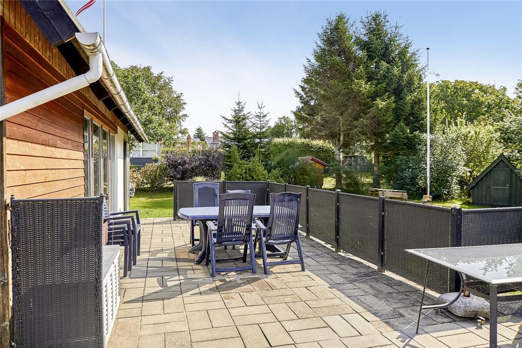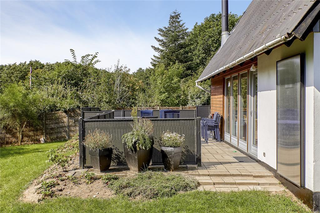 Udenfor åbenbarer sig en stor have, hvor græsset har set utallige barnefødder løbe hen over sig. På den rummelige terrasse kan du sidde uforstyrret og nyde solen fra morgen til aften, mens fuglene kvidrer i de omkringliggende træer. Her er det let at forestille sig en frokost med ternet dug, dugfriske jordbær og en let brise fra havet. Og kun 250 meter væk ligger stranden – et sted, hvor sandet stadig gemmer på skaller, og hvor børn med røde kinder har bygget sandslotte og badet i generationer.