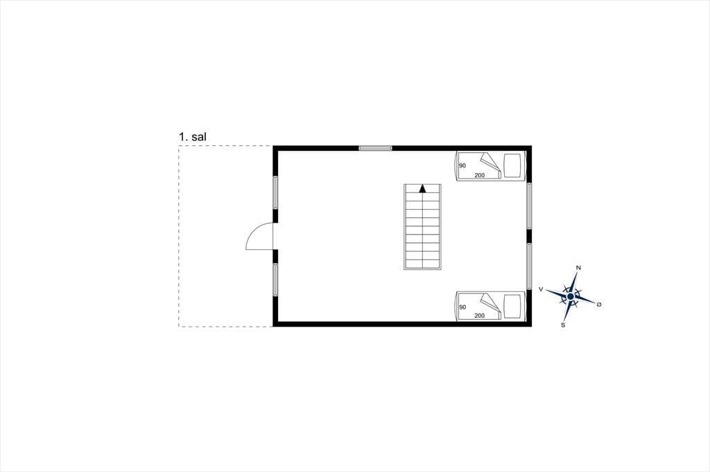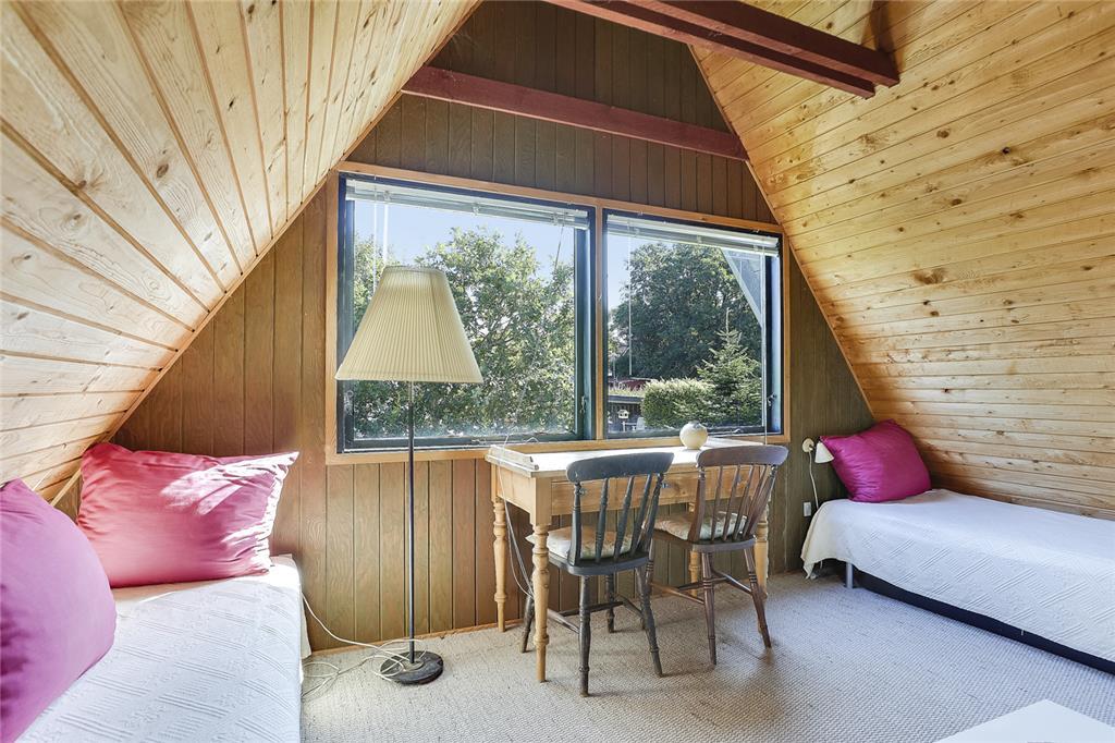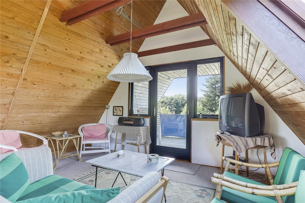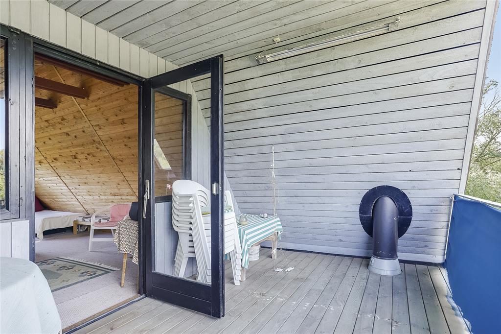 Fra stuen fører en trætrappe dig op til førstesalen. Her er et åbent, rummeligt opholdsrum, hvor du straks fornemmer den særlige ro, som kun et sommerhus som dette kan give. Heroppe er der endnu to sovepladser og en lille dør ud til en skøn altan. Når aftensolen går ned over Kattegat, kan du nyde synet med et tæppe om skuldrene og en kop varm te – præcis som i de gode, gamle dage.