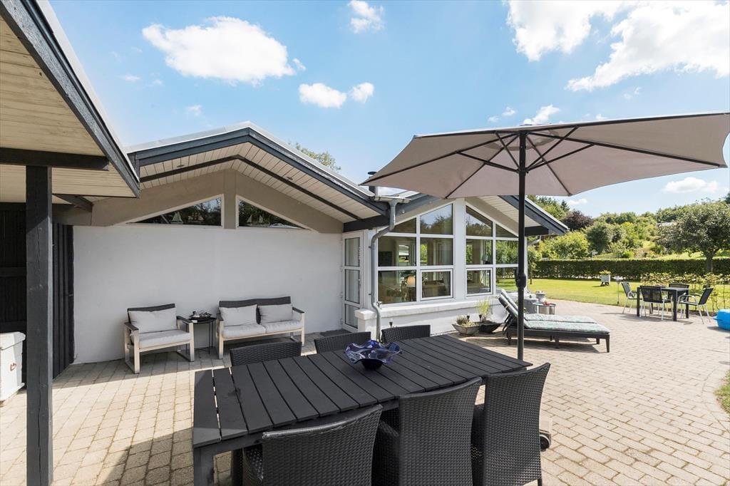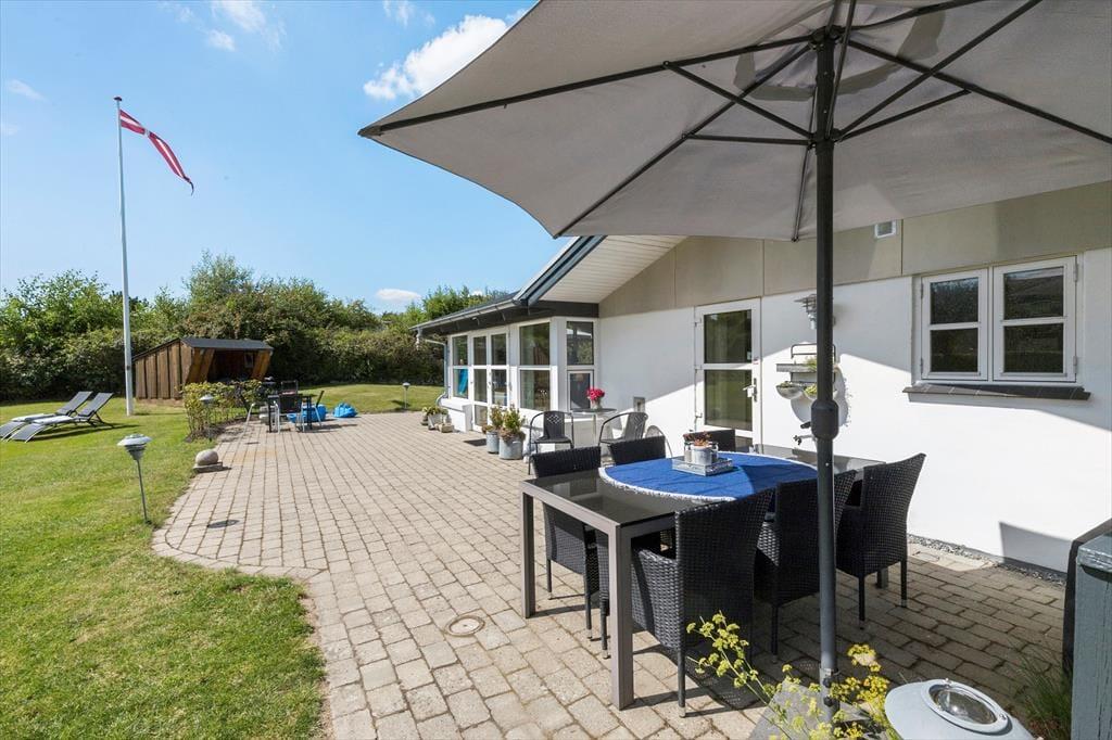 Den store græsplæne breder sig ud foran dig, og det eneste du hører, er fuglene, der synger og vinden, der leger med træernes blade. Her er god plads til at spille en omgang voksenfrisbee, mens børnene hopper på trampolinen eller bygger sandslotte i den fine sandkasse. En af de bedste måder at nyde ferien på er at slappe af i solen, og på de flere terrasser omkring huset er der rig mulighed for det. Fra morgen til aften kan du finde et sted at sidde og bare være. Måske med en god bog i hånden, eller måske med en kold drink, mens grillen bliver varm til en uforglemmelig middag under åben himmel. Hvis du virkelig vil komme tæt på naturen, så vent til natten falder på og søg mod det nybyggede shelter. Forestil dig, at du ligger der, under stjernerne, langt væk fra hverdagens stress og jag, mens du lytter til nattens lyde og børnenes åndedræt. Husk blot at medbringe din egen sovepose eller dyne, da husets dyner ikke kan benyttes her – det er din chance for at sove helt tæt på naturen.