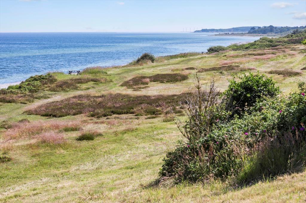 Nyd livet udenfor: Udendørs venter en oase af ren fornøjelse på dig. Den uforglemmelige terrasse er en sand perle, hvor du kan nyde et glas vin og livet i de behagelige loungemøbler, mens du lader dig forføre af havet og solnedgangen mod vest. Når mørket falder på, er der intet som at samles omkring det knitrende bålsted under stjernehimlen. Trænger du til en dukkert i bølgen blå, skal du bare tage dit håndklæde, spadsere 50 meter ad lille sti over grunden og ned ad trappen, så står du med tæerne i vandet. Her er så smukt.