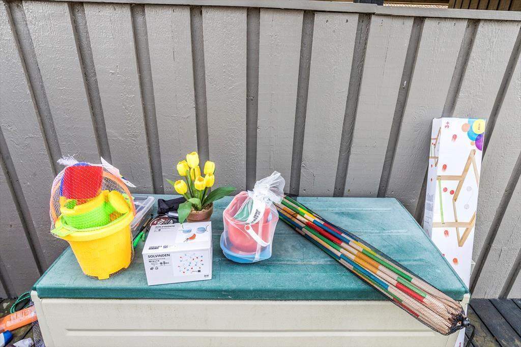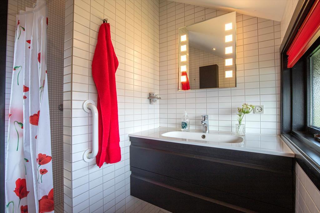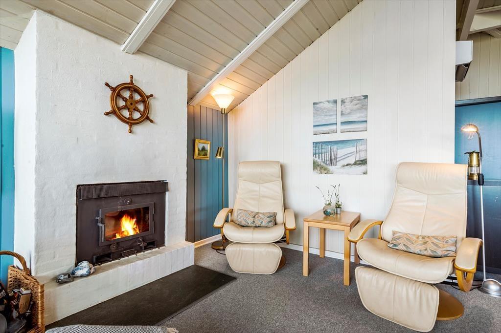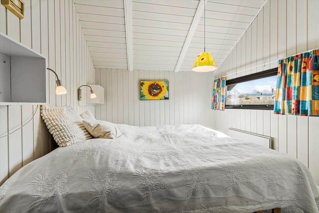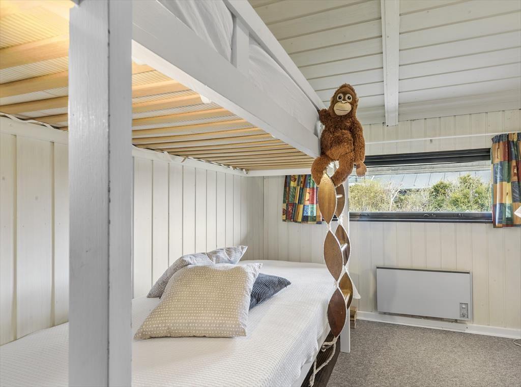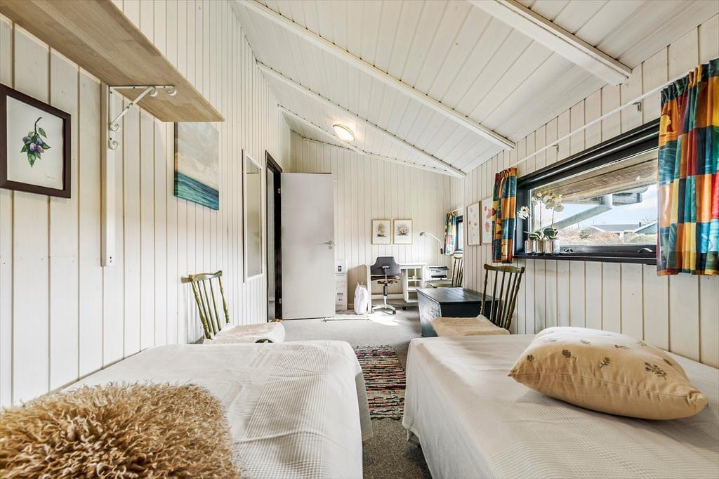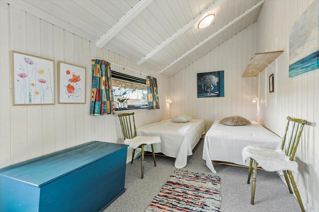 Indenfor finder I tre hyggelige soveværelser: et med dobbeltseng, et med to enkeltsenge og skrivebordsplads – og et charmerende børneværelse med køjeseng, hvor godnathistorier bliver endnu mere magiske. Badeværelset er lyst og funktionelt, og i entréen er der plads til strandtasker, gummistøvler og regnjakker, hvis vejret skulle drille en enkelt dag. I skuret står vaskemaskinen og tørretumbleren klar til at gøre det praktiske nemt.