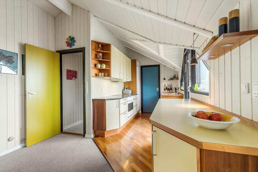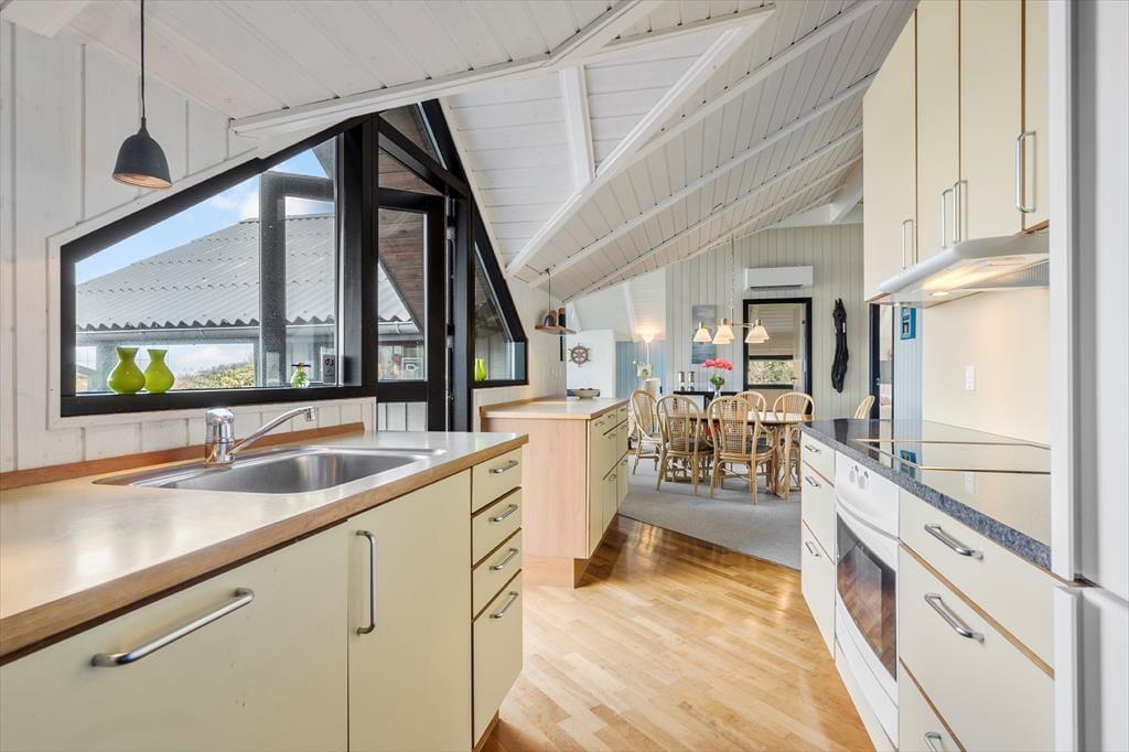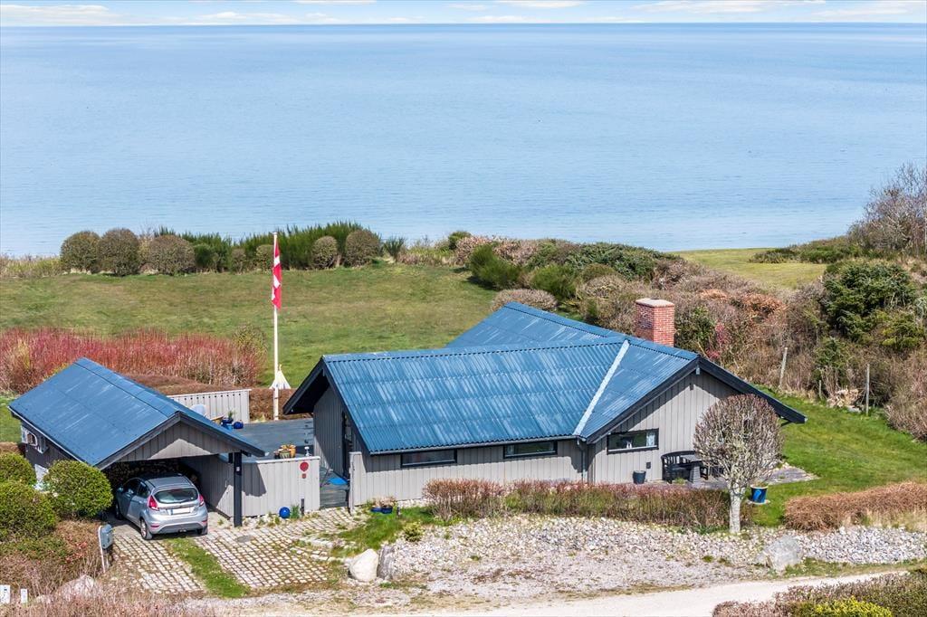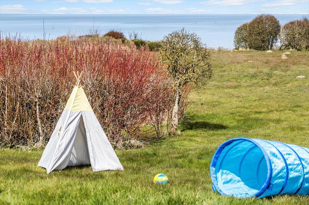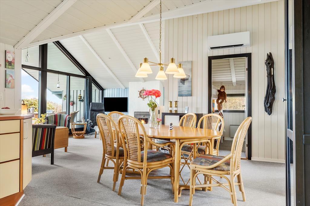 Dette sommerhus er som skabt til familiens ferieminder. Det ligger helt unikt i første række til vandet, og her er både rum og ro til at slappe af og være sammen. Det lyse køkken-alrum og stuen samler jer omkring fælles måltider, spil og snakke – alt sammen med udsigt til den smukke naturgrund og havet, der altid er i bevægelse.