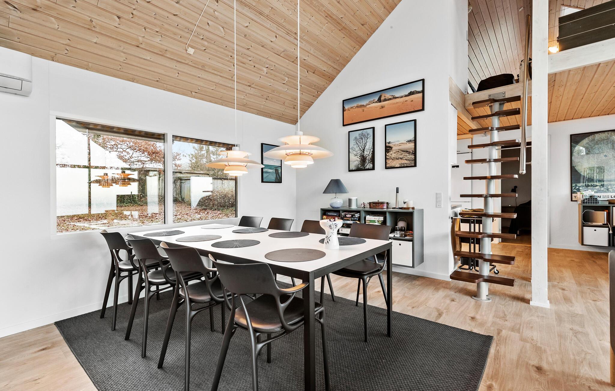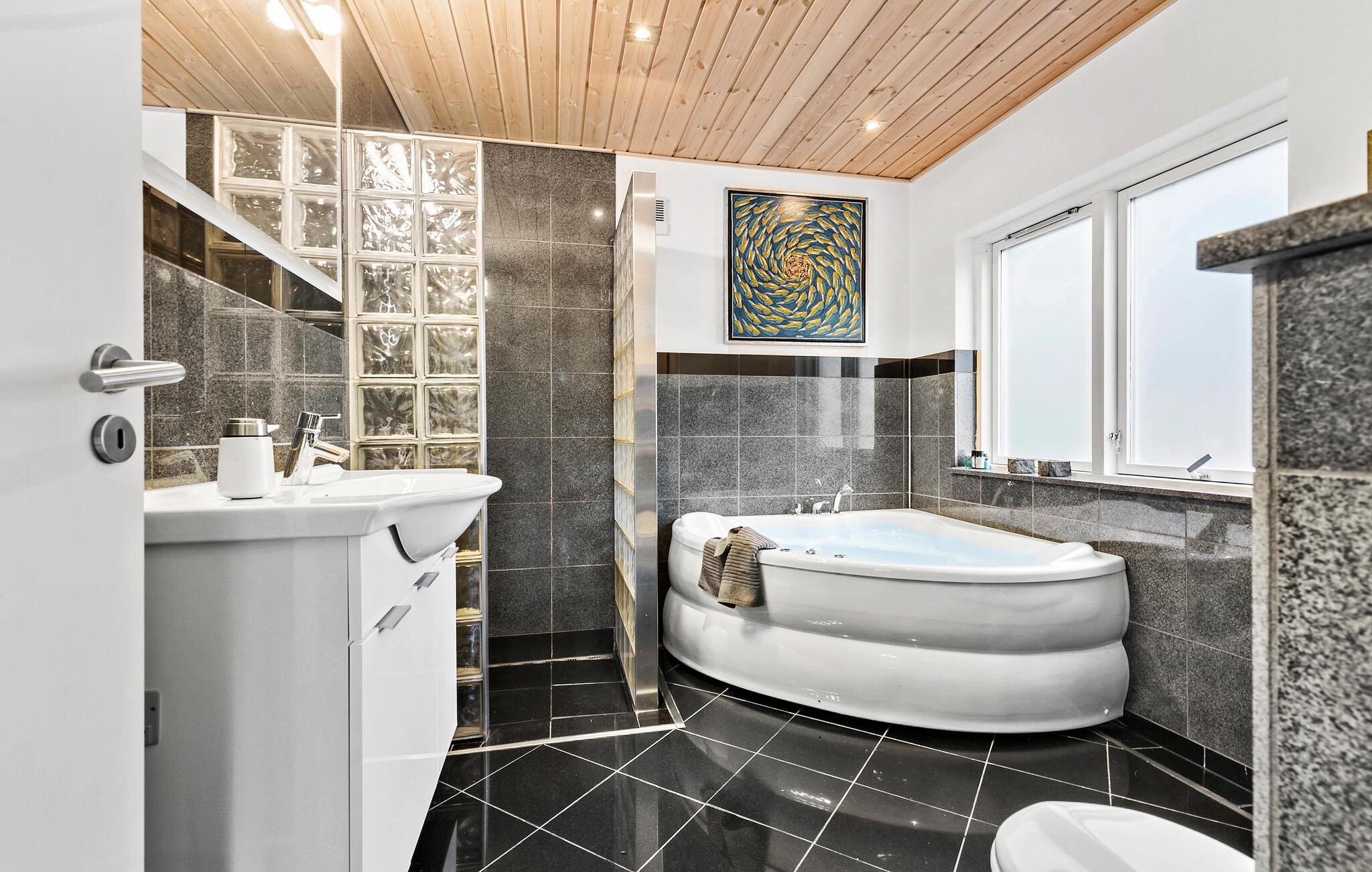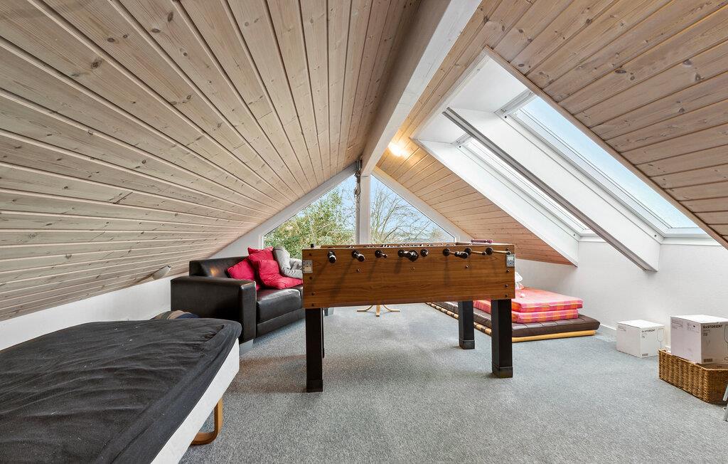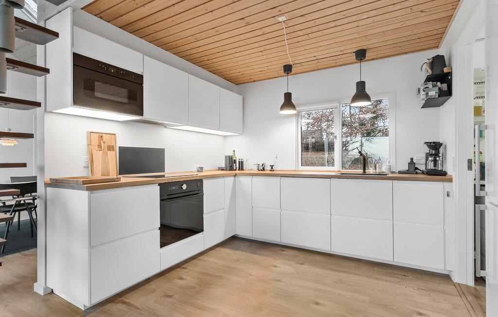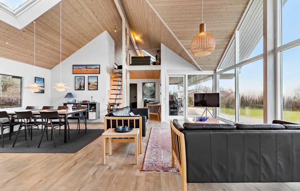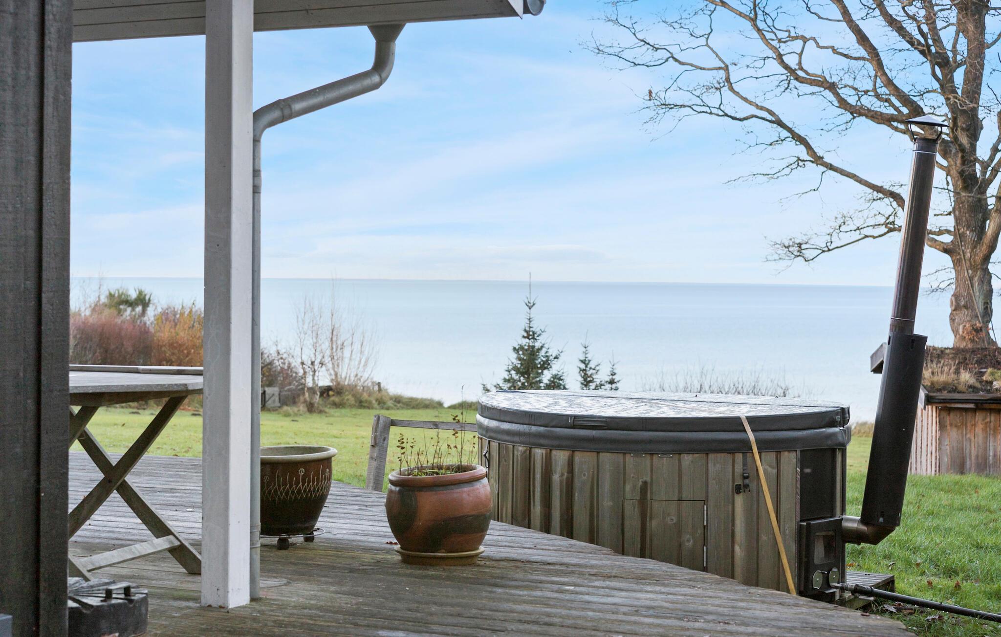 Udenfor er der en rummelig træterrasse, hvor I kan nyde havbrisen, mens I spiser morgenmad i solen. Glæd jer til afslappende timer i spabadet, mens I ser børnene lege i den rummelige have. Tilbring varme sommeraftener med at grille i det fri og lytte til havets brusen.