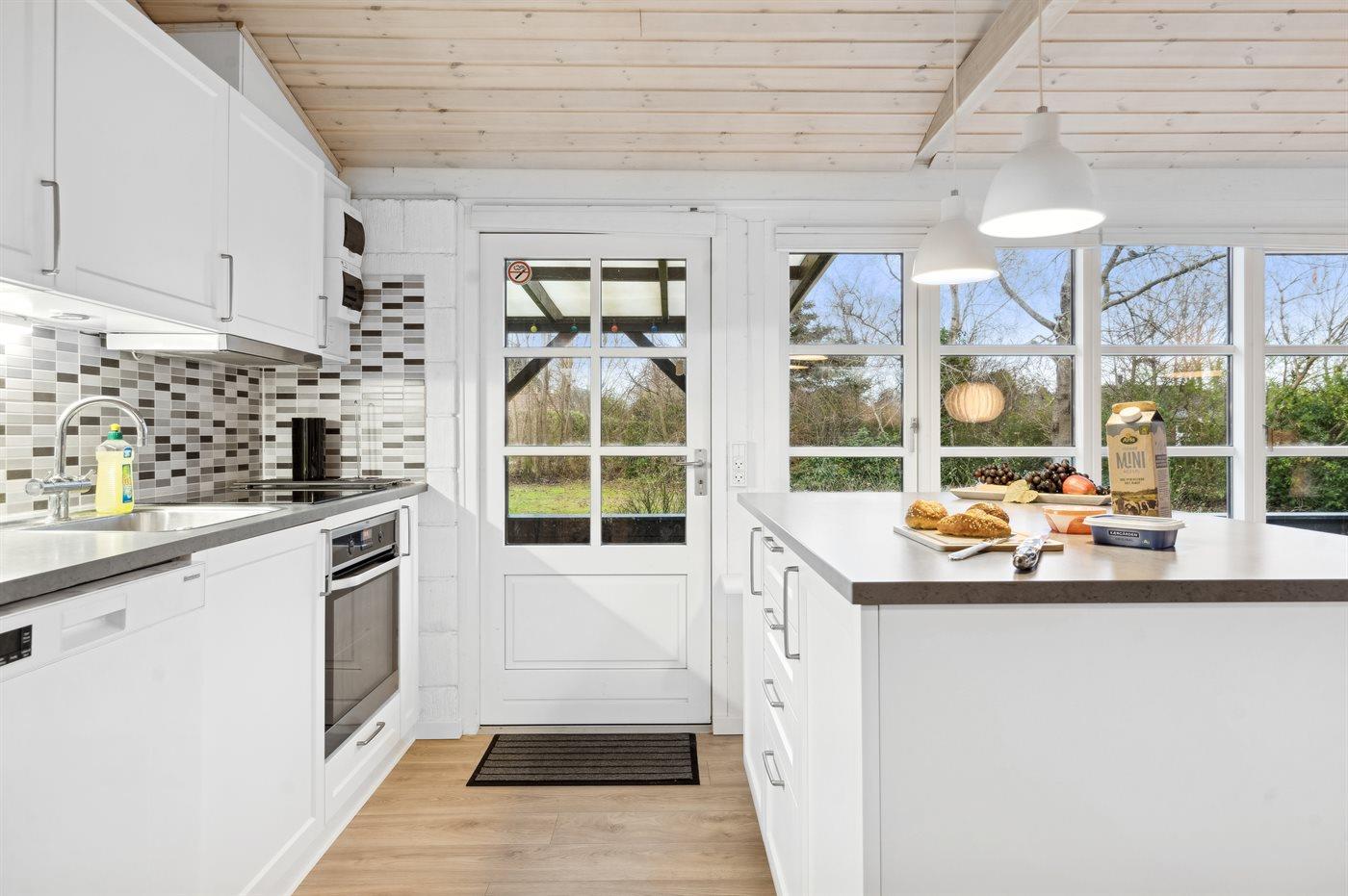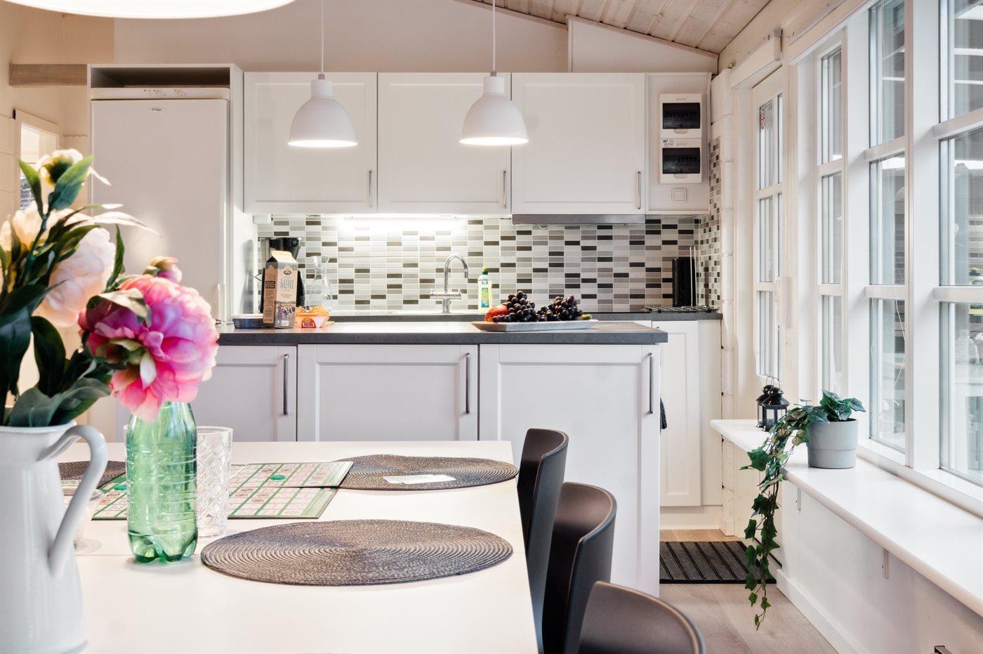 Køkkenet er udstyret med 1 køleskab. Der er 4 keramiske kogeplader, bageovn samt opvaskemaskine.