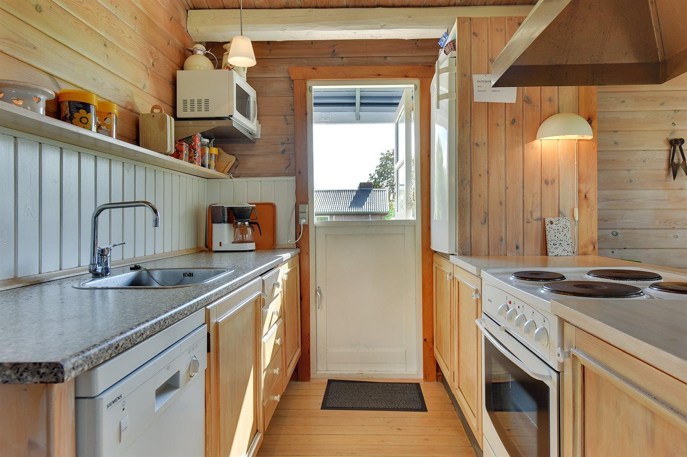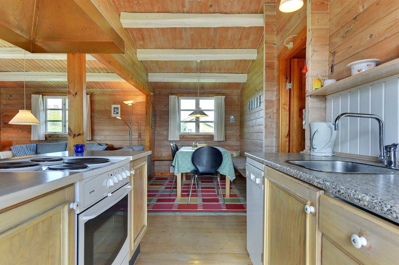 Køkkenet er udstyret med 1 køleskab. Der er 4 keramiske kogeplader, varmluftovn, mikrobølgeovn samt opvaskemaskine.