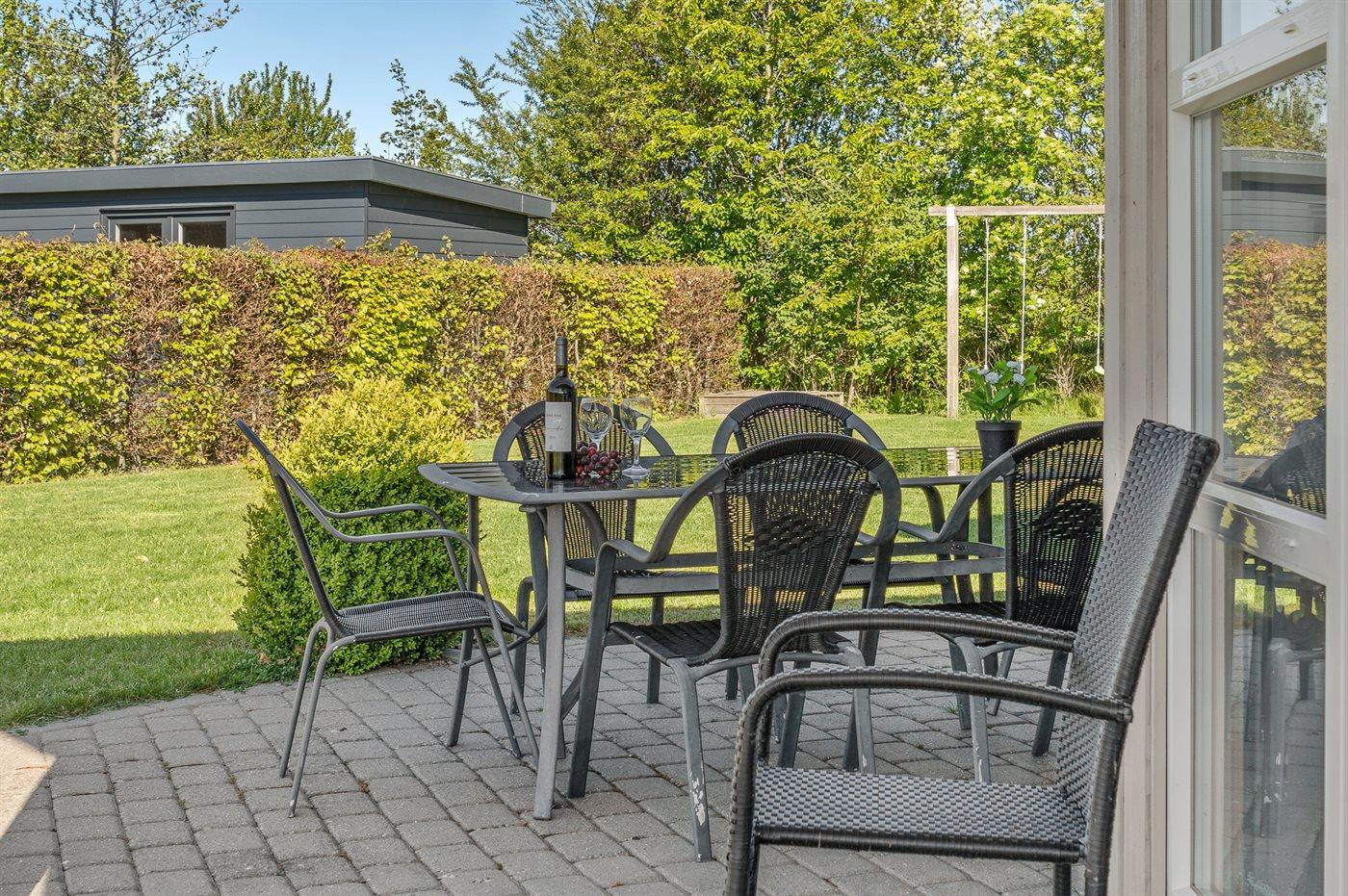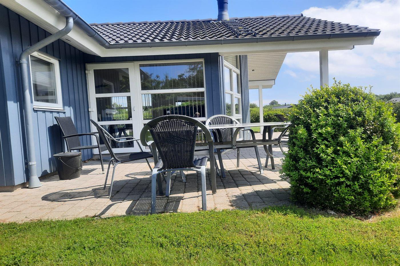 Ferieboligen er beliggende på en 1120 m² stor havegrund. Der er 700 m til havet. Nærmeste forretning er beliggende i en afstand af 2000 m. Til ferieboligen hører 50 m² terrasseareal. Desuden er der 18 m² overdækket terrasse. Gynge. Sandkasse. Grill til rådighed. Parkering ved ferieboligen.