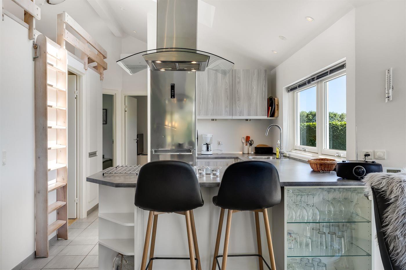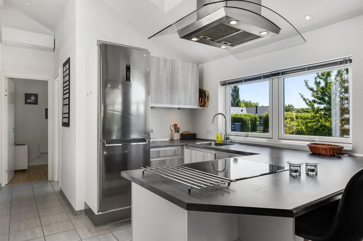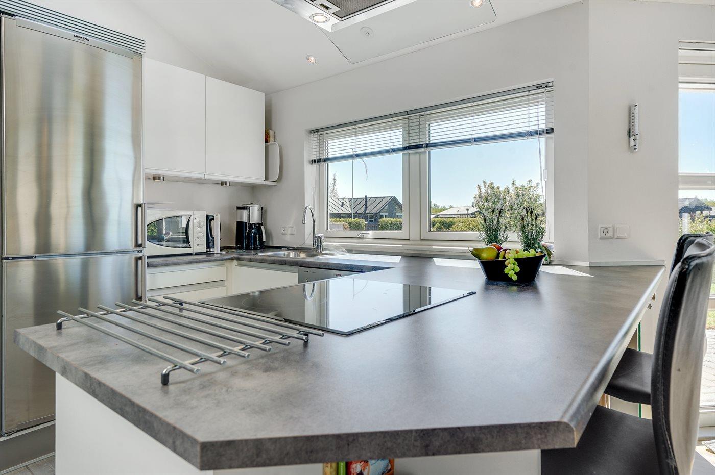 Køkkenet er udstyret med 1 køleskab. Der er 4 keramiske kogeplader, varmluftovn, mikrobølgeovn samt opvaskemaskine Der er gulvvarme i køkkenet.