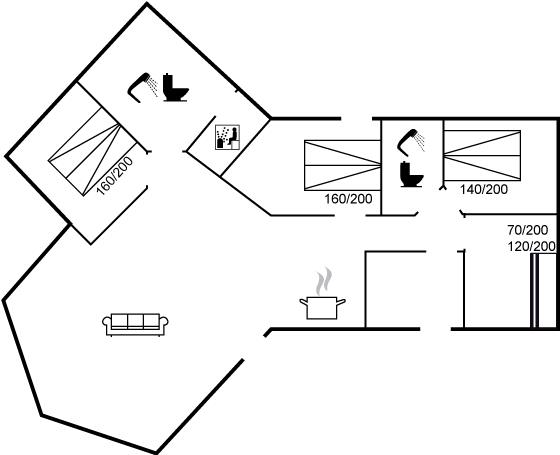 Der er i alt 4 soveværelser. Sovepladserne fordeler sig på: 6 sovepladser i dobbeltsenge. 2 sovepladser i køjeseng. 2 sovepladser på madrasser. 2 af disse sovepladser befinder sig på husets hems. Derudover er der 1 stk. barneseng.