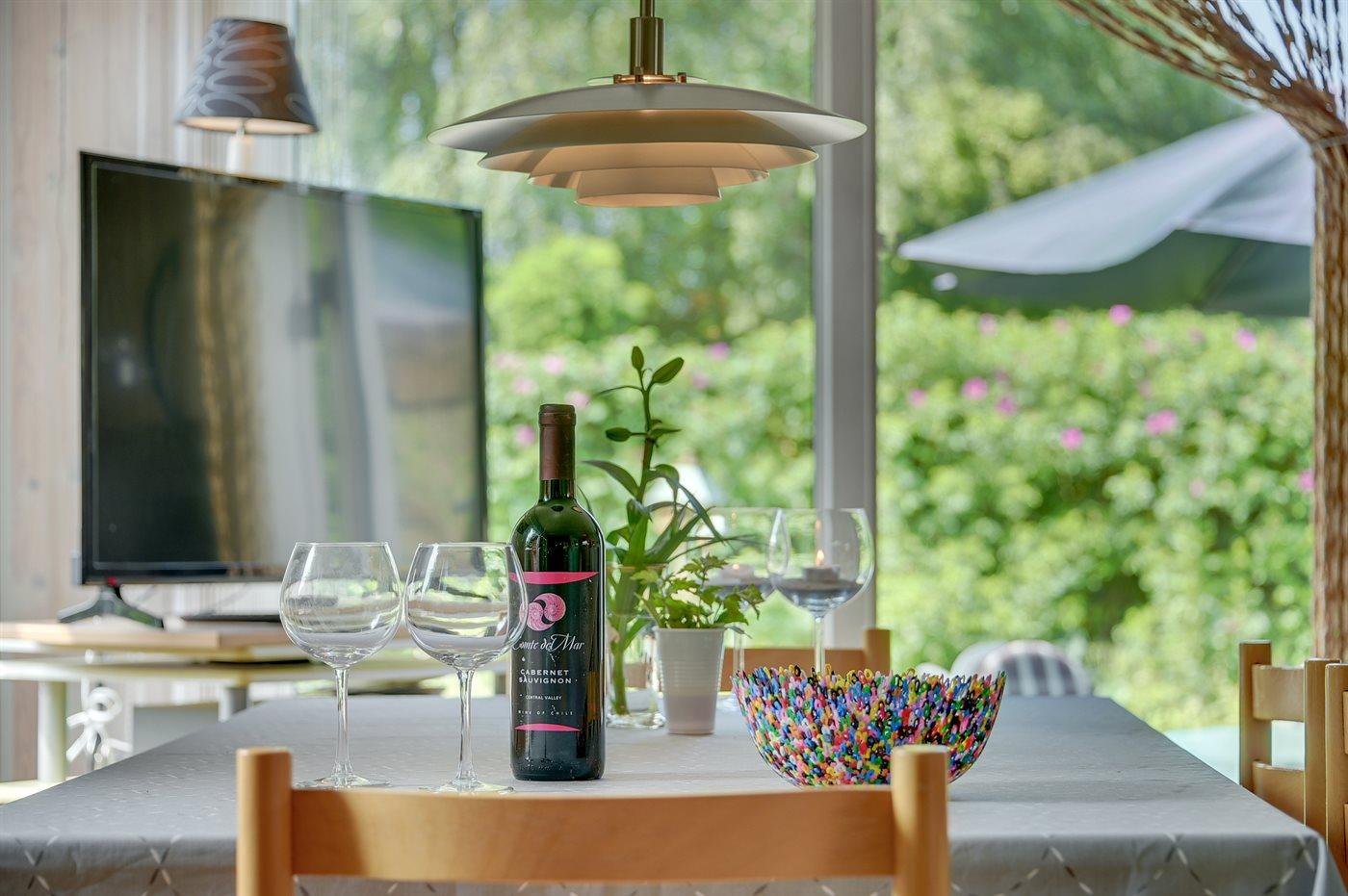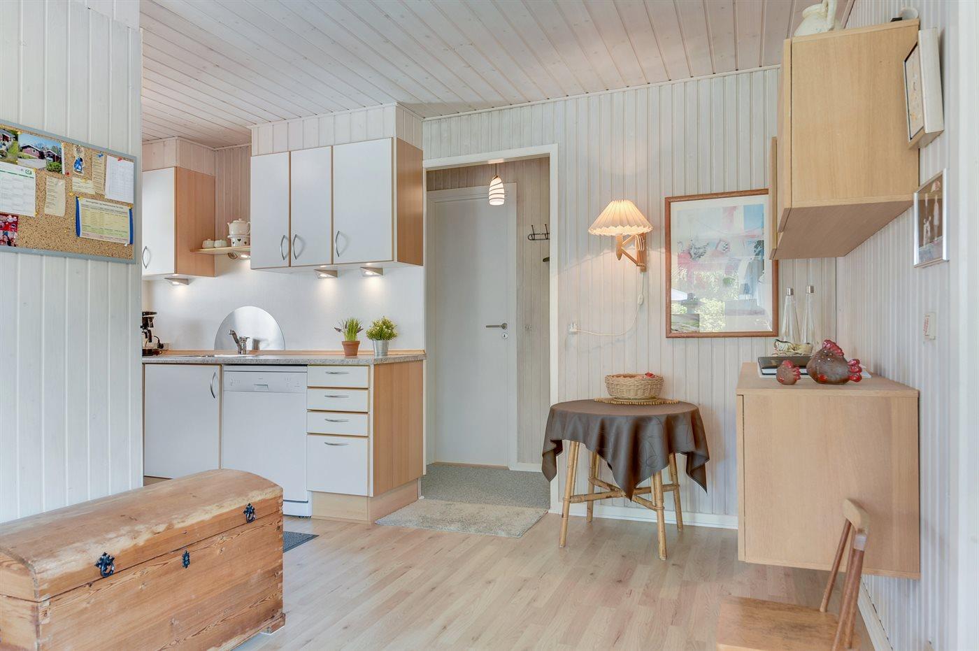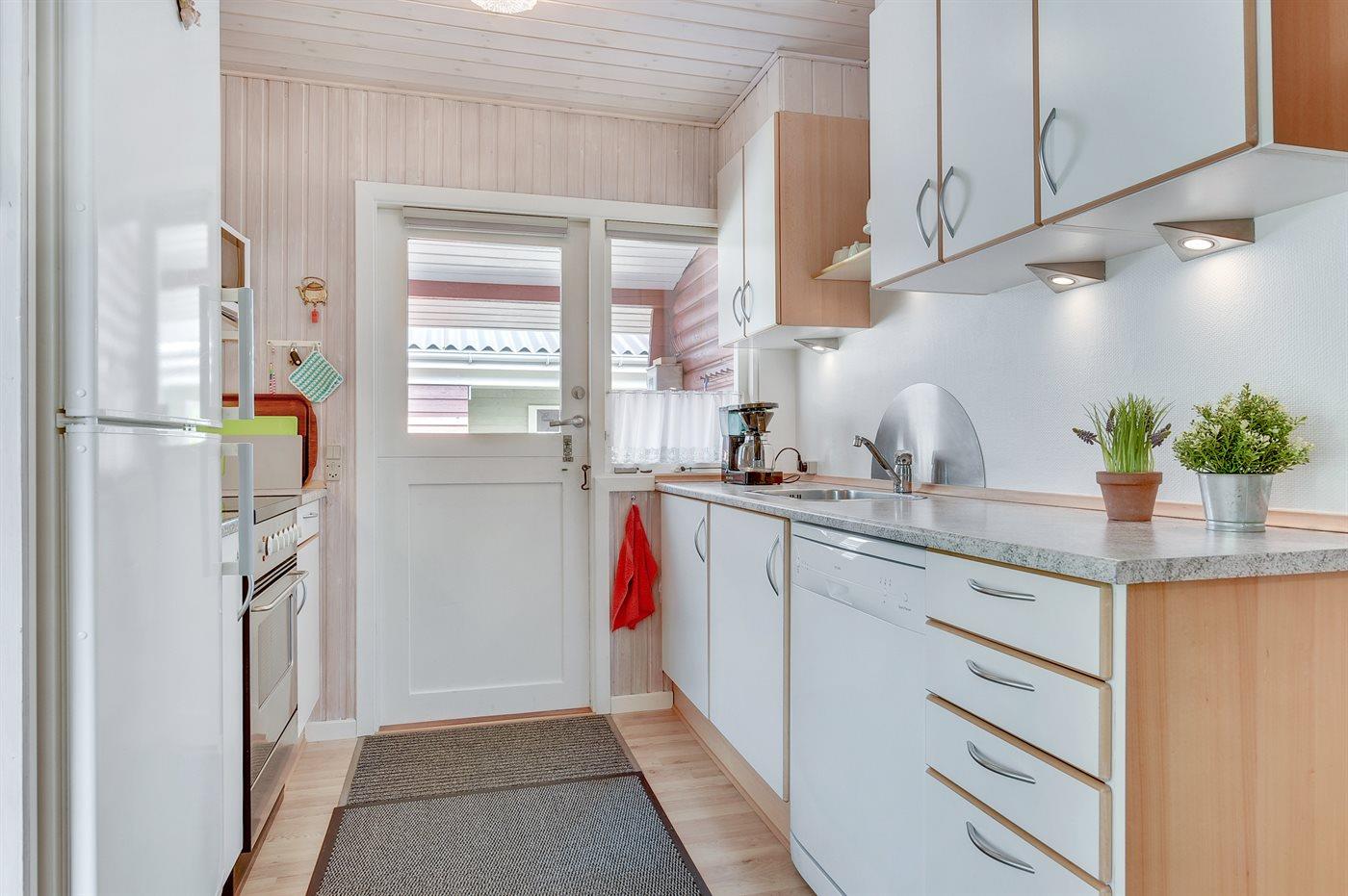 Køkkenet er udstyret med 1 køleskab. Der er 4 keramiske kogeplader, varmluftovn, mikrobølgeovn samt opvaskemaskine.