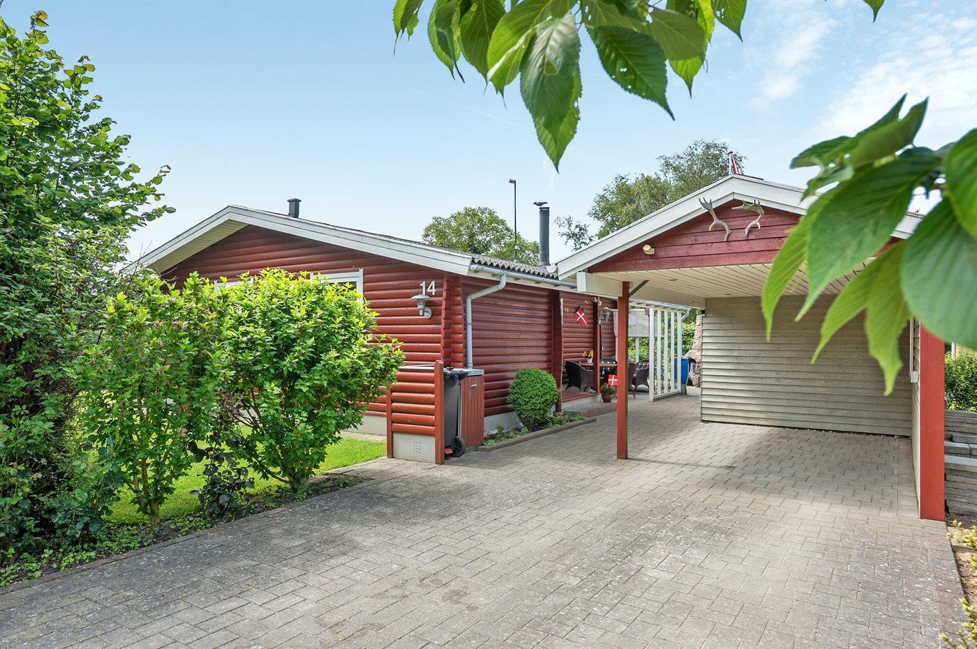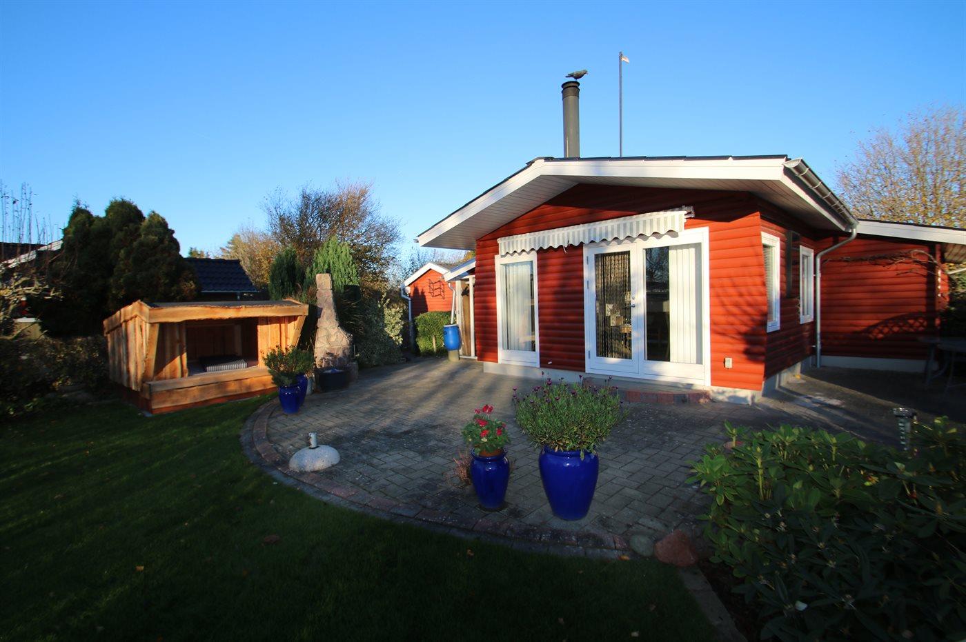 Ferieboligen er beliggende på en 864 m² stor havegrund. Der er 50 m til havet. Nærmeste forretning er beliggende i en afstand af 500 m. Til ferieboligen hører 45 m² terrasseareal. Desuden er der 18 m² overdækket terrasse. Der er redskabsrum. På lune aftener sørger en udendørs pejs for hyggelig stemning. Grill til rådighed. Der er carport til rådighed. Parkering ved ferieboligen.