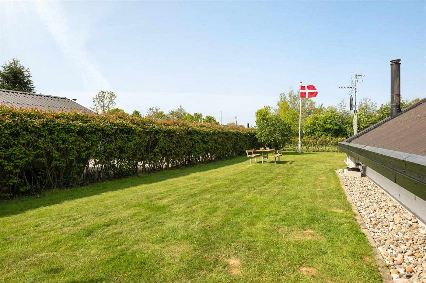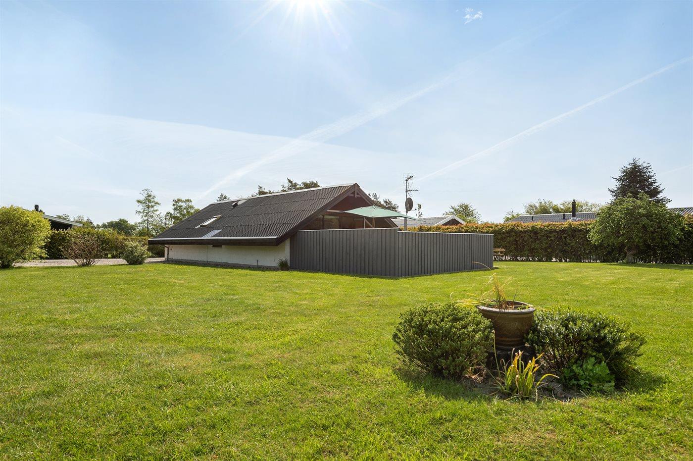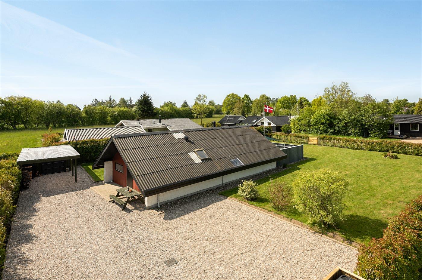 Ferieboligen er beliggende på en 820 m² stor naturgrund. Der er 400 m til havet. Nærmeste forretning er beliggende i en afstand af 2000 m. Til ferieboligen hører 50 m² terrasseareal. Heraf i alt 50 m² lukket terrasse. Grill til rådighed. Der er carport til rådighed. Parkering ved ferieboligen.