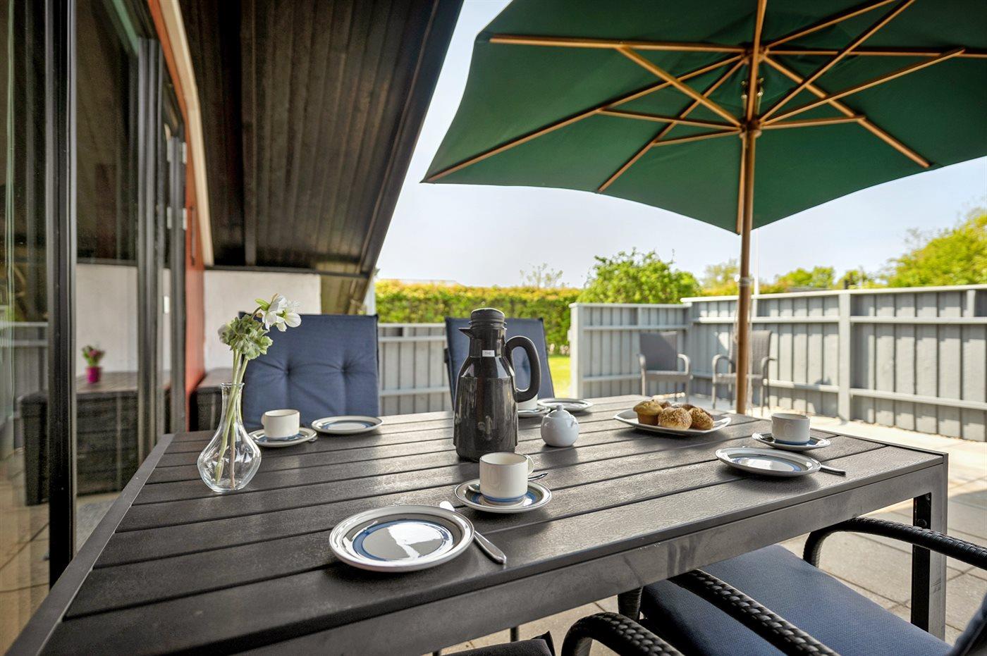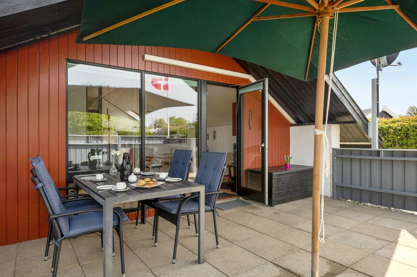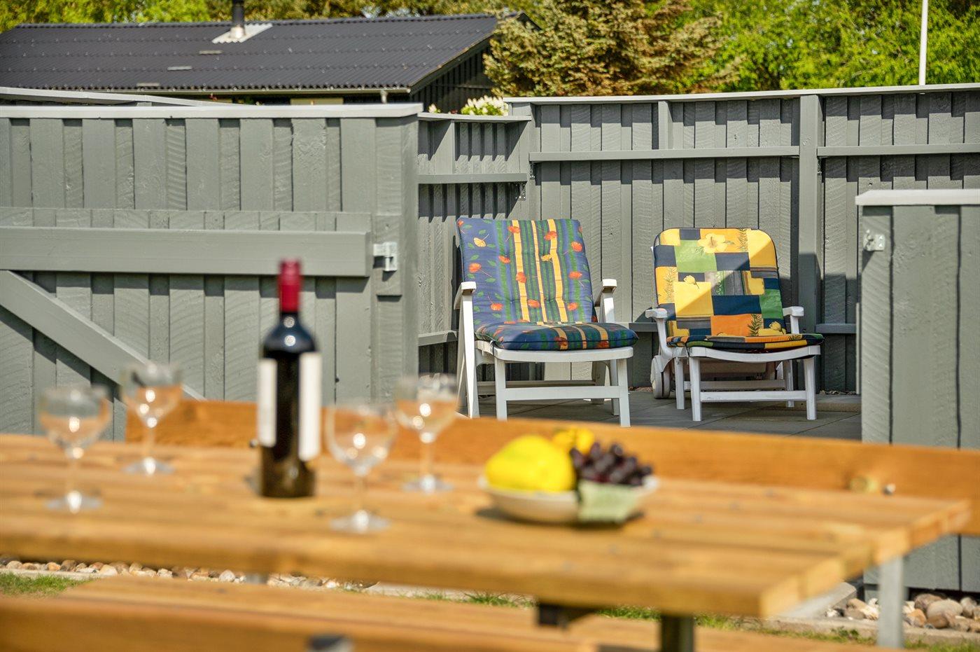 Ferieboligen er beliggende på en 820 m² stor naturgrund. Der er 400 m til havet. Nærmeste forretning er beliggende i en afstand af 2000 m. Til ferieboligen hører 50 m² terrasseareal. Heraf i alt 50 m² lukket terrasse. Grill til rådighed. Der er carport til rådighed. Parkering ved ferieboligen.