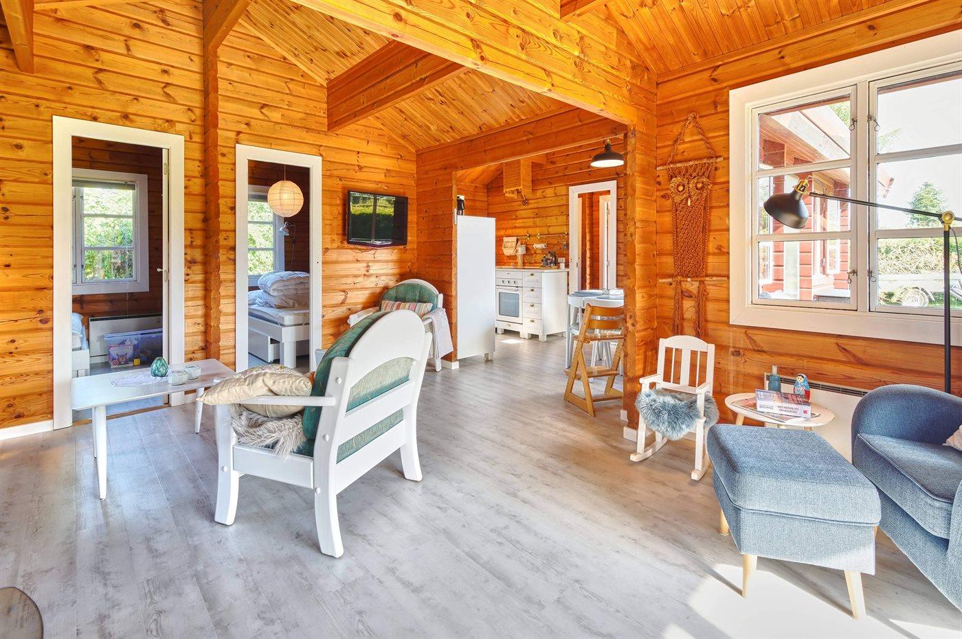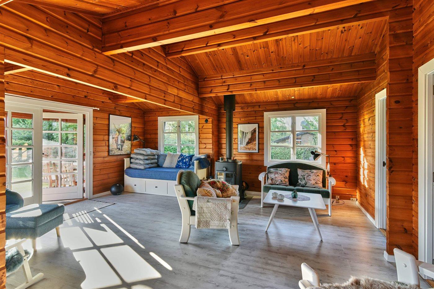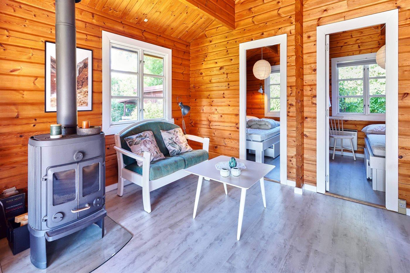 Ferieboligen er udstyret med energibesparende luft til luft varmepumpe, brændeovn og elvarme i værelser.