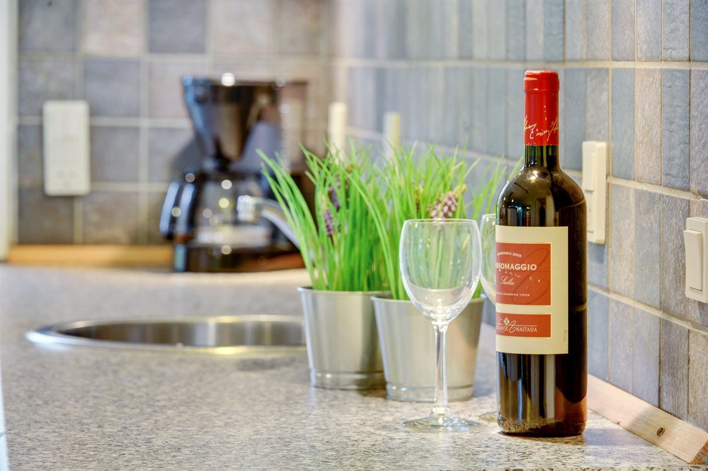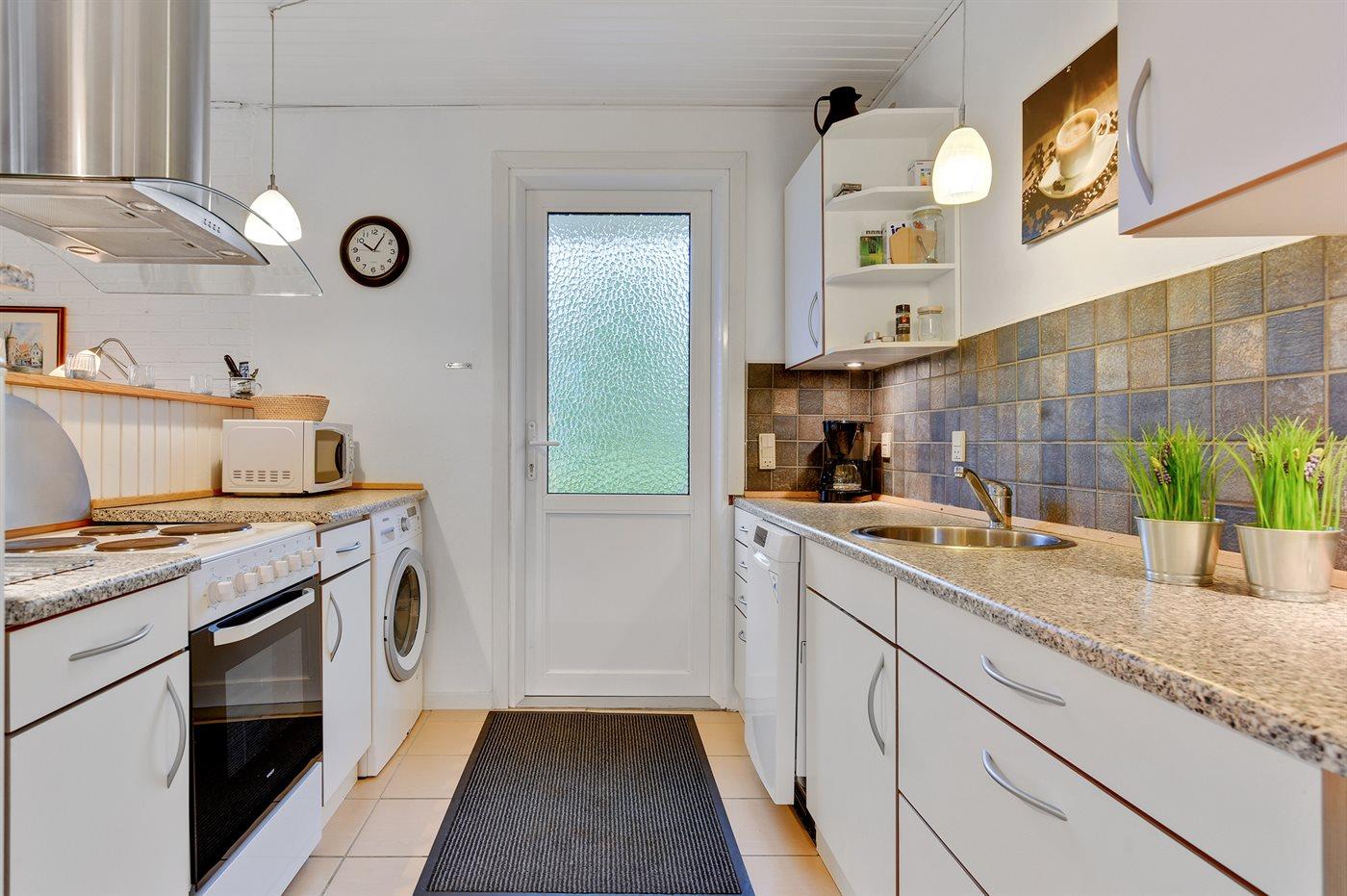 Køkkenet er udstyret med 1 køleskab. Der er 4 elkogeplader, mikrobølgeovn samt opvaskemaskine.