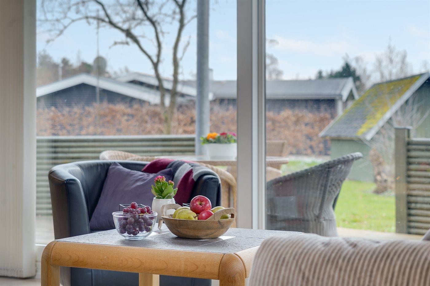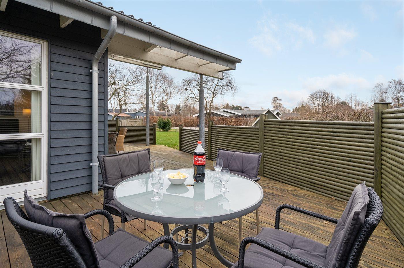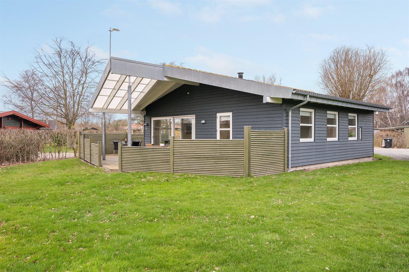 Ferieboligen er beliggende på en 850 m² stor havegrund. Der er 200 m til havet. Nærmeste forretning er beliggende i en afstand af 1500 m. Til ferieboligen hører lukket terrasse og til dels overdækket terrasse. Til ferieboligen hører åbent terrasseareal. Der er redskabsrum. Grill til rådighed. Der er carport til rådighed. Parkering ved ferieboligen.