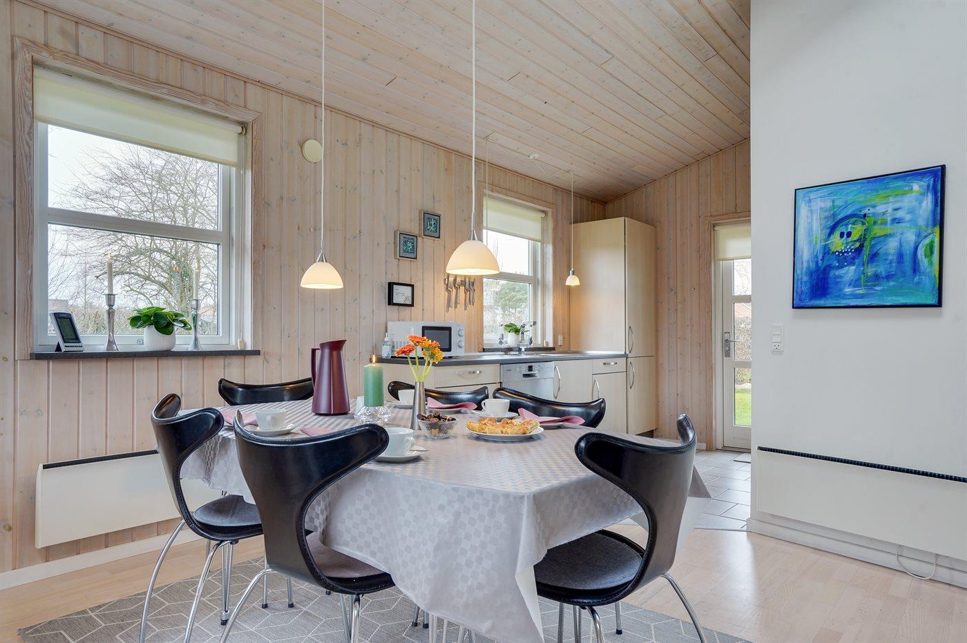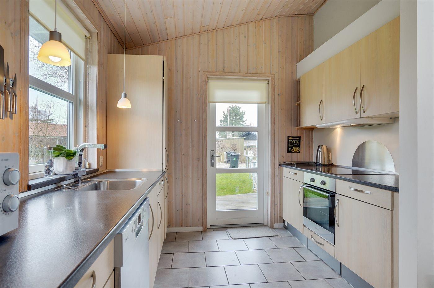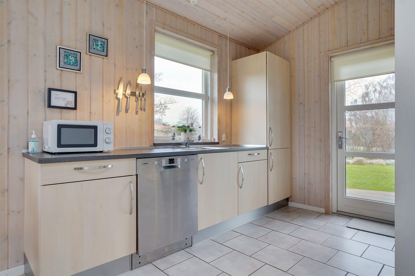 Køkkenet er udstyret med 1 køleskab. Der er 4 keramiske kogeplader, varmluftovn, mikrobølgeovn samt opvaskemaskine.