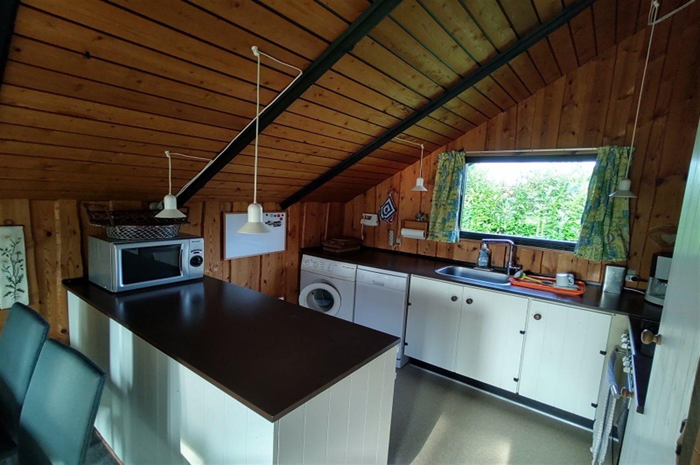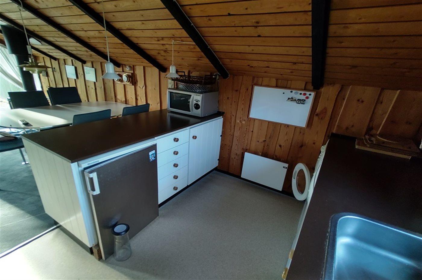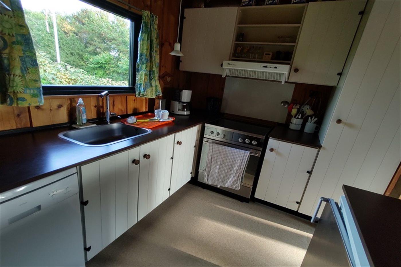 Køkkenet er udstyret med 1 køleskab. Der er 4 keramiske kogeplader, varmluftovn, mikrobølgeovn samt opvaskemaskine.