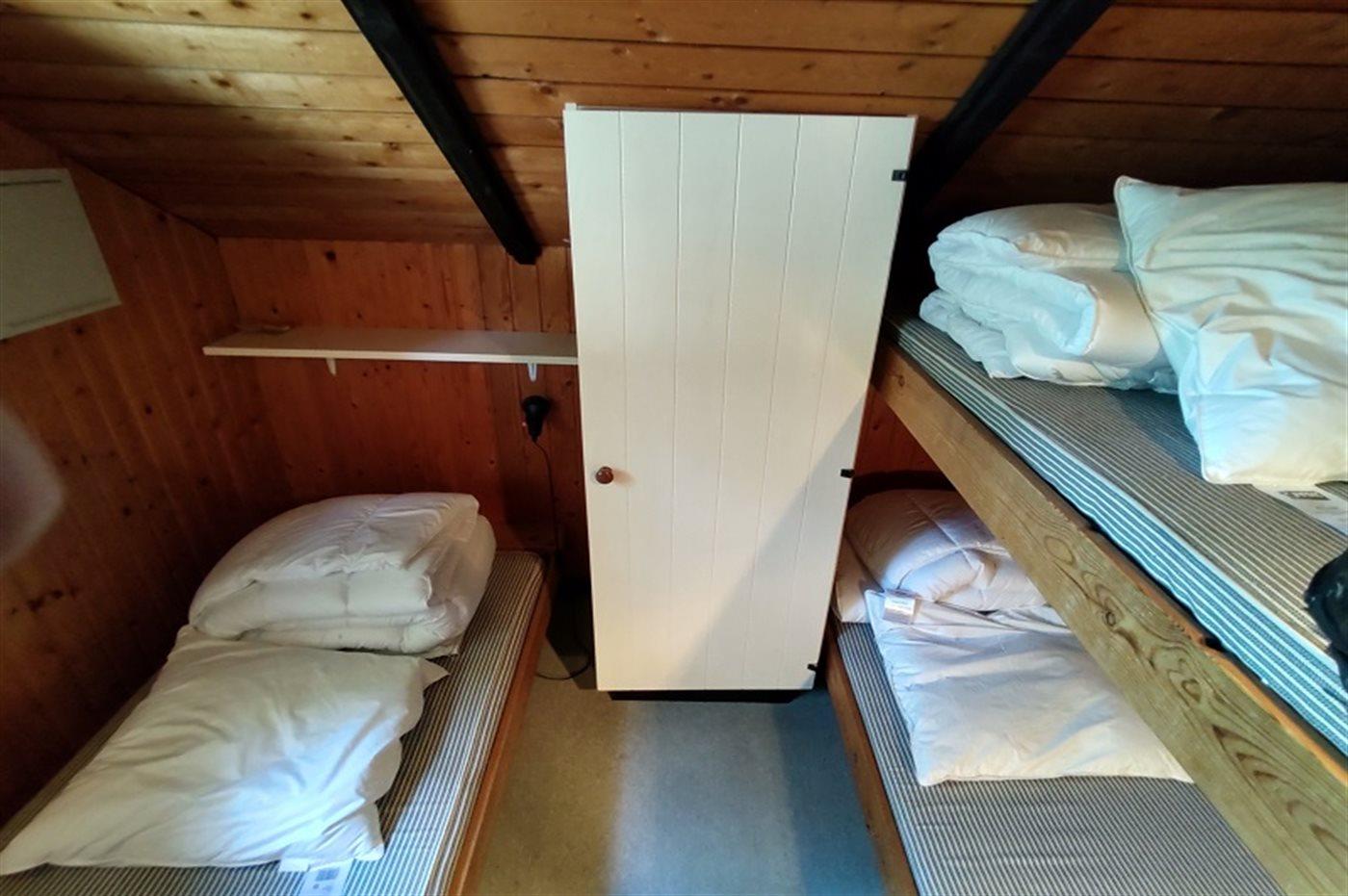 Der er i alt 2 soveværelser. Sovepladserne fordeler sig på: 1 soveplads i enkeltseng. 2 sovepladser i køjeseng.2 sovepladser i elevationssenge. Derudover er der 1 stk. barneseng.