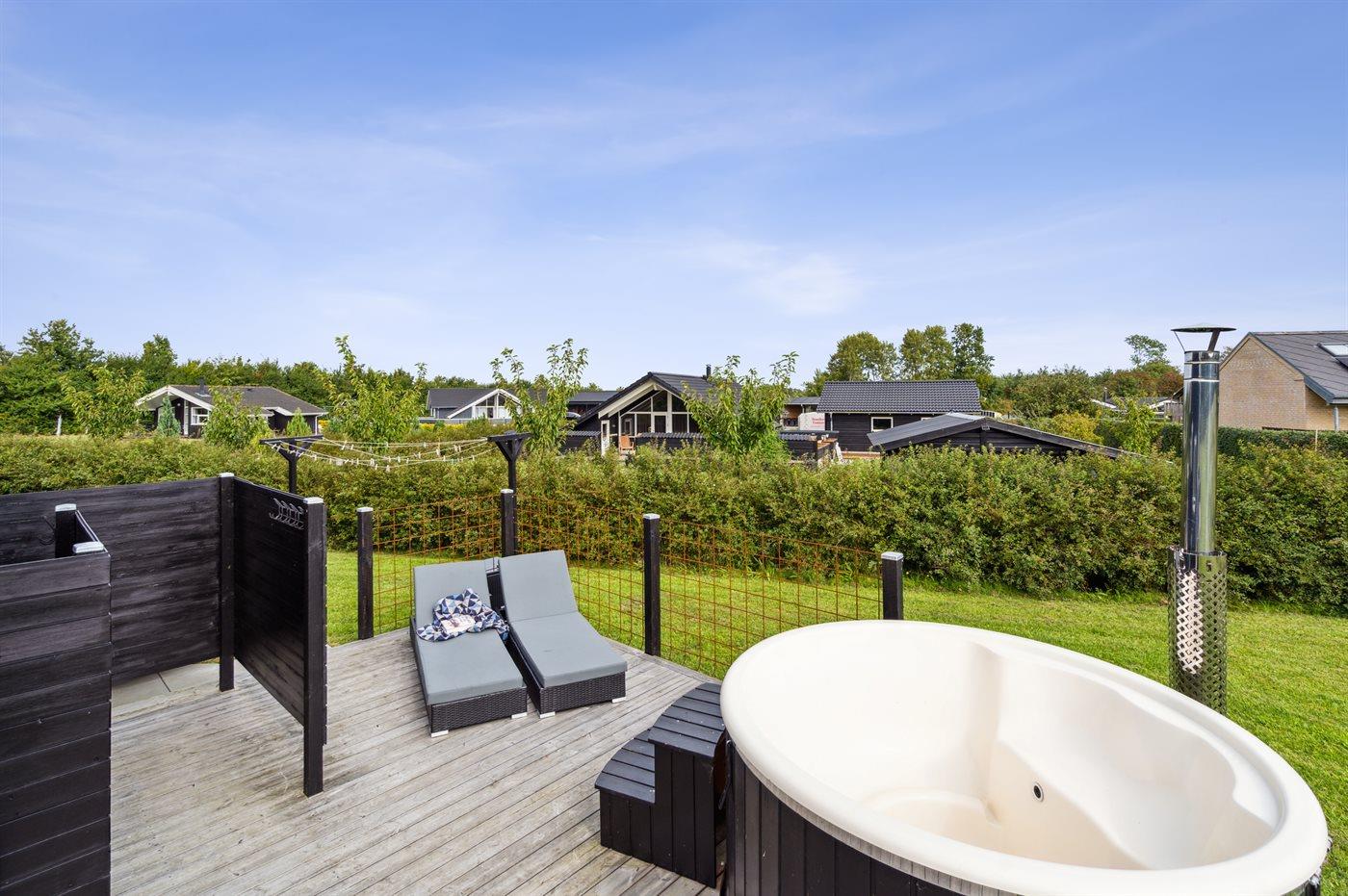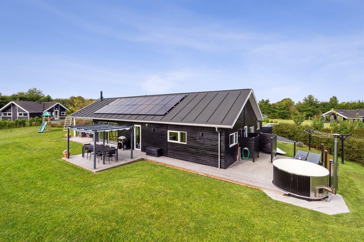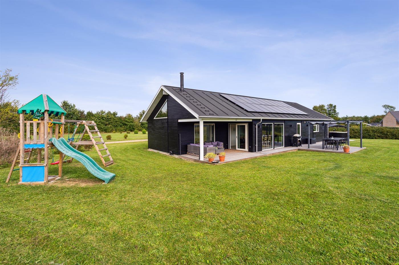 Moderne sommerhus fra 2022 nær Skovmose med spa, aktivitetsrum og stor naturgrund.