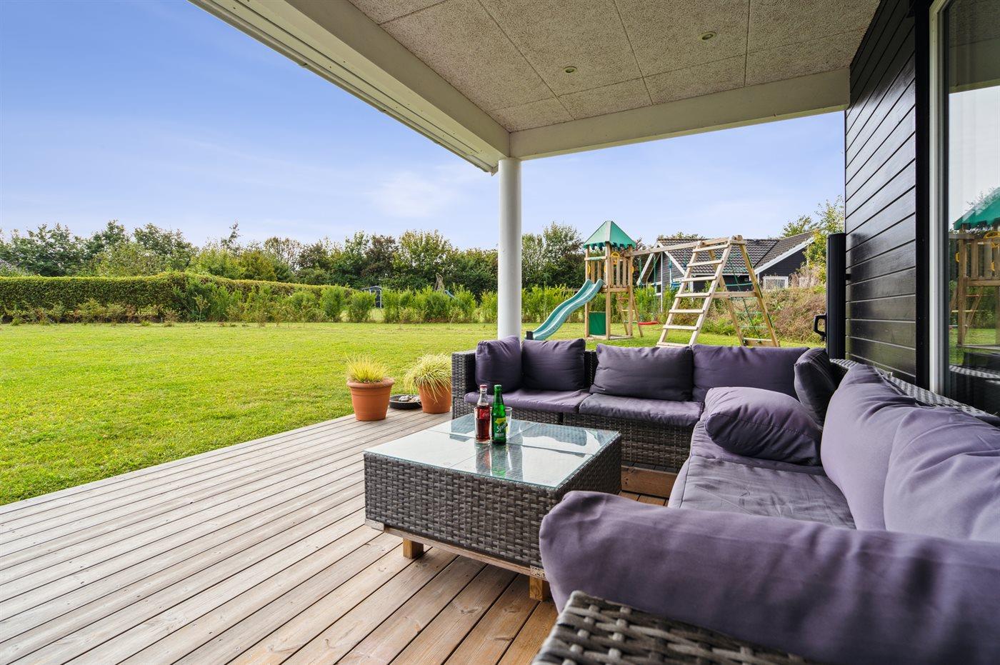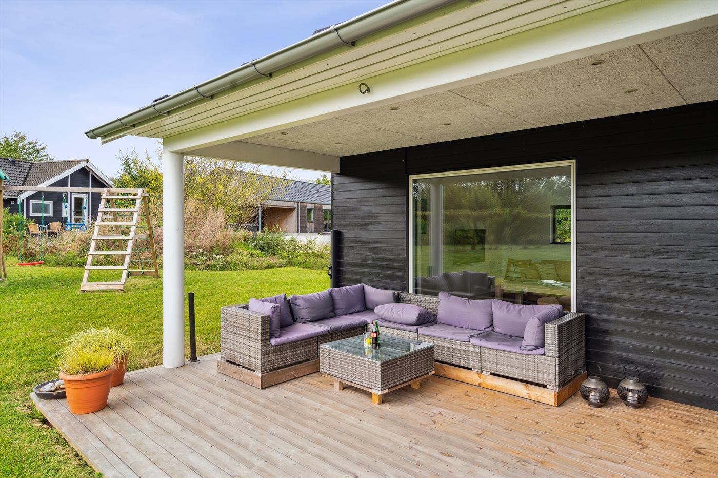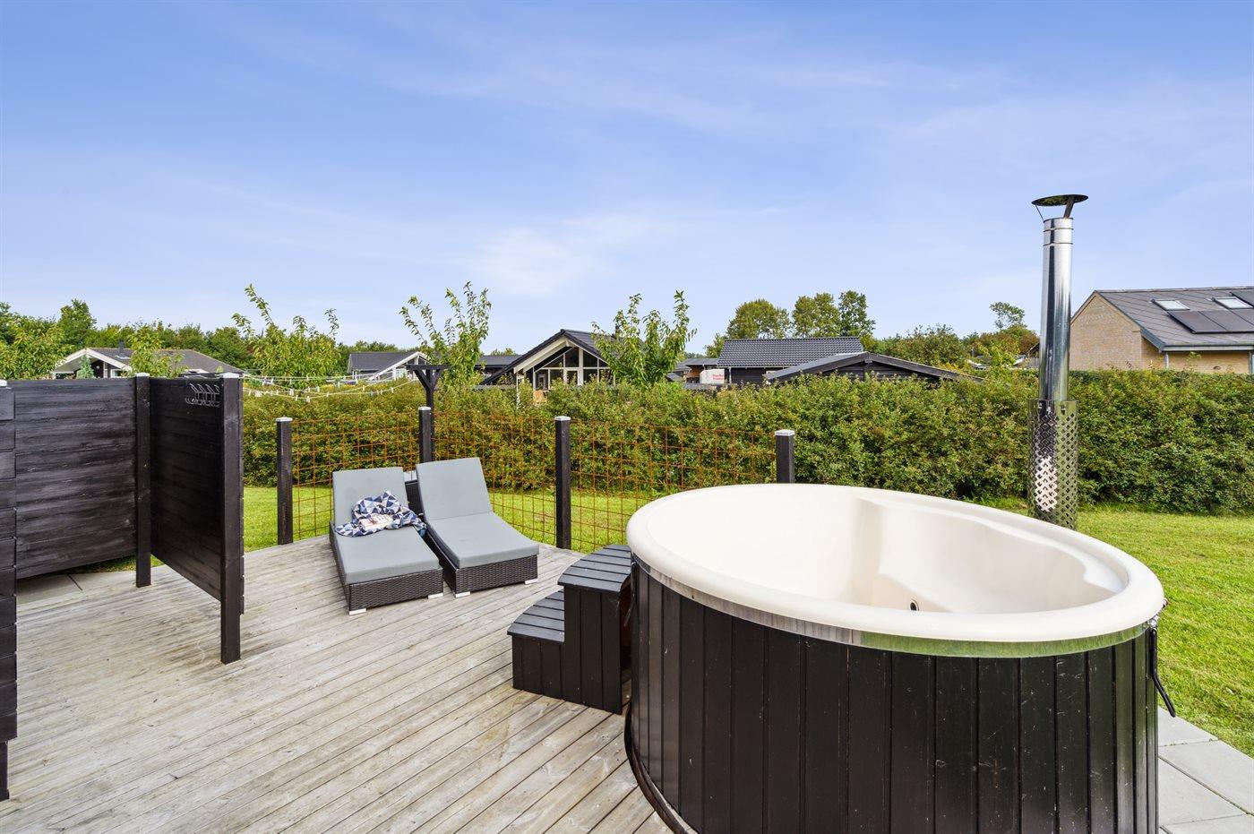 Moderne sommerhus fra 2022 nær Skovmose med spa, aktivitetsrum og stor naturgrund.