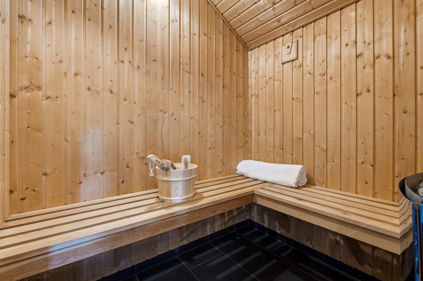 Der er 2 badeværelser med bruseniche og 2 toiletter. Der er gulvvarme på 2 badeværelser. I saunaen er der mulighed for afslapning.