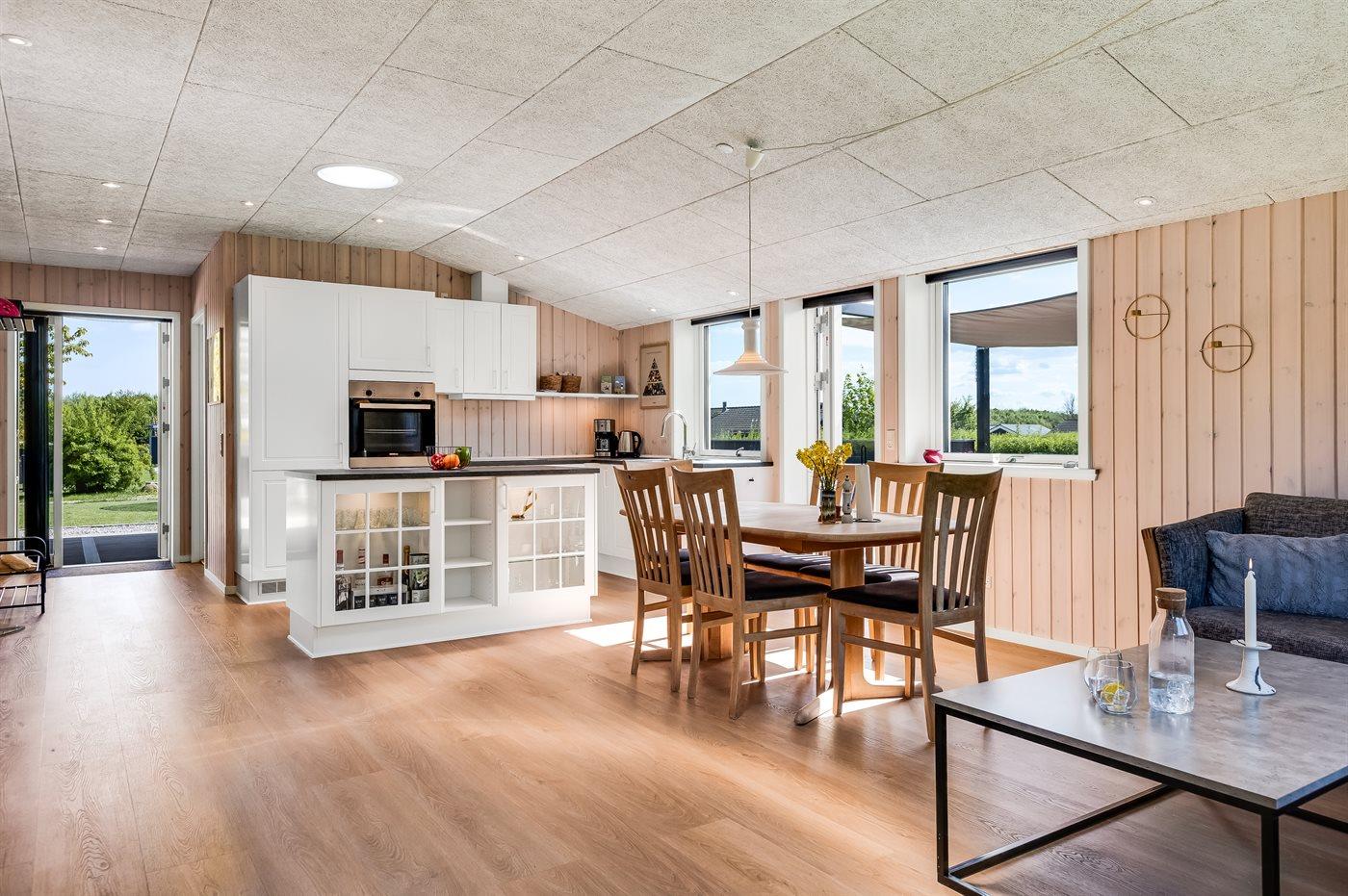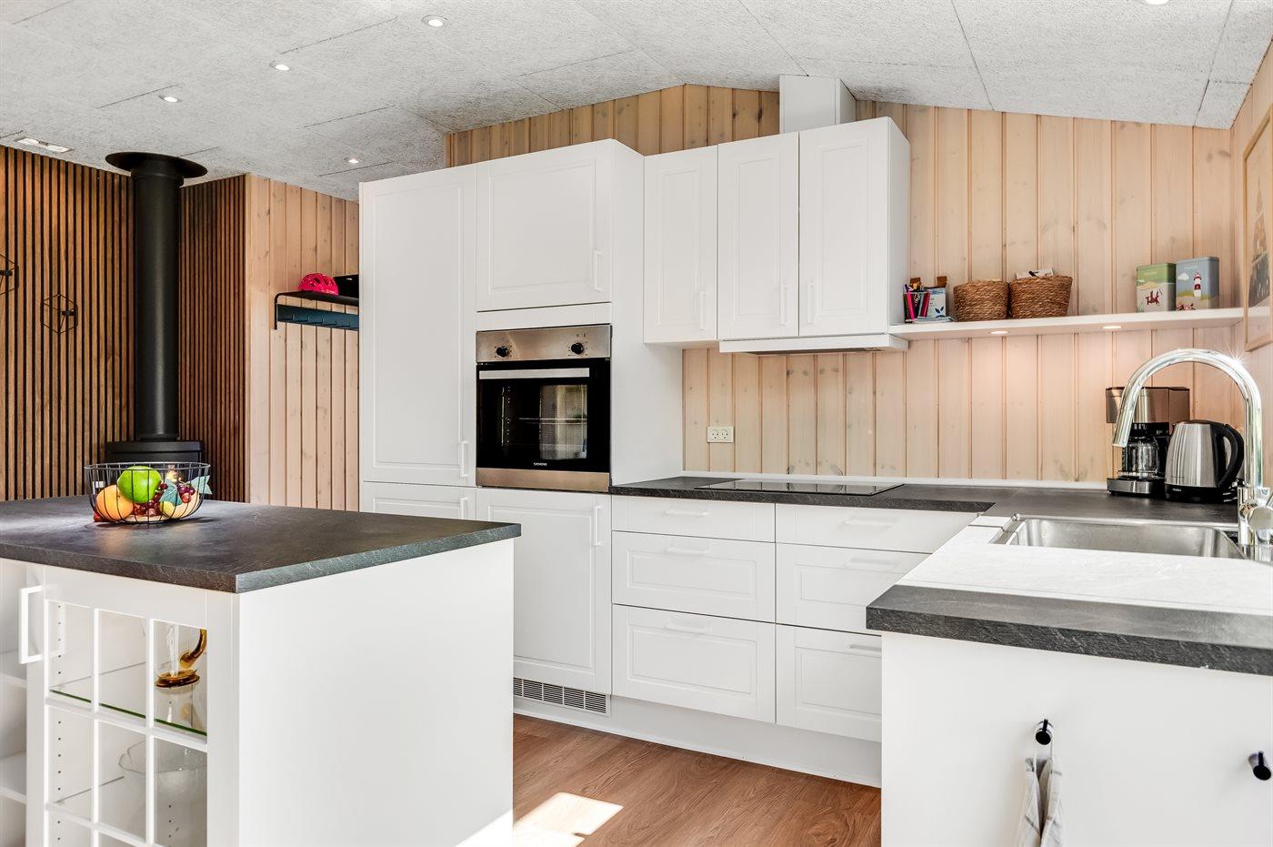 Køkkenet er udstyret med 1 køleskab. Der er 4 induktionskogeplader, varmluftovn, mikrobølgeovn samt opvaskemaskine.